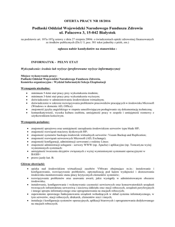 OFERTA PRACY NR 18/2016 Podlaski Oddział Wojewódzki Narodowego Funduszu Zdrowia ul. Pałacowa 3, 15-042 Białystok na podstawie art. 107a-107g ustawy z dnia 27 sierpnia 2004r. o świadczeniach opieki zdrowotnej finansowanych ze środków publicznych (Dz.U 5, poz. 581 tekst jednolity z późń, zm.) ogłasza nabór kandydatów na stanowisko : INFORMATYK - PEŁNY ETAT Wykształcenie: średnie lub wyższe (preferowane wyższe informatyczne) Miejsce wykonywania pracy: Podlaski Oddział Wojewódzki Narodowego Funduszu Zdrowia, Komórka organizacyjna : Wydział Informatyki Sekcja Eksploatacji Wymagania niezbędne: minimum 5-letni staż pracy przy wykształceniu średnim; minimum 3-letni staż pracy przy wykształceniu wyższym; doświadczenie w administrowaniu środowiskiem wirtualnym; doświadczenie w zakresie rozwiązywania problemów pracowników pracujących w środowisku Microsoft (Windows w domenie AD, Office): znajomość języka angielskiego w stopniu umożliwiającym posługiwanie się dokumentacją techniczną; komunikatywność, wysoka kultura osobista, umiejętność pracy w zespole i umiejętność rozmowy z użytkownikiem końcowym. Wymagania pożądane: znajomość sprzętowa oraz umiejętność zarządzania środowiskiem serwerów typu blade HP; znajomość rozwiązań macierzy dyskowych HP; znajomość systemów backupu środowisk wirtualnych serwerów: Veeam Backup and Replication; znajomość rozwiązań serwerowych Microsoft (AD, Exchange); znajomość konfiguracji, administracji serwerami z rodziny Linux: znajomość administracji usługami - serwery WWW (np. Apache) i aplikacyjne (np. Tomcat),na wyżej wymienionych systemach: umiejętność tworzenia skryptów związanych z wyżej wymienionymi systemami operacyjnymi w BASH< prawo jazdy kat. B. Główne obowiązki: opieka nad środowiskiem wirtualizacji zasobów VMware obejmujące m.in.: instalowanie i konfigurowanie, rozwiązywanie problemów, optymalizację pod kątem wydajności i dostosowania środowiska monitorowanie stanu pracy krytycznych elementów systemów; rozwiązywanie problemów oraz usuwanie awarii, jakie wystąpiły w administrowanym obszarze środowiska; instalowanie, konfigurowanie i wykonywanie czynności serwisowych oraz konserwatorskich urządzeń tworzących infrastrukturę serwerową i sieciową oddziału oraz stacji roboczych, urządzeń peryferyjnych i innego sprzętu informatycznego oraz oprogramowania na stacjach roboczych; zapewnienie sprawnego funkcjonowania urządzeń wchodzących w skład systemu informatycznego, w tym serwerów, stacji roboczych, drukarek, elementów sieci i innych; instalacja i konfiguracja systemów operacyjnych, aplikacji biurowych i oprogramowania dedykowanego na stacjach roboczych; monitorowanie istotnych zdarzeń audytowych w systemie informatycznym ze względu na bezpieczeństwo systemu, wykrywanie awarii i sytuacji wymagających interwencji: realizacja zadań dot. operacyjnego bezpieczeństwa teleinformatycznego; współpraca z wykonawcami oraz użytkownikami oprogramowania; prowadzenie dokumentacji technicznej związanej z administrowanymi systemami; prowadzenie ewidencji sprzętu oraz innych elementów będących składnikami infrastruktury informatycznej; przygotowywanie wniosków na postępowania o zamówienia publiczne, udział w komisjach przetargowych oraz kontrola realizacji postępowania. Ponadto kandydaci do zatrudnienia powinni spełniać wymogi określone dla pracowników NFZ w art. 112 ustawy z dnia 27 sierpnia 2004 r. o świadczeniach opieki zdrowotnej finansowanych ze środków publicznych (Dz.U 5, poz. 581 tekst jednolity z późń, zm.). Wymagane dokumenty: 1. 2. kopie dokumentów potwierdzających wykształcenie i doświadczenie zawodowe, własnoręcznie podpisane list motywacyjny z numerem oferty i c.v., w którym należy zamieścić następującą klauzulę; "wyrażam zgodę na przetwarzanie danych osobowych zawartych w mojej ofercie pracy przez POW NFZ, dla potrzeb niezbędnych do procesu rekrutacji – zgodnie z ustawą z dnia 29.08.1997 o ochronie danych osobowych" (Dz.U.2016.922 – tekst jednolity.), Dokumenty aplikacyjne należy składać w zamkniętej kopercie z dopiskiem: OFERTA PRACY NR 18/2016 osobiście w Kancelarii Oddziału lub przesłać listownie w terminie do 29.11.2016 r. (decyduje data wpływu do Oddziału) na adres: Podlaski Oddział Wojewódzki Narodowego Funduszu Zdrowia, ul. Pałacowa 3, 15-042 Białystok). Informacje telefoniczne pod nr: (0-85) 745–95–74 Pozostałe informacje: Oferty z niepełnymi bądź niepodpisanymi dokumentami, niezgodne z wymogami zawartymi w ogłoszeniu oraz otrzymane po terminie nie będą rozpatrywane (liczy się data wpływu do Podlaskiego Oddziału Wojewódzkiego NFZ), Kandydaci zakwalifikowani zostaną powiadomieni o terminie rozmowy wstępnej, Zgodnie z art. 107d oraz 107f ustawy z dnia 27 sierpnia 2004 r. o świadczeniach opieki zdrowotnej finansowanych ze środków publicznych listę kandydatów spełniających wymogi formalne określone w ogłoszeniu o naborze oraz wynik naboru ogłasza się w Biuletynie Informacji Publicznej na stronie :www. nfz-bialystok.pl oraz na tablicy ogłoszeń Podlaskiego Oddziału Wojewódzkiego Narodowego Funduszu Zdrowia, Oferty osób, które nie zostały wybrane na dane stanowisko w procesie rekrutacji, zostaną komisyjnie zniszczone, Dyrektor Oddziału zastrzega sobie prawo do odwołania postępowania rekrutacyjnego w każdym czasie, bez podania przyczyny.