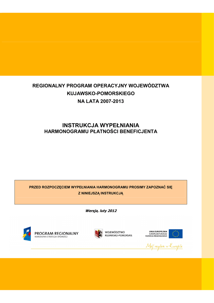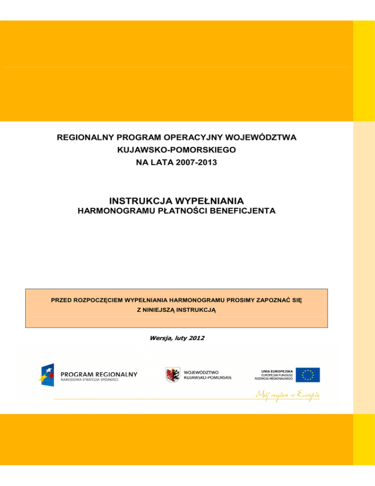 REGIONALNY PROGRAM OPERACYJNY WOJEWÓDZTWA KUJAWSKO-POMORSKIEGO NA LATA 2007-2013 INSTRUKCJA WYPEŁNIANIA HARMONOGRAMU PŁATNOŚCI BENEFICJENTA PRZED ROZPOCZĘCIEM WYPEŁNIANIA HARMONOGRAMU PROSIMY ZAPOZNAĆ SIĘ Z NINIEJSZĄ INSTRUKCJĄ Wersja, luty 2012 1 Harmonogram płatności Beneficjenta stanowi dla Instytucji Zarządzającej niezbędne narzędzie pozwalające na wypełnienie obowiązków wynikających z art. 60 lit. c Rozporządzenia Rady (WE) 1083/2006 z dnia 11 lipca 2006 ustanawiającego przepisy ogólne dotyczące Europejskiego Funduszu Rozwoju Regionalnego, Europejskiego Funduszu Społecznego oraz Funduszu Spójności i uchylającego rozporządzenie (WE) nr 1260/1999, dotyczących gromadzenia danych dla zarządzania finansowego Programem. Wypełnienie Harmonogramu jest obowiązkiem kaŜdego z Beneficjentów, który wynika z § 5 ust 3 i 4 umowy o dofinansowanie zawartej z Instytucją Zarządzającą. W przypadku uporczywego uchylania się Beneficjenta od wypełniania obowiązku przekazywania Harmonogramu Instytucja Zarządzająca moŜe zgodnie z § 18 ust. 1 pkt. 10 umowy o dofinansowanie rozwiązać ją z jednomiesięcznym okresem wypowiedzenia. 2 I. Warunki techniczne: 1. Wzór Harmonogramu płatności przygotowany został w programie MS Excel i przeszedł testy zgodności na komputerach wyposaŜonych w pakiet MS Office 2003 oraz 2007. 2. Pliki edytowane oraz zapisywane za pośrednictwem innych pakietów lub programów (np. MS Office 2010, Open Office, Gnumeric, Kyplot itp.) mogą powodować występowanie błędów, a co za tym idzie niezgodnie z niniejszą instrukcją przygotowanie Harmonogramów. 3. W przypadku wystąpienia błędów podczas uŜytkowania Harmonogramu, Beneficjent jest proszony o ich zgłaszanie na adres mailowy słuŜący przekazywaniu harmonogramów wraz z tytułem wiadomości „ZGŁOSZENIE BŁĘDU” oraz opisem wersji systemu operacyjnego oraz wersji pakietu MS Office będącego w posiadaniu beneficjenta, a takŜe moŜliwie najbardziej szczegółowej informacji odnośnie rodzaju błędu i okoliczności jego wystąpienia. 4. Plik naleŜy bezwarunkowo uruchomić w trybie z obsługą makr: i. MS Office 2003 – naleŜy wejść w zakładkę Narzędzia/Makro/Zabezpieczenia i ustawić poziom zabezpieczeń na średni lub niski, nacisnąć „OK”, a następnie zamknąć plik i uruchomić ponownie. W przypadku średniego program po włączeniu pliku pozwoli uŜytkownikowi zdecydować czy uruchomić makro czy teŜ nie uruchamiać, natomiast po uruchomieniu makra przy niskim poziomie zabezpieczeń makra zostaną włączone automatycznie. ii. MS Office 2007 – naleŜy nacisnąć przycisk pakietu Office w lewym górnym rogu, następnie Opcje programu Excel na dole ramki po prawej stronie, następnie Centrum Zaufania po lewej stronie, Ustawienia Centrum Zaufania, Ustawienia makr i zaznaczyć jedną z dwóch opcji: 1. Wyłącz makra i wyświetl powiadomienie 2. Włącz wszystkie makra Następnie naleŜy przycisnąć „OK” i zamknąć program Excel po czym ponownie uruchomić plik Harmonogramu. Po ponownym otwarciu w 3 zaleŜności od zaznaczonej opcji program odpowiednio: wyświetli informację o zablokowanym makrze i pozwoli na jego odblokowaniu lub uruchomi makra automatycznie. II. Składanie Harmonogramu płatności: 1. Harmonogram płatności naleŜy przedkładać obowiązkowo, w trybie comiesięcznym, począwszy od miesiąca w którym podpisano Umowę o dofinansowanie, aŜ do chwili zrealizowania wniosku o płatność końcową. 2. Beneficjent przekazuje do Instytucji Zarządzającej Harmonogram w wersji elektronicznej i papierowej do 10 dnia miesiąca kalendarzowego. 3. JeŜeli 10 dzień miesiąca wypada w dzień wolny terminem przekazania automatycznie staje się pierwszy dzień roboczy następujący po dniu wolnym. 4. Przekazanie Harmonogramu w wersji elektronicznej następuje na skrzynkę mailową [email protected]. 5. Za dotrzymanie terminu uznaje się wpływ dokumentu w wersji elektronicznej na skrzynkę mailową [email protected]. 6. W przypadku, braku adresu internetowego, Beneficjent ma moŜliwość przekazania do Instytucji Zarządzającej dokumentu w wersji elektronicznej na dowolnym nośniku danych bezpośrednio do sekretariatu Departamentu WdraŜania RPO przy ulicy Marii Skłodowskiej – Curie 73, 87-100 Toruń. 7. W przypadku, gdy beneficjent nie posiada pakietu MS Office (2003 lub 2007) istnieje moŜliwość sporządzenia wersji elektronicznej Harmonogramu w punkcie konsultacyjnym lub informacyjnym Urzędu Marszałkowskiego Województwa Kujawsko – Pomorskiego po uprzednim uzgodnieniu terminu. 8. Wersja papierowa musi być zaparafowana u dołu Harmonogramu wraz z pieczątką imienną Beneficjenta lub podpisana czytelnie. 9. Wersja papierowa jest dostarczana niezwłocznie po przekazaniu wersji elektronicznej, jednak nie później niŜ w terminie uzasadnionym obiegiem poczty tradycyjnej lub osobiście do Kancelarii Urzędu Marszałkowskiego Województwa 4 Kujawsko – Pomorskiego, ul. Plac Teatralny 2, 87-100 Toruń w godzinach pracy Urzędu. III. Wypełnienie Harmonogramu 1. Beneficjent pobiera co miesiąc nowy wzór Harmonogramu ze strony www.mojregion.eu (z górnego menu REGIONALNY PROGRAM OPERACYJNY, zakładka WaŜne dokumenty, następnie Harmonogramy płatności). 2. Harmonogram zawiera dane aktualizowane w interwałach miesięcznych na podstawie aneksów do umów o dofinansowanie. 3. Zamieszczenie Harmonogramu na stronie Instytucji Zarządzającej następuje co miesiąc 6 dnia kaŜdego miesiąca. 4. Dla ułatwienia zidentyfikowania aktualnej wersji Harmonogramu będzie on zamieszczany z dopiskiem HARMONOGRAM – „MIESIĄC”. 5. Beneficjent wypełnia wyłącznie pola o kolorze białym. Pozostałe pola wypełniają się automatycznie. 6. W pierwszej kolejności beneficjent wybiera z listy rozwijalnej numer projektu, którego jest beneficjentem. Pola: Data podpisania umowy, Data planowanego zakończenia realizacji projektu, Nazwa Bene