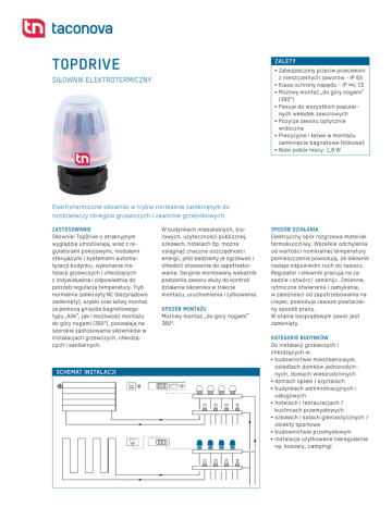TOPDRIVE ZALETY ■■ SIŁOWNIK ELEKTROTERMICZNY ■■ ■■ ■■ ■■ ■■ ■■ Zabezpieczony przeciw przeciekom z nieszczelnych zaworów - IP 65 Klasa ochrony napędu - IP 44, CE Możliwy montaż „do góry nogami” (360°) Pasuje do wszystkich popular nych wkładek zaworowych Pozycja zaworu optycznie widoczna Precyzyjne i łatwe w montażu zamknięcie bagnetowe (klikowe) Niski pobór mocy: 1,8 W Elektrotermiczne siłowniki w trybie normalnie zamkniętym do rozdzielaczy obiegów grzewczych i zaworów grzejnikowych. ZASTOSOWANIE Siłowniki TopDrive o atrakcyjnym wyglądzie umożliwiają, wraz z re gulatorami pokojowymi, modułami sterującymi i systemami automatyzacji budynku, wykonanie instalacji grzewczych i chłodzących z indywidualną i odpowiednią do potrzeb regulacją temperatury. Tryb normalnie zamknięty NC (bezprądowo zamknięty), szybki oraz łatwy montaż za pomocą gniazda bagnetowego typu „Klik“, jak i możliwość montażu do góry nogami (360°), pozwalają na szerokie zastosowanie siłowników w instalacjach grzewczych, chłodzą cych i sanitarnych. W budynkach mieszkalnych, biu rowych, użyteczności publicznej, szkołach, hotelach itp. można osiągnąć znaczne oszczędności energii, jeśli będziemy je ogrzewać i chłodzić stosownie do zapotrzebo wania. Seryjnie montowany wskaźnik położenia zaworu służy do kontroli działania siłownika w trakcie montażu, uruchomienia i żytkowania. SPOSÓB MONTAŻU Możliwy montaż „do gory nogami” 360°. SPOSÓB DZIAŁANIA Elektryczny opór rozgrzewa materiał termokurczliwy. Wszelkie odchylenia od wartości nominalnej temperatury pomieszczenia powodują, że siłownik nadaje odpowiedni ruch do zaworu. Regulator i siłownik pracują na za sadzie <otwórz/ zamknij>. Zmienne, rytmiczne otwieranie i zamykanie, w zależności od zapotrzebowania na ciepło, powoduje zawsze powtarzal ny sposób pracy. W stanie bezprądowym zawór jest zamknięty. KATEGORIE BUDYNKÓW Do instalacji grzewczych i chłodzących w: budownictwie mieszkaniowym, osiedlach domków jednorodzinnych, domach wielorodzinnych domach opieki i szpitalach budynkach administracyjnych i usługowych hotelach i restauracjach / kuchniach przemysłowych szkołach i salach gimnastycznych / obiekty sportowe budownictwie przemysłowym instalacje użytkowane nieregularnie np. koszary, campingi ■■ SCHEMAT INSTALACJI ■■ ■■ ■■ ■■ ■■ ■■ TOPDRIVE | SIŁOWNIK ELEKTROTERMICZNY TEKST OGŁOSZENIA Patrz www.taconova.com DANE TECHNICZNE Ogólne Tryb: normalnie zamknięty NC Temperatura otoczenia: 0...60°C Czas otwarcia /zamknięcia: ok. 3 min Skok nominalny: 4 mm Siła nominalna zamknięcia: 100 N +/7% Rodzaj ochrony: IP 44 Elektryczna klasa ochrony II Dane elektryczne Napięcie pracy (AC lub DC): 24 V lub 230 V Dopuszczalne odchylenie napięcia: +/-10 % Pobór mocy: 1,8 W Prąd rozruchowy: 24V: 0.2 A przez maks. 1 min 230V: 0.6 A przez maks. 100 Zalecane bezpieczniki: 0,35 A, zgodne z DIN 41662 Długość kabla 1 m Rodzaj przewodu: 2 x 0,75 mm2, PVC ■■ ■■ ■■ DOSTĘPNE TYPY TopDrive | Siłownik Elektrotermiczny, Tryb NC (Normalnie zamknięty/ bezprądowo zamknięty) Nr katalogowy 230 V Mocowanie 257.2055.000 M30 × 1,5 257.2058.000 M28 × 1,5 257.2062.000 M30 × 1,5 257.2064.000 257.2080.000 Adapter M30 × 1,5 TacoSys/Heimeier/Strawa/Empur Mosiądz/ Oventrop/Delphistherm/Emmeti/Schlösser/ Beulco/AC-FIX/Stramax/Roth/IVR Herz (RV 57) MNG/Cazzaniga/SBK/Empur-Stal nierdzewna/ Zawór SKV przedni Giacomini Viega Nr katalogowy 24 V Mocowanie Pasujący do wkładki zaworowej* 257.1055.000 M30 × 1,5 257.1058.000 M28 × 1,5 257.1062.000 M30 × 1,5 257.1064.000 257.1080.000 Adapter M30 × 1,5 ■■ ■■ ■■ ■■ ■■ ■■ ■■ ■■ ■■ ■■ ■■ ■■ ■■ DOPUSZCZENIA Dane techniczne zgodne z obowiązującymi normami EN. Produkt posiada znak zgodności CE. ■■ WYMIARY Ø 44 70 AKCESORIA Różne termostat pokojowe i moduły sterujące do połączenia przewodowego i bezprzewodowego (patrz oddzielna karta katalogowa). ZAOSZCZĘDŹ ENERGIĘ I PIENIĄDZE! By zapobiec niepotrzebnej pracy układu, poza sezonem grzewczym siłownik powinien zostać wyłączony za pomocą termostatu pokojowego. TacoSys/Heimeier/Strawa/Empur Mosiądz/ Oventrop/Delphistherm/Emmeti/Schlösser/ Beulco/AC-FIX/Stramax/Roth/IVR Herz (RV 57) MNG/Cazzaniga/SBK/Empur-Stal nierdzewna/ Zawór SKV przedni Giacomini Viega * Inne niestandardowe wykonania do innych typów zaworów na zapytanie. W przypadku wątpliwości prosimy o kontakt z działem obsługi klienta. ■■ WSKAZÓWKA JAK OSZCZĘDZAĆ Pasujący do wkładki zaworowej* TOPDRIVE | SIŁOWNIK ELEKTROTERMICZNY POZYCJE ZAWORU Zawór zamknięty (bezprądowo) Zawór otwarty (włączone zasilanie) 1 1 1 Dzięki formowanej uszczelce zabezpieczony przeciw przeciekom wody ZAMKNIĘCIE BAGNETOWE Połączenie bagnetowe z 4 dużymi, zachodzącymi na siebie powierzchniami styku tulei i nakrętki. 1 2 3 4 1 4 Tuleja bagnetowa Nakrętka bagnetowa Duża powierzchnia styku Obracać do usłyszenia kliknięcia 3 2 WYKRES PRACY NC Włączone zasilanie Zwłoka Wyłączone zasilanie Stygnięcie 4 3 Skok 1 2 3 4 2 1 0 2 Zastrzega się możliwość zmian. 03/2015 1 KONTAKT I DALSZE INFORMACJE Taconova GmbH | Biuro Polska | Rudolf-Diesel-Straße 8 | DE-78224 Singen T +48 570566200 | F +49 7731 98 28 88 | [email protected] | taconova.com 4 Czas 3 TACONOVA.COM