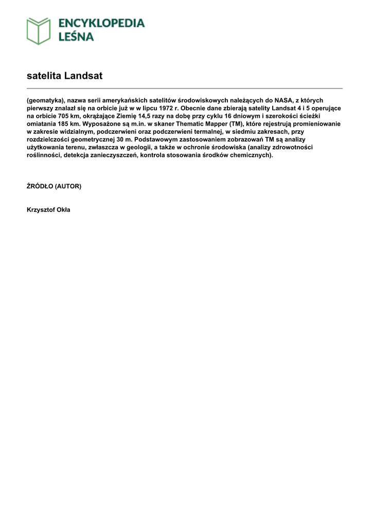 satelita Landsat (geomatyka), nazwa serii amerykańskich satelitów środowiskowych należących do NASA, z których pierwszy znalazł się na orbicie już w w lipcu 1972 r. Obecnie dane zbierają satelity Landsat 4 i 5 operujące na orbicie 705 km, okrążające Ziemię 14,5 razy na dobę przy cyklu 16 dniowym i szerokości ścieżki omiatania 185 km. Wyposażone są m.in. w skaner Thematic Mapper (TM), które rejestrują promieniowanie w zakresie widzialnym, podczerwieni oraz podczerwieni termalnej, w siedmiu zakresach, przy rozdzielczości geometrycznej 30 m. Podstawowym zastosowaniem zobrazowań TM są analizy użytkowania terenu, zwłaszcza w geologii, a także w ochronie środowiska (analizy zdrowotności roślinności, detekcja zanieczyszczeń, kontrola stosowania środków chemicznych). ŹRÓDŁO (AUTOR) Krzysztof Okła