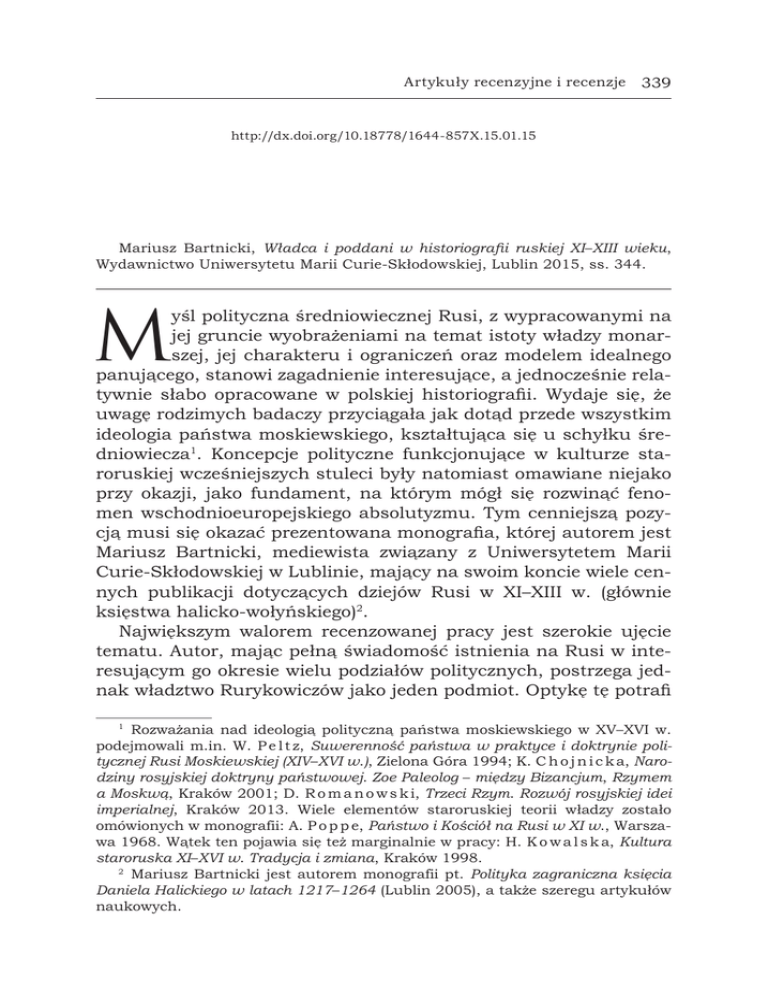 Artykuły recenzyjne i recenzje 339 http://dx.doi.org/10.18778/1644-857X.15.01.15 Mariusz Bartnicki, Władca i poddani w historiografii ruskiej XI–XIII wieku, Wydawnictwo Uniwersytetu Marii Curie-Skłodowskiej, Lublin 2015, ss. 344. M yśl polityczna średniowiecznej Rusi, z wypracowanymi na jej gruncie wyobrażeniami na temat istoty władzy monarszej, jej charakteru i ograniczeń oraz modelem idealnego panującego, stanowi zagadnienie interesujące, a jednocześnie relatywnie słabo opracowane w polskiej historiografii. Wydaje się, że uwagę rodzimych badaczy przyciągała jak dotąd przede wszystkim ideologia państwa moskiewskiego, kształtująca się u schyłku średniowiecza1. Koncepcje polityczne funkcjonujące w kulturze staroruskiej wcześniejszych stuleci były natomiast omawiane niejako przy okazji, jako fundament, na którym mógł się rozwinąć fenomen wschodnioeuropejskiego absolutyzmu. Tym cenniejszą pozycją musi się okazać prezentowana monografia, której autorem jest Mariusz Bartnicki, mediewista związany z Uniwersytetem Marii Curie-Skłodowskiej w Lublinie, mający na swoim koncie wiele cennych publikacji dotyczących dziejów Rusi w XI–XIII w. (głównie księstwa halicko-wołyńskiego)2. Największym walorem recenzowanej pracy jest szerokie ujęcie tematu. Autor, mając pełną świadomość istnienia na Rusi w interesującym go okresie wielu podziałów politycznych, postrzega jednak władztwo Rurykowiczów jako jeden podmiot. Optykę tę potrafi Rozważania nad ideologią polityczną państwa moskiewskiego w XV–XVI w. podejmowali m.in. W. P e l t z, Suwerenność państwa w praktyce i doktrynie politycznej Rusi Moskiewskiej (XIV–XVI w.), Zielona Góra 1994; K. C h o j n i c k a, Narodziny rosyjskiej doktryny państwowej. Zoe Paleolog – między Bizancjum, Rzymem a Moskwą, Kraków 2001; D. R o m a n o w s k i, Trzeci Rzym. Rozwój rosyjskiej idei imperialnej, Kraków 2013. Wiele elementów staroruskiej teorii władzy zostało omówionych w monografii: A. P o p p e, Państwo i Kościół na Rusi w XI w., Warszawa 1968. Wątek ten pojawia się też marginalnie w pracy: H. K o w a l s k a, Kultura staroruska XI–XVI w. Tradycja i zmiana, Kraków 1998. 2 Mariusz Bartnicki jest autorem monografii pt. Polityka zagraniczna księcia Daniela Halickiego w latach 1217–1264 (Lublin 2005), a także szeregu artykułów naukowych. 1 340 Artykuły recenzyjne i recenzje konsekwentnie zachować w toku narracji. W efekcie, choć specyfika wykorzystywanego materiału źródłowego (latopisów) sprawia, że większość przytaczanych w monografii przykładów dotyczy dziejów ziemi kijowskiej, nowogrodzkiej, halickiej czy połockiej, to formułowane na bazie tej analizy wnioski odnoszą się zawsze do modelu władzy, funkcjonującego – zdaniem badacza – we wszystkich księstwach ruskich. Trafnie zostały też nakreślone ramy chronologiczne studium. Autor, zdając sobie sprawę z dyskusyjności tezy o wpływie „testamentu” Jarosława Mądrego na ustrój Rusi (s. 62), nie uznaje – jak to bywało w starszej literaturze przedmiotu – daty śmierci tego władcy za cezurę mającą odgraniczać okres istnienia scentralizowanej państwowości ruskiej od epoki politycznego rozdrobnienia. Swe rozważania koncentruje na całej epoce przedmongolskiej (XI– XIII w.), słusznie zakładając, że dopiero najazd wspomnianych stepowców wytworzył na obszarze Słowiańszczyzny Wschodniej nowe realia polityczno-ustrojowe. Przyjęcie za cezurę początkową XI stulecia wynika natomiast z bardzo cennego spostrzeżenia, że autorzy źródeł narracyjnych z analizowanego obszaru – latopisów oraz innych zabytków staroruskiego piśmiennictwa – konstruując na swój sposób literacką wizję wydarzeń z najwcześniejszego okresu istnienia państwa Rurykowiczów, sytuowali je zazwyczaj w późniejszych realiach kulturowych, właściwych dla epoki, w której żyli. W konsekwencji więc np. Powieść minionych lat, zawierająca sporo wielowymiarowych portretów władców z X stulecia (m.in. księżnej Olgi i jej wnuka Włodzimierza), może de facto stanowić źródło do badań nad wyobrażeniami na temat istoty władzy monarszej, rozpowszechnionymi na Rusi na początku wieku XII. Autor oparł swoje studium na dość szerokiej bazie źródłowej. Chociaż w teorii jego badania koncentrować się miały na wizji staroruskich książąt i ich relacji z poddanymi, wyłaniającej się z przekazów o charakterze historiograficznym (latopisów), to wywód został wzbogacony o analizę tekstów reprezentujących inne gatunki literackie, m.in. Słowa o prawie i łasce metropolity kijowskiego Hilariona, Pouczenia Włodzimierza II Monomacha, najstarszych utworów hagiograficznych dedykowanych ruskim świętym książętom, zabytków średniowiecznej homiletyki i epistolografii. Mariusz Bartnicki wykorzystał również wyniki badań archeologicznych, a także źródła numizmatyczne i ikonograficzne. Artykuły recenzyjne i recenzje 341 Monografia składa się z trzech rozdziałów, prezentujących materiał w ujęciu problemowym. W pierwszym z nich ukazane zostały mechanizmy legitymizujące władzę ruskich książąt. Autor omówił tu więc zagadnienie tradycji dynastycznej Rurykowiczów, podjął próbę udzielenia odpowiedzi na pytanie, czy na interesującym go obszarze w XI–XIII w. istniały prawne i zwyczajowe normy regulujące kwestie następstwa tronu i porządku dziedziczenia władzy. Przeanalizowane zostały także te formy obejmowania rządów, które zakładały mniej lub bardziej aktywny udział poddanych (wybór monarchy przez mieszkańców grodu). Odtwarzając ceremoniał towarzyszący wstępowaniu na tron ruskich książąt, Mariusz Bartnicki przedstawił też pokrótce wypracowany przez Rurykowiczów system autoprezentacji panującego: insygnia, strój, oficjalny wizerunek. W tym miejscu warto odnotować, że zagadnienie to, znajdujące się w polu zainteresowania A