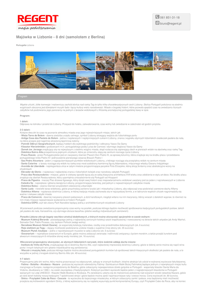 061 851-31-18 [email protected] Majówka w Lizbonie - 8 dni (samolotem z Berlina) Portugalia Lizbona Program Wąskie uliczki, żółte tramwaje i malowniczy zachód słońca nad rzeką Tag to tylko kilka charakterystycznych cech Lizbony. Stolica Portugalii położona na siedmiu wzgórzach otoczona jest dźwiękami muzyki fado i łączy kultury wielu narodowości. Miasto o bogatej historii, które pozwala spędzić czas na zwiedzaniu licznych zabytków lub podziwianiu jego panoramy na jednym z tarasów widokowych z filiżanką aromatycznej portugalskiej kawy w ręce. Program: 1 dzień: Odprawa na lotnisku i przelot do Lizbony. Przejazd do hotelu, zakwaterowanie, czas wolny lub zwiedzanie w zależności od godzin przylotu. 2-3 dzień: Kolejne dwa dni to czas na poznanie atmosfery miasta oraz jego najważniejszych miejsc, takich jak - Wieża Torre de Belem - dawna siedziba urzędu celnego, symbol Lizbony strzegący wejścia do lizbońskiego portu - Antiga Casa dos Pasteis de Belem - jedna z najstarszych i najsłynniejszych cukierni Lizbony, znana z wypieku słynnych lizbońskich ciasteczek pasteis da nata, na które przepis jest najpilniej strzeżoną tajemnicą rodziny - Pomnik Odkryć Geograficznych, będący hołdem dla wybitnego podróżnika i odkrywcy Vasco Da Gamy - Klasztor Hieronimitów z grobowcami m.in. portugalskiego poety Luisa de Camoes i słynnego żeglarza Vasco da Gamy - Zamek św. Jerzego znajdujący się na najwyższym z siedmiu wzgórz miasta, skąd roztacza się zapierający dech w piersiach widok na starówkę oraz rzekę Tag - Dzielnica Bairro Alto przepełniona pięknymi uliczkami, które po zmierzchu stają się centrum nocnego życia Lizbony - Praca Rossio - przez Portugalczyków jest on nazywany również Placem Don Pedro IV, za sprawą kolumny, która znajduje się na środku placu i przedstawia portugalskiego króla Pedro IV i jednocześnie pierwszego cesarza Brazylii Pedro I - Sao Pedro Alcantara - jeden z najpopularniejszych punktów widokowych Lizbony, z którego rozciąga się przepiękny widok na centrum miasta - Santa Catarina - z tarasu rozciąga się widok na rzekę oraz most ozdobiony kamienną figurą Adamastora, mitycznego władcy Oceanu Indyjskiego - Avenida da Liberdade - najelegantsza ulica w całym mieście przypominająca paryskie Pola Elizejskie, którą stroją fontanny oraz abstrakcyjne wzory na chodnikach - Elevador da Gloria – najstarsza i najbardziej znana z lizbońskich kolejek oraz narodowy zabytek Portugalii - Praca dos Restauradores - miejsce, gdzie w ciekawy sposób łączą się ze sobą klasyczna architektura XVII wieku oraz zdobienia w stylu art deco. Na środku placu znajduje się obelisk Restauradores, który upamiętnia uniezależnienie się Portugalii od Hiszpanii - Praca da Figueira - inaczej Plac drzewa figowego, który dzięki swej historii oraz niepowtarzalnemu widokowi uważany jest za jeden z najciekawszych w Lizbonie - Katedra Se - największa i główna świątynia Lizbony, przypominająca twierdzę, jest jednym z najważniejszych zabytków miasta - Dzielnica Baixa – zwana również arcydziełem oświeconej urbanistyki - Santa Luzia - niewielki taras widokowy, gdzie przychodzą zarówno turyści jak i mieszkańcy Lizbony, aby odpocząć oraz podziwiać czerwone dachy Alfamy - Dzielnica Alfama - najstarsza dzielnica Lizbony, w której tradycja miasta zachowała się w najczystszej formie, a w labiryncie wąskich uliczek nagromadziły się ważne i ciekawe zabytki miasta - Praca do Comercio - dawniej nazywany placem pałacowym, a dziś handlowym, niegdyś witano na nim marynarzy, którzy wracali z dalekich wypraw, to również na nim miały miejsce najważniejsze wydarzenia w historii Portugalii - Dzielnica EXPO, czyli tak zwany Park Narodów będący jedną z architektonicznych wizytówek Lizbony W przerwach podczas zwiedzania proponujemy czas wolny na posiłek, podczas którego będzie możliwość spróbowania tradycyjnych portugalskich potraw, takich jak pasteis de nata, franceshina, czy słynnego dorsza bacalhau (płatne według indywidualnych zamówień). Ponadto Lizbona oferuje bogaty wachlarz atrakcji dodatkowych, z których można skorzystać opcjonalnie w czasie wolnym: - Muzeum Kolekcji Berardo - posiadającego jedną z najbardziej cenionych kolekcji sztuki współczesnej i nowoczesnej na świecie takich artystów jak Andy Warhol, Salvador Dali, Pablo Picasso, czy Jackson Pollock (wstęp wolny) - Narodowe Muzeum Sztuki Dawnej - ze wspaniałą kolekcją malarstwa, rzeźby oraz przedmiotów dekoracyjnych (ok. 6 euro/os) - Rejs statkiem po Tagu – dający możliwość podziwiania uroków miasta z zupełnie innej strony (ok. 35 euro/os) - Muzeum Płytek Azulejos – jedno z najciekawszych muzeów w całej Lizbonie (ok. 5 euro/os) - Oceanarium – największe oceanarium w Europie, gdzie można zobaczyć zwierzęta i roślinność związaną z życiem morskim, a także przejść tunelem pod akwarium mieszczącym 8 miliardów słonej wody morskiej (ok. 16 euro/os) Wieczorami proponujemy skorzystać, ze słynnych lizbońskich rozrywek, które świetnie oddają ducha miasta: - Instituto do Vinho do Porto, znajdującego się w dzielnicy Barriro Alto, czyli najbardziej imprezowej dzielnicy Lizbony, gdzie w dobrej cenie można się napić wina porto i innych lokalnych win (płatne indywidualnie wg zamówienia) - Wieczór z muzyką fado, podczas którego będzie można skosztować portugalskich trunków lub spróbować takich klasycznych słodkości jak pasteis de nata, a to wszystko w jednej z knajpek dzielnicy Barriro Alto (ok. 49 euro/os) 4-7 dzień: Proponujemy jako dni wolne, który można przeznaczyć na odpoczynek, zakupy w znanych butikach, lokalne atrakcje lub udział w wybranej wycieczce fakultatywnej. - Fatima - Batalha - Alcobaca - Nazare - podczas tej wycieczki odwiedzimy Fatimę i Sanktuarium Matki Bożej Fatimskiej będące jednym z największych miejsc kultu maryjnego w Europie, następnie przejedziemy do