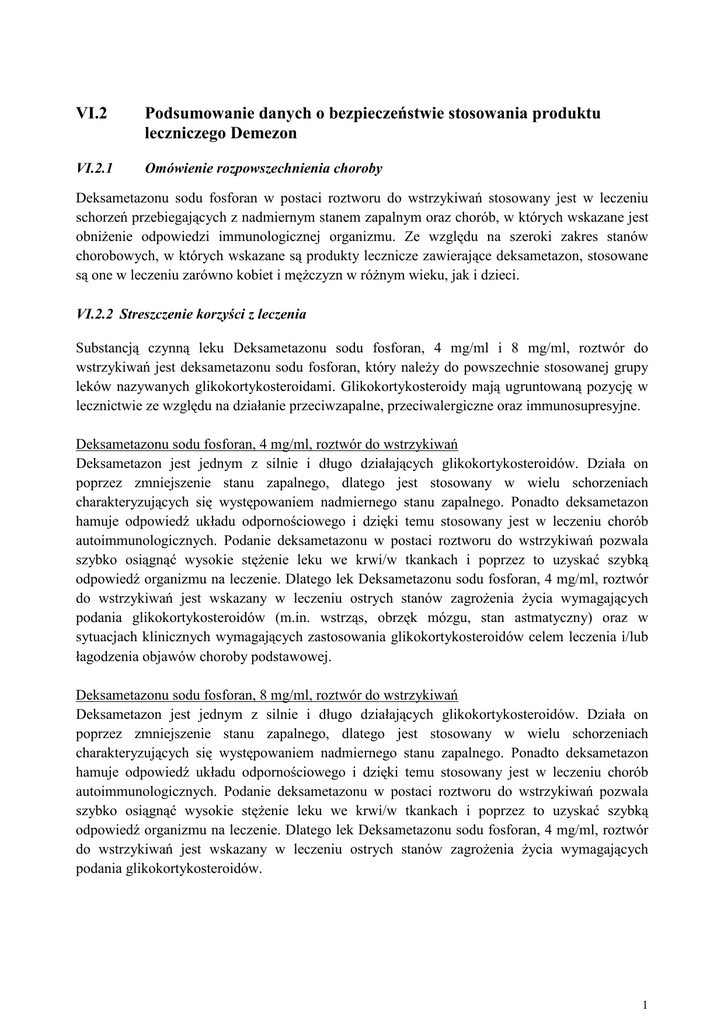 VI.2 Podsumowanie danych o bezpieczeństwie stosowania produktu leczniczego Demezon VI.2.1 Omówienie rozpowszechnienia choroby Deksametazonu sodu fosforan w postaci roztworu do wstrzykiwań stosowany jest w leczeniu schorzeń przebiegających z nadmiernym stanem zapalnym oraz chorób, w których wskazane jest obniżenie odpowiedzi immunologicznej organizmu. Ze względu na szeroki zakres stanów chorobowych, w których wskazane są produkty lecznicze zawierające deksametazon, stosowane są one w leczeniu zarówno kobiet i mężczyzn w różnym wieku, jak i dzieci. VI.2.2 Streszczenie korzyści z leczenia Substancją czynną leku Deksametazonu sodu fosforan, 4 mg/ml i 8 mg/ml, roztwór do wstrzykiwań jest deksametazonu sodu fosforan, który należy do powszechnie stosowanej grupy leków nazywanych glikokortykosteroidami. Glikokortykosteroidy mają ugruntowaną pozycję w lecznictwie ze względu na działanie przeciwzapalne, przeciwalergiczne oraz immunosupresyjne. Deksametazonu sodu fosforan, 4 mg/ml, roztwór do wstrzykiwań Deksametazon jest jednym z silnie i długo działających glikokortykosteroidów. Działa on poprzez zmniejszenie stanu zapalnego, dlatego jest stosowany w wielu schorzeniach charakteryzujących się występowaniem nadmiernego stanu zapalnego. Ponadto deksametazon hamuje odpowiedź układu odpornościowego i dzięki temu stosowany jest w leczeniu chorób autoimmunologicznych. Podanie deksametazonu w postaci roztworu do wstrzykiwań pozwala szybko osiągnąć wysokie stężenie leku we krwi/w tkankach i poprzez to uzyskać szybką odpowiedź organizmu na leczenie. Dlatego lek Deksametazonu sodu fosforan, 4 mg/ml, roztwór do wstrzykiwań jest wskazany w leczeniu ostrych stanów zagrożenia życia wymagających podania glikokortykosteroidów (m.in. wstrząs, obrzęk mózgu, stan astmatyczny) oraz w sytuacjach klinicznych wymagających zastosowania glikokortykosteroidów celem leczenia i/lub łagodzenia objawów choroby podstawowej. Deksametazonu sodu fosforan, 8 mg/ml, roztwór do wstrzykiwań Deksametazon jest jednym z silnie i długo działających glikokortykosteroidów. Działa on poprzez zmniejszenie stanu zapalnego, dlatego jest stosowany w wielu schorzeniach charakteryzujących się występowaniem nadmiernego stanu zapalnego. Ponadto deksametazon hamuje odpowiedź układu odpornościowego i dzięki temu stosowany jest w leczeniu chorób autoimmunologicznych. Podanie deksametazonu w postaci roztworu do wstrzykiwań pozwala szybko osiągnąć wysokie stężenie leku we krwi/w tkankach i poprzez to uzyskać szybką odpowiedź organizmu na leczenie. Dlatego lek Deksametazonu sodu fosforan, 4 mg/ml, roztwór do wstrzykiwań jest wskazany w leczeniu ostrych stanów zagrożenia życia wymagających podania glikokortykosteroidów. 1 VI.2.3 Dotychczas nieznane korzyści z leczenia Nie dotyczy VI.2.4 Streszczenie danych dotyczących bezpieczeństwa Istotne zidentyfikowane ryzyko Ryzyko Wiadomo, że... Możliwości zapobiegania Nadwrażliwość, reakcje anafilaktoidalne Po zastosowaniu tego leku może wystąpić nadwrażliwość. Lek nie powinien być stosowany, jeśli pacjent jest uczulony na deksametazonu sodu fosforan, glikokortykosteroidy lub na którykolwiek inny składnik tego leku. Osłabienie układu immunologicznego, maskowanie zakażeń, pojawienie się i zaostrzenie zakażeń wirusowych, pasożytniczych, oportunistycznych oraz grzybiczych Podczas stosowania glikokortykosteroidów dochodzi do zahamowania odpowiedzi przeciwzapalnej i funkcji układu odpornościowego, przez co zwiększa się podatność na zakażenia i ich nasilenie. Pacjenci z obniżoną odpornością, np. przyjmujący leki immunosupresyjne, są bardziej podatni na zakażenia niż osoby zdrowe. Dodatkowo glikokortykosteroidy mogą maskować pewne objawy zapalenia lub zakażeń. Zahamowanie czynności kory nadnerczy W trakcie długotrwałego stosowania glikokortykosteroidów rozwija się niewydolność kory nadnerczy, która może utrzymywać się przez dłuższy czas po zakończeniu leczenia. Po długotrwałym leczeniu odstawienie glikokortykosteroidów musi zawsze przebiegać stopniowo, aby uniknąć ostrej niewydolności kory nadnerczy. Nagłe przerwanie leczenia może prowadzić do wystąpienia ostrej niewydolności kory nadnerczy. Po długotrwałym leczeniu odstawienie kortykosteroidów musi zawsze przebiegać stopniowo, aby uniknąć ostrej niewydolności kory nadnerczy. Leki należące do grupy glikokortykosteroidów wywołują zależne Należy uważnie obserwować wzrost i Zahamowanie wzrostu Po pozajelitowym podaniu glikokortykosteroidów mogą czasami wystąpić ciężkie reakcje anafilaktoidalne, szczególnie u pacjentów z alergią w wywiadzie. Pacjent powinien poinformować lekarza o przebytych chorobach infekcyjnych, takich jak gruźlica lub niektóre choroby pasożytnicze. W czasie stosowania pacjent powinien unikać narażenia na choroby wirusowe (ospa, odra), szczególnie jeśli nie przebył ich w przeszłości. Pacjent nie powinien przerywać stosowania leku bez konsultacji z lekarzem. 2 Ryzyko Wiadomo, że... Możliwości zapobiegania od dawki zahamowanie wzrostu u niemowląt, dzieci i młodzieży. Wpływ ten może być nieodwracalny. Zaburzenia psychiczne Zerwanie ścięgna rozwój dzieci w trakcie długotrwałego stosowania glikokortykosteroidów. Podczas stosowania leków z grupy Pacjent powinien glikokortykosteroidów mogą wystąpić poinformować lekarza o zaburzenia psychiczne, takie jak euforia, występujących u niego w bezsenność, ciężka depresja, zmiany przeszłości lub nastroju i osobowości jak również objawy występujących u psychotyczne. Objawy zaburzeń członków jego psychicznych występują zwykle w ciągu najbliższej rodziny: kilku dni lub tygodni od rozpoczęcia chwiejności leczenia. Ryzyko ich wystąpienia może emocjonalnej, być większe przy stosowaniu dużych dawek oraz przy ogólnoustrojowym skłonnościach podawaniu glikokortykosteroidów. 