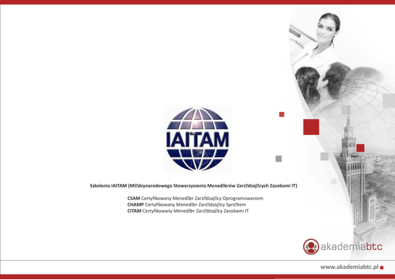 Szkolenia IAITAM (Międzynarodowego Stowarzyszenia Menedżerów Zarządzających Zasobami IT) CSAM Certyfikowany Menedżer Zarządzający Oprogramowaniem CHAMP Certyfikowany Menedżer Zarządzający Sprzętem CITAM Certyfikowany Menedżer Zarządzający Zasobami IT www.akademiabtc.pl Akademia BTC Szanowni Państwo, o Akademii BTC: Z ogromną przyjemnością pragnę poinformować Państwa o wyjątkowym osiągnięciu Akademii BTC, która jako jedyna instytucja szkoleniowa w Polsce, otrzymała prawo do przeprowadzania kursów prestiżowej amerykańskiej organizacji IAITAM (Międzynarodowego Stowarzyszenia Menedżerów Zarządzających Zasobami IT). DOŚWIADCZENIE 3400 przeszkolonych osób z ponad 1100 firm i instytucji 15 specjalistycznych tematów szkoleń Ogólnopolski zasięg Możliwość prowadzenia tych szkoleń oraz przyznawania certyfikatów IAITAM Grupa kapitałowa BTC, do której należy Akademia, otrzymała w październiku 2011 roku na mocy aliansu strategicznego, podpisanego podczas otwarcia Dorocznej Konferencji IAITAM w Las Vegas. Kursy IAITAM otwierają przed polskimi menedżerami zarządzającymi zasobami IT nowe perspektywy, wyposażają ich w wiedzę na temat najlepszych praktyk oraz znajomość najnowszych rozwiązań. Dają narzędzia do efektywnego zarządzania infrastrukturą informatyczną, które wpisane w strategię biznesową firm lub instytucji, generują spore oszczędności finansowe, przyczyniają się do wzrostu efektywności pracy w całej organizacji oraz stwarzają nowe możliwości rozwoju osobistego. CERTYFIKACJA Prestiżowe certyfikaty amerykańskiego stowarzyszenia IAITAM Certyfikaty Akademii BTC Certyfikaty Partnerów JAKOŚĆ Trenerzy - praktycy z wieloletnim doświadczeniem Partnerzy merytoryczni: Adobe, Autodesk, Corel, Dell, Kaspersky, IAITAM, Intel, Longhill, Maruta, Microsoft, Oracle Wysokie oceny Uczestników Serdecznie zachęcam osoby odpowiedzialne za zarządzanie zasobami IT w firmach i instytucjach do podnoszenia kwalifikacji zawodowych, potwierdzonych certyfikatem największych światowych autorytetów. Z wyrazami szacunku, Zespół Akademii BTC www.akademiabtc.pl Czym jest IAITAM? IAITAM (Międzynarodowe Stowarzyszenie Menadżerów Zarządzających Zasobami IT) – organizacja zrzeszająca specjalistów w obszarze zarządzania zasobami IT z blisko 40 krajów na całym świecie. IAITAM jest jednym z najważniejszych i najbardziej znaczących lobbystów na rynku IT. Dodatkowo w oparciu o dobre praktyki stowarzyszenia i jego członków powstają normy ISO oraz podstawowe standardy światowe dotyczące zarządzania infrastrukturą informatyczną. Ich tworzenie stoi u podstaw powstania IAITAM. Stowarzyszenie powołała do życia w 2002 roku grupa menadżerów odpowiedzialnych za oprogramowanie i sprzęt IT, którzy zauważyli potrzebę zbudowania scentralizowanej organizacji, zajmującej się rozwijaniem oraz obiektywizacją wiedzy w zakresie zarządzania zasobami IT. Prowadzone prace doprowadziły do określenia specyficznych potrzeb w nowo powstałym zawodzie menadżera zarządzającego infrastrukturą informatyczną, w tym opracowania programów szkoleniowych dla kadry zarządzającej oraz stworzenia obiektywnych norm i opinii dotyczących produktów na rynku IT, licencji na sprzęt i oprogramowanie. Edukacja IAITAM Szkolenia branżowe IAITAM Branżowe szkolenia oraz programy certyfikacji IAITAM zostały opracowane przez doświadczonych fachowców, w tym menedżerów zarządzających oprogramowaniem, sprzętem oraz pozostałymi zasobami informatycznymi na całym świecie. Przekazywana przez IAITAM wiedza z założenia jest praktyczna, obiektywna i profesjonalna, niezależna od opinii dostawców. IAITAM wspiera profesjonalistów, a samo Stowarzyszenie tworzą menedżerowie zarządzający zasobami IT oraz ich organizacje, pomagając sobie nawzajem w poszukiwaniu rozwiązań problemów, z którymi spotykają się w codziennej pracy. Kursy IAITAM - CSAM, CHAMP oraz CITAM opracowano w celu stworzenia ścieżki rozwoju zawodowego dla menedżerów zajmujących się zarządzaniem zasobami IT oraz stanowisk powiązanych. Szkolenia te zostały przyjęte na całym świecie jako wyznacznik doskonałości w procesie kształcenia zawodowego w sferze zarządzania zasobami IT. Uczestnik kursu otrzymuje gruntowne przygotowanie do realizacji zadań niezbędnych na stanowisku Menedżera Zasobów IT oraz prestiżowy certyfikat. Jednym z atutów IAITAM jest fakt, że Stowarzyszenie jest organizacją obecną na całym świecie. Każdy słuchacz posiada wiedzę, którą może podzielić się z innymi oraz pytania, które chciałby zadać. Podczas organizowanych szkoleń zachęcamy uczestników do rozmowy o bieżących sprawach, zadawania pytań oraz dzielenia się uwagami. Misja IAITAM polega na rozwijaniu wiedzy na temat zarządzania zasobami IT. Informacje od uczestników poprzednich kursów przekazywane do IAITAM dowodzą, że osoby zdobywające certyfikaty mają dużo większą łatwość w otrzymywaniu stanowisk i wynagrodzeń niedostępnych dla innych. Kursy IAITAM przekładają się w sposób mierzalny na zwrot z inwestycji dla firm uczestniczących, ponieważ zapewniają lepsze zrozumienie problematyki zarządzania zasobami IT oraz większą efektywność pracy. Posiadacze certyfikatów są przygotowani do realizacji celów stawianych przez daną organizację bez względu na to, czy jej zarząd koncentruje się na zarządzaniu finansami, ryzykiem czy na podnoszeniu efektywności. www.akademiabtc.pl CSAM Certyfikowany Menedżer Zarządzający Oprogramowaniem (CSAM) Szkolenie to stanowi podsumowanie stale zmieniających się standardów dotyczących zarządzania oprogramowaniem i licencjami. Obejmuje również uświadamianie negatywnych skutków braku wiedzy oraz informacje na temat istniejących i proponowanych rozwiązań prawych regulujących zagadnienie legalności oprogramowania. Korzyści: § korzyści finansowe wynikające z udoskonalonych praktyk zarz