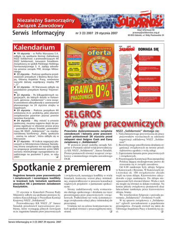 Serwis Informacyjny nr 3 (3) 2007 29 stycznia 2007 Dział Informacji KK [email protected] 80-855 Gdańsk, ul. Wały Piastowskie 24 Kalendarium 19 stycznia – w Polfie Warszawa S.A. odbyło się spotkanie Komisji Zakładowej NSZZ Solidarność z przewodniczącym KK NSZZ Solidarność, Januszem Śniadkiem. Związkowcy ze spółek Polskiego Holdingu Farmaceutycznego S. A. żądają odwołania prezesa zarządu PHF, Jerzego Milewskiego. 22 stycznia – Podczas spotkania przedstawicieli prezydium z Bożeną Borys-Szopą, Główną Inspektor Pracy, omówiono warunki dalszej współpracy między PIP i „S”. 22 stycznia – W Warszawie odbyło się posiedzenie prezydium Komisji Trójstronnej. 22 stycznia – Po kilkugodzinnych negocjacjach, do których doszło w Katowicach, górnicza „Solidarność” i inne związki zawodowe zdecydowały o zawieszeniuf planowanego na 24 stycznia strajku w kopalniach. 23 stycznia – Podczas prezydium KK omówiono m.in. problemy, jakie zdaniem związkowców powinien poznać premier Jarosław Kaczyński. 24 stycznia – Aby mówić o umowie społecznej, musimy najpierw dojść do poprawy egzekucji w obszarze prawa pracy – powiedział Janusz Śniadek, przewodniczący KK NSZZ „Solidarność” na międzynarodowej konferencji „Pakty społeczne – szansą na sukces”, która odbyła się w Warszawie. 27 stycznia – W trakcie negocjacji płacowych w Ministerstwie Edukacji Narodowej strona związkowa nie wyraziła zgody na propozycje przedstawione przez MEN wzrostu minimalnego wynagrodzenia zasadniczego na poziomie 5 proc. w roku 2007. SELGROS 0% praw pracowniczych Przeciwko dyskryminowaniu związków zawodowych i łamaniu praw pracowniczych protestowali 26 stycznia przed sklepami sieci Selgros Cash and Carry związkowcy z „Solidarności”. W proteście przed siedzibą zarządu Selgrosa w Poznaniu udział wziął przewodniczący KK NSZZ „Solidarność”, Janusz Śniadek. Protest postanowili również wesprzeć związkowcy z niemieckiego związku zawodowego DGB. Spotkanie z premierem Nagminne łamanie praw pracowniczych i związkowych i narastające konflikty w branżach były tematem spotkania prezydium KK z premierem Jarosławem Kaczyńskim. 23 stycznia w Kancelarii Prezesa Rady Ministrów odbyło się spotkanie premiera Jarosława Kaczyńskiego z Prezydium Komisji Krajowej NSZZ „Solidarność”. Przewodniczący KK NSZZ „S” Janusz Śniadek przedstawił najważniejsze problemy, które wymagają pilnych rozwiązań m.in. nagminne łamanie praw pracowniczych Serwis Informacyjny nr 3 (3) 2007 29 stycznia 2007 i związkowych, narastające konflikty w wielu branżach, konieczny wzrost płacy minimalnej, nieprawidłowości w procesie konsultacji rządowych projektów z partnerami społecznymi. Strony zadeklarowały wolę wzmocnienia dialogu społecznego i działania na rzecz przestrzegania praw pracowniczych i związkowych. Podkreślono też wolę systematycznego zwiększenia relacji płacy minimalnej do przeciętnej. Ustalono też za celowe kontynuowane takich spotkań również z poszczególnymi ministrami. NSZZ „Solidarność” domaga się: 1. Natychmiastowego przywrócenia do pracy pracowników wyrzuconych za założenie organizacji zakładowej NSZZ „Solidarność”. 2. Bezzwłocznego umożliwienia działania organizacji związkowych na terenie przedsiębiorstwa zgodnie z wolą załogi. 3. Zaprzestania łamania praw pracowniczych i związkowych. 4. Przestrzegania Konstytucji Rzeczpospolitej Polskiej dającej nieskrępowane prawo do zrzeszania się w związki zawodowe. Od 8.00 zamknięte były sklepy Selgros w Katowicach i Bytomiu. W Katowicach (ul. Lwowska) ok. 100 związkowców chciało wejść na teren sklepu. Kierownictwo zdecydowało o jego zamknięciu. Do sklepu niewpuszczani byli również klienci. Wielu z nich nie mogło się również ze sklepu wydostać. Na koniec pikiety związkowcy postanowili skuć łańcuchami zamknięte przez kierownictwo sklepu, bramy. We wrocławskim Selgrosie z powodu powstania „Solidarności” zwolniono 9 osób. W tej sprawie związkowcy z „Solidarności” zgłosili zawiadomienie o popełnieniu przestępstwa. Związek zwrócił się także do Głównego Inspektora Pracy o kontrolę tej sieci. BRANŻE Spory zbiorowe i brak dialogu Człowiek „Solidarności” Brak dialogu ze strukturami rządowymi oraz niewywiązywanie się ministerstw z przyjmowanych zobowiązań i podpisywanych porozumień – to główne problemy zgłaszane ostatnio przez struktury branżowe NSZZ „Solidarność”. W kilku branżach narastają konflikty związane z brakiem reakcji strony rządowej na postulaty związku. Przemysł stoczniowy Gospodarka morska PGiNG Niewywiązywanie się Ministerstwa Gospodarki Morskiej z przyjętych zobowiązań wobec partnerów społecznych z zespołu trójstronnego ds. Żeglugi i Rybołówstwa Morskiego. Nierealizowanie strategii państwa wobec sektora stoczniowego. Nierozwiązany problem udostępnienia akcji pracowniczych. Przemysł naftowy Spór zbiorowy w PERN Przyjaźń. Przemysł farmaceutyczny Niezrealizowane porozumienie z 2005 r. ze związkami zawodowymi w Polskim Holdingu Farmaceutycznym. Przemysł spożywczy Konflikt w Polmos Łódź. Leśnictwo Nieuporządkowanie patologicznej struktury zarządzania w Lasach Państwowych. Drogownictwo Niekonsultowanie ze związkiem ustawy o drogowych spółkach specjalnego przeznaczenia. Służba zdrowia Brak postępu w pracach nad ustawowym rozwiązaniem zatrudniania i wynagradzania pracowników służby zdrowia. Publiczne radio i telewizja Brak dialogu z pracownikami w obliczu zapowiadanej przez pracodawcę restrukturyzacji firmy i zwolnień grupowych. Sfera budżetowa Brak odpowiedzialnego podejścia ze strony właściwych resortów w odniesieniu do uregulowania wzrostu wynagrodzeń pracowników urzędów skarbowych, gospodarki wodnej oraz pracowników cywilnych MON. Płace w tyle za wydajnością Stanisław Szwed otrzymał tytuł Człowieka Rok