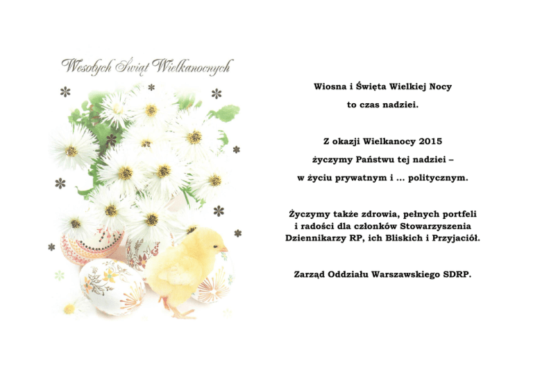Wiosna i Święta Wielkiej Nocy to czas nadziei. Z okazji Wielkanocy 2015 życzymy Państwu tej nadziei – w życiu prywatnym i … politycznym. Życzymy także zdrowia, pełnych portfeli i radości dla członków Stowarzyszenia Dziennikarzy RP, ich Bliskich i Przyjaciół. Zarząd Oddziału Warszawskiego SDRP.