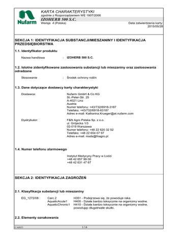 KARTA CHARAKTERYSTYKI zgodnie z Rozporządzeniem WE 1907/2006 IZOHERB 500 S.C. Wersja 4 (Polska) Data zatwierdzenia karty: 2015/05/28 SEKCJA 1: IDENTYFIKACJA SUBSTANCJI/MIESZANINY I IDENTYFIKACJA PRZEDSIĘBIORSTWA 1.1. Identyfikator produktu Nazwa handlowa : IZOHERB 500 S.C. 1.2. Istotne zidentyfikowane zastosowania substancji lub mieszaniny oraz zastosowania odradzane Stosowanie : Środek ochrony roślin 1.3. Dane dotyczące dostawcy karty charakterystyki Dostawca: Nufarm GmbH & Co KG St.-Peter-Str. 25 A-4021 Linz Austria Numer telefonu: +43/732/6918-3187 Telefaks: +43/732/6918-63187 Adres e-mail: [email protected] Dystrybutor: F&N Agro Polska Sp. z o.o. ul. Grójecka 1/3 02-019 Warszawa Numer telefonu: +48 22 620 32 52 Telefaks: +48 22 654 07 97 Adres e-mail: [email protected] 1.4. Numer telefonu alarmowego Instytut Medycyny Pracy w Łodzi +48 42 657 99 00 +48 42 631 47 67 SEKCJA 2: IDENTYFIKACJA ZAGROŻEŃ 2.1. Klasyfikacja substancji lub mieszaniny EG_1272/08 : Carc.2 AquaticAcute1 AquaticChronic1 H351 - Podejrzewa się, że powoduje raka. H400 - Działa bardzo toksycznie na organizmy wodne. H410 - Działa bardzo toksycznie na organizmy wodne, powodując długotrwałe skutki. 2.2. Elementy oznakowania CA0855 1/14 KARTA CHARAKTERYSTYKI zgodnie z Rozporządzeniem WE 1907/2006 IZOHERB 500 S.C. Wersja 4 (Polska) Data zatwierdzenia karty: 2015/05/28 ROZPORZĄDZENIE (WE) NR 1272/2008 Piktogram: GHS08 GHS09 Hasło ostrzegawcze: Uwaga H351 H410 EUH401 - Podejrzewa się, że powoduje raka. Działa bardzo toksycznie na organizmy wodne, powodując długotrwałe skutki. W celu uniknięcia zagrożeń dla zdrowia ludzi i środowiska, należy postępować zgodnie z instrukcją użycia. P201 P273 P281 P308 + P313 P391 P405 P501 P202 - Przed użyciem zapoznać się ze specjalnymi środkami ostrożności. Unikać uwolnienia do środowiska. Stosować wymagane środki ochrony indywidualnej. W przypadku narażenia lub styczności: Zasięgnąć porady/ zgłosić się pod opiekę lekarza. Zebrać wyciek. Przechowywać pod zamknięciem. Zawartość/pojemnik usuwać do autoryzowanej spalarni. Nie używać przed zapoznaniem się i zrozumieniem wszystkich środków bezpieczeństwa. - 2.3. Inne zagrożenia Ta mieszanina nie zawiera substancji uważanych za trwałe, ulegające bioakumulacji ani toksyczne (PBT). SEKCJA 3: SKŁAD/INFORMACJA O SKŁADNIKACH Typ związku : Mieszanina substancji czynnej i dodatków formulacyjnych Isoproturon 500 g/l 3.2. Mieszaniny CA0855 2/14 KARTA CHARAKTERYSTYKI zgodnie z Rozporządzeniem WE 1907/2006 IZOHERB 500 S.C. Wersja 4 (Polska) Data zatwierdzenia karty: 2015/05/28 Składniki: Izoproturon Nr CAS: Nr EINECS / Nr ELINCS: Nr REACH: Stężenie: Klasyfikacja: EG_1272/08 : 34123-59-6 251-835-4 45,5 % (w/w) Carc.Cat.2 AquaticAcute1 AquaticChronic1 (M=10) H351 - Podejrzewa się, że powoduje raka. H400 - Działa bardzo toksycznie na organizmy wodne. H410 - Działa bardzo toksycznie na organizmy wodne, powodując długotrwałe skutki. --- Kondensat formaldehydu i krezolu z siarczanem (IV) sodu Nr CAS: Nr EINECS / Nr ELINCS: Nr REACH: Stężenie: Klasyfikacja: EG_1272/08 : 67875-42-7 1,0% - 10,0% (w/w) AquaticChronic3 H412 - Działa szkodliwie na organizmy wodne, powodując długotrwałe skutki. Fosforan alkiloeteru, sól sodowa Nr CAS: Nr EINECS / Nr ELINCS: Nr REACH: Stężenie: Klasyfikacja: EG_1272/08 : 614-847-4 1,0% - 5,0% (w/w) SkinIrrit.2 EyeIrrit.2 H315 - Działa drażniąco na skórę. H319 - Działa drażniąco na oczy. SEKCJA 4: ŚRODKI PIERWSZEJ POMOCY 4.1. Opis środków pierwszej pomocy Porady ogólne : W przypadku utrzymujących się objawów lub jakichkolwiek wątpliwości zasięgnąć porady medycznej. Kontakt z oczami : Przemywać dokładnie dużą ilością wody przynajmniej przez 15 minut i skonsultować się z lekarzem. Kontakt przez skórę : Zdjąć i uprać skażoną odzież przed ponownym użyciem. Umyć wodą z mydłem. Jeśli objawy utrzymują się, wezwać lekarza. Wdychanie : Przenieść na świeże powietrze. W razie potrzeby podać tlen lub zastosować sztuczne oddychanie. Natychmiast powiadomić lekarza. Połknięcie : NIE prowokować wymiotów. Wypłukać usta. Natychmiast CA0855 3/14 KARTA CHARAKTERYSTYKI zgodnie z Rozporządzeniem WE 1907/2006 IZOHERB 500 S.C. Wersja 4 (Polska) Data zatwierdzenia karty: 2015/05/28 wezwać lekarza. 4.2. Najważniejsze ostre i opóźnione objawy oraz skutki narażenia Objawy : brak dostępnych danych 4.3. Wskazania dotyczące wszelkiej natychmiastowej pomocy lekarskiej i szczególnego postępowania z poszkodowanym Kuracja : Leczenie objawowe. SEKCJA 5: POSTĘPOWANIE W PRZYPADKU POŻARU 5.1. Środki gaśnicze Odpowiednie środki gaśnicze : Aerozol wodny, Suchy proszek, Piasek, Piana, Dwutlenek węgla (CO2) Środki gaśnicze, które nie są używane ze względów bezpieczeństwa : Silny strumień wody 5.2. Szczególne zagrożenia związane z substancją lub mieszaniną Specyficzne zagrożenia w czasie zwalczania pożaru : W razie pożaru może powstawać (NOx,COx) 5.3. Informacje dla straży pożarnej Specjalny sprzęt ochronny dla strażaków : Użyć środków ochrony osobistej. W razie konieczności w trakcie akcji gaśniczej założyć aparat oddechowy z zamkniętym obiegiem. Informacje uzupełniające : Standardowa procedura w przypadku pożaru z udziałem substancji chemicznych. Zebrać oddzielnie zanieczyszczoną wodę gaśniczą. Nie można jej usuwać do kanalizacji. SEKCJA 6: POSTĘPOWANIE W PRZYPADKU NIEZAMIERZONEGO UWOLNIENIA DO ŚRODOWISKA 6.1. Indywidualne środki ostrożności, wyposażenie ochronne i procedury w sytuacjach awaryjnych Użyć środków ochrony osobistej. (p. rozdział 8) CA0855 4/14 KARTA CHARAKTERYSTYKI zgodnie z Rozporządzeniem WE 1907/2006 IZOHERB 500 S.C. Wersja 4 (Polska) Data zatwierdzenia karty: 2015/05/28 6.2. Środki ostrożności w zakresie ochrony środowiska Nie wylewać do wód powierzchniowych i kanalizacji. 6.3. Metody i materiały zapobiegające rozprzestrzenianiu się sk