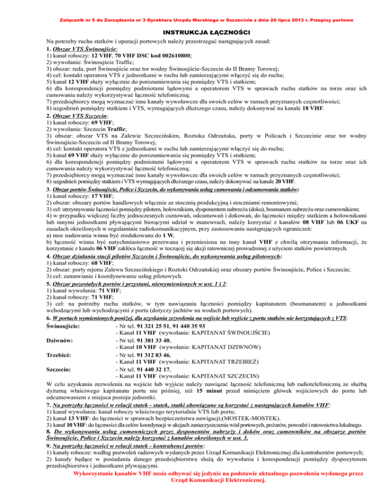 Załącznik nr 5 do Zarządzenia nr 3 Dyrektora Urzędu Morskiego w Szczecinie z dnia 26 lipca 2013 r. Przepisy portowe INSTRUKCJA ŁĄCZNOŚCI Na potrzeby ruchu statków i operacji portowych należy przestrzegać następujących zasad: 1. Obszar VTS Świnoujście: 1) kanał roboczy: 12 VHF, 70 VHF DSC kod 002610800; 2) wywołanie: Świnoujście Traffic; 3) obszar: reda, port Świnoujście oraz tor wodny Świnoujście-Szczecin do II Bramy Torowej; 4) cel: kontakt operatora VTS z jednostkami w ruchu lub zamierzającymi włączyć się do ruchu; 5) kanał 12 VHF służy wyłącznie do porozumiewania się pomiędzy VTS i statkiem; 6) dla korespondencji pomiędzy podmiotami lądowymi a operatorem VTS w sprawach ruchu statków na torze oraz ich cumowania należy wykorzystywać łączność telefoniczną; 7) przedsiębiorcy mogą wyznaczać inne kanały wywoławcze dla swoich celów w ramach przyznanych częstotliwości; 8) uzgodnień pomiędzy statkiem i VTS, wymagających dłuższego czasu, należy dokonywać na kanale 18 VHF. 2. Obszar VTS Szczecin: 1) kanał roboczy: 69 VHF; 2) wywołanie: Szczecin Traffic; 3) obszar: obszar VTS na Zalewie Szczecińskim, Roztoka Odrzańska, porty w Policach i Szczecinie oraz tor wodny Świnoujście-Szczecin od II Bramy Torowej; 4) cel: kontakt operatora VTS z jednostkami w ruchu lub zamierzającymi włączyć się do ruchu; 5) kanał 69 VHF służy wyłącznie do porozumiewania się pomiędzy VTS i statkiem; 6) dla korespondencji pomiędzy podmiotami lądowymi a operatorem VTS w sprawach ruchu statków na torze oraz ich cumowania należy wykorzystywać łączność telefoniczną; 7) przedsiębiorcy mogą wyznaczać inne kanały wywoławcze dla swoich celów w ramach przyznanych częstotliwości; 8) uzgodnień pomiędzy statkiem i VTS wymagających dłuższego czasu, należy dokonywać na kanale 20 VHF. 3. Obszar portów Świnoujście, Police i Szczecin, do wykonywania usług cumowania i odcumowania statków: 1) kanał roboczy: 17 VHF; 2) obszar: obszary portów handlowych włącznie ze stocznią produkcyjną i stoczniami remontowymi; 3) cel: utrzymywanie łączności pomiędzy pilotem, holownikiem, dysponentem nabrzeża (doku), bosmanem nabrzeża oraz cumownikiem; 4) w przypadku większej liczby jednoczesnych cumowań, odcumowań i dokowań, do łączności między statkiem a holownikami lub innymi jednostkami pływającymi biorącymi udział w manewrach, należy korzystać z kanałów 08 VHF lub 06 UKF na zasadach określonych w regulaminie radiokomunikacyjnym, przy zastosowaniu następujących ograniczeń: a) moc nadawania winna być zredukowana do 1 W, b) łączność winna być natychmiastowo przerwana i przeniesiona na inny kanał VHF z chwilą otrzymania informacji, że korzystanie z kanału 06 VHF zakłóca łączność w toczącej się akcji ratowniczej prowadzonej z użyciem statków powietrznych. 4. Obszar działania stacji pilotów Szczecin i Świnoujście, do wykonywania usług pilotowych: 1) kanał roboczy: 68 VHF; 2) obszar: porty rejonu Zalewu Szczecińskiego i Roztoki Odrzańskiej oraz obszary portów Świnoujście, Police i Szczecin; 3) cel: zamawianie i koordynowanie usług pilotowych. 5. Obszar pozostałych portów i przystani, niewymienionych w ust. 1 i 2: 1) kanał wywołania: 71 VHF; 2) kanał roboczy: 71 VHF; 3) cel: na potrzeby ruchu statków, w tym nawiązania łączności pomiędzy kapitanatem (bosmanatem) a jednostkami wchodzącymi lub wychodzącymi z portu (dotyczy jachtów na wodach portowych). 6. W portach wymienionych poniżej, dla uzyskania zezwolenia na wejście lub wyjście z portu statków nie korzystających z VTS: Świnoujście: - Nr tel. 91 321 25 51, 91 440 35 93 - Kanał 11 VHF (wywołanie: KAPITANAT ŚWINOUJŚCIE) Dziwnów: - Nr tel. 91 381 33 40, - Kanał 10 VHF (wywołanie: KAPITANAT DZIWNÓW) Trzebież: - Nr tel. 91 312 83 46, - Kanał 11 VHF (wywołanie: KAPITANAT TRZEBIEŻ) Szczecin: - Nr tel. 91 440 32 17, - Kanał 11 VHF (wywołanie: KAPITANAT SZCZECIN) W celu uzyskania zezwolenia na wejście lub wyjście należy nawiązać łączność telefoniczną lub radiotelefoniczną ze służbą dyżurną właściwego kapitanatu portu nie później, niż 15 minut przed minięciem główek wejściowych do portu lub odcumowaniem z miejsca postoju jednostki. 7. Na potrzeby łączności w relacji statek - statek, statki obowiązane są korzystać z następujących kanałów VHF: 1) kanał wywołania: kanał roboczy właściwego terytorialnie VTS lub portu; 2) kanał 13 VHF: do łączności w sprawach bezpieczeństwa nawigacji;(MOSTEK-MOSTEK). 3) kanał 10 VHF: do łączności dla celów koordynacji w akcjach zanieczyszczenia wód portowych, pożarów, powodzi i ratownictwa lokalnego. 8. Do wykonywania usług cumowniczych przez dysponentów nabrze ży i doków oraz cumowników na obszarze portów Świnoujście, Police i Szczecin należy korzystać z kanałów określonych w ust. 3. 9. Na potrzeby łączności w relacji statek - kontrahenci portów: 1) kanały robocze: według pozwoleń radiowych wydanych przez Urząd Komunikacji Elektronicznej dla kontrahentów portowych; 2) kanały będące w posiadaniu danego przedsiębiorstwa służą do wywołania i korespondencji pomiędzy dyspozytorem przedsiębiorstwa i jednostkami pływającymi. Wykorzystanie kanałów VHF może odbywać się jedynie na podstawie aktualnego pozwolenia wydanego przez Urząd Komunikacji Elektronicznej.