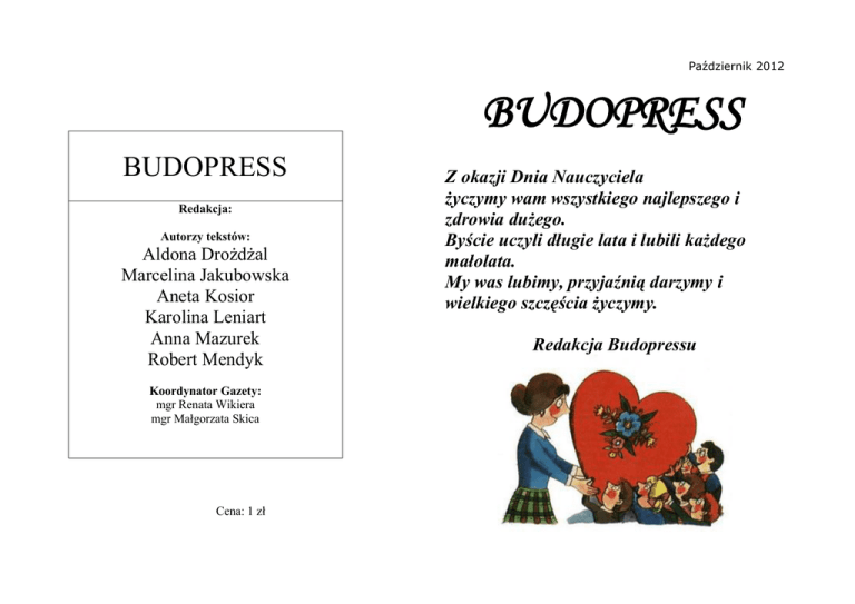 Październik 2012 BUDOPRESS BUDOPRESS Redakcja: Autorzy tekstów: Aldona Drożdżal Marcelina Jakubowska Aneta Kosior Karolina Leniart Anna Mazurek Robert Mendyk Koordynator Gazety: mgr Renata Wikiera mgr Małgorzata Skica Cena: 1 zł Z okazji Dnia Nauczyciela życzymy wam wszystkiego najlepszego i zdrowia dużego. Byście uczyli długie lata i lubili każdego małolata. My was lubimy, przyjaźnią darzymy i wielkiego szczęścia życzymy. Redakcja Budopressu Słowo miłość - za Ich troski, Słowo wdzięczność - za Ich trud. Dar to skromny, dar uczniowski, Wyśpiewany z serc jak z nut. Dziękujemy za wszystkie starania, które wkładacie w nasze wychowanie i edukację. Wierzymy, ze Wasz wysiłek uczyni z nas ludzi mądrych i szlachetnych. Dziękujemy za codzienne, niezwykle trudne i mozolne budowanie naszych wnętrz. Samorząd Uczniowski Wszystkim nauczycielom naszej szkoły życzy klasa II b Z okazji Dnia Nauczyciela naszemu najwspanialszemu wychowawcyPanu Andrzejowi Domagale składamy najlepsze życzenia, dużo zdrowia i wspaniałych przeżyć z naszą klasą Życzą Karolina i Klaudia z I a Naszej byłej, najukochańszej wychowawczyni Pani Beacie Kłak dziękujemy za trud włożony w nasze wychowanie. Przez trzy lata była Pani dla nas jak druga mamusia. Karolina i Klaudia z I a W dniu tego wspaniałego święta, za trudną pracę z nami i okazane serce chylimy głowy w ogromnej podzięce. klasa III b . Kochani nauczyciele bądźcie wciąż z nami . Czy jesteśmy duzi czy jeszcze mali, życzymy wam szczęścia na następne lata niech żyje i rozkwita nasza oświata. klasa III b Kilka informacji o Dniu Edukacji Narodowej Dzień Edukacji Narodowej; polskie święto oświaty i szkolnictwa wyższego ustanowione 27 kwietnia 1972 na mocy ustawy - Karta praw i obowiązków nauczyciela jako Dzień Nauczyciela. Od 1982, na mocy ustawy - Karta Nauczyciela, obchodzone jako Dzień Edukacji Narodowej. Upamiętnia rocznicę powstania Komisji Edukacji Narodowej, utworzonej z inicjatywy króla Stanisława Augusta Poniatowskiego, na mocy uchwały Sejmu Rozbiorowego z dnia 14 października 1773. Popularnie nadal zwane jest Dniem Nauczyciela. Dzień Edukacji Narodowej jest uroczyście obchodzony w instytucjach związanych z edukacją, jest okazją do nagradzania wyróżniających się dla edukacji osób. Dzień Nauczyciela obchodzi większość państw na świecie m.in.: Albania - 7 marca Argentyna- 11 września (związany ze śmiercią Domingo Faustino Sarmiento) Brazylia - 15 października Chiny - 10 września Czechy - 28 marca Hiszpania - 27 listopada Indie - 5 września (w dniu urodzin Sarvepalli Radhakrishnan) Malezja - 16 maja Meksyk - 15 maja Rosja - 5 października Tajwan - 28 września (w dniu urodzin Konfucjusza) Turcja - 24 listopada Ukraina - pierwsza niedziela października Wywiad z panią Heleną Mokrzycką- nauczycielem religii Jak się pani nazywa? Nazywam się Helena Mokrzycka. Dlaczego wybrała pani zawód nauczyciela ? Chciałam pracować z nowymi ludźmi, poznać teraźniejszą młodzież i dzieci W ilu szkołach pani uczy ? Aktualnie uczę w dwóch szkołach. Jak się uczy w naszej szkole? Dobrze. Lubię tutaj przyjeżdżać. Co sądzi pani o uczniach naszej szkoły? Lubię wszystkie dzieci bez wyjątków, chociaż są też trudniejsze przypadki. Jak spędza pani czas wolny? Najczęściej jeżdżę rowerem, uwielbiam jeździć nad rzekę San, ale to nie wszystko urządzamy sobie z przyjaciółmi ogniska. Sukcesy w życiu zawodowym ? Sukcesem dla mnie jest to, że gdy uczniowie skończą szkołę to dalej chcą utrzymywać ze mną kontakt . Największe niepowodzenie w zawodzie? Raz w życiu dałam się wyprowadzić uczniowi z równowagi, ale teraz mi się to nie zdarza. Bardzo dziękuję za wywiad. Dziękuję. Wywiad z panią Heleną Mokrzycką przeprowadziła Anna Mazurek. CO SIĘ DZIEJE U NAS W SZKOLE ..... Wybory do Samorządu Uczniowskiego Gimnazjum: 24 września w naszej szkole odbyły się wybory do Samorządu Uczniowskiego. Oto wyniki : Przewodniczący – Marcin Hozer Z- ca przew. – Rafał Szostak Członkowie: Sekcja organizacyjna: Anna Mazurek Karolina Leniart Sekcja porządkowa: Aneta Kosior Konrad Baj Sekcja gazetkowa: Agnieszka Marcinowska Izabela Pliszka Opiekunowie : mgr Małgorzata Skica mgr inż. Małgorzata Solak- Szamik mgr Renata Wikiera Harmonogram rozgrywek sportowych Lp. Dyscyplina 1. 2. 3. 4. 5. Gminne indywidualne biegi przełajowe pod patronatem Wójta Gminy Leżajsk Gminny turniej piłki nożnej chłopców pod patronatem Wójta Gminy Leżajsk Gminne sztafetowe biegi przełajowe pod patronatem Wójta Gminy Leżajsk Tenis Stołowy drużynowy pod patronatem Wójta Gminy Leżajsk Piłka Termin Miejsce Uwagi Odpowiedzialny 18p. J. Jucha 09- Giedlarowa godz.10.00 p. A. Ciryt 2012 22092012 Stare Miasto 6. 7. godz. 9.30 p. A. Domagała 8. 04godz.10.00 p. J. Jucha 10- Giedlarowa 10 chł. + p. A. Ciryt 2012 10 dz. 9. godz.9.30 27kl. III i p. D. Tarasek 10- Piskorowice młodsi p. K. Tarasek 2012 chł. 2+1 dz. 2+1 10- Giedlarowa godz.9.30 p. J. Jucha koszykowa 11chłopców pod 2012 patronatem Wójta Gminy Leżajsk Piłka koszykowa 17dziewcząt pod 11- Wierzawice patronatem 2012 Wójta Gminy Leżajsk Tenis stołowy indywidualny 24pod 11- Piskorowice patronatem 2012 Wójta Gminy Leżajsk Piłka 08siatkowa 12Giedlarowa dziewcząt pod 2012 Stare patronatem 19Miasto Wójta Gminy 01Leżajsk 2013 Piłka 15siatkowa 12Stare chłopców pod 2012 Miasto patronatem 12Piskorowice Wójta Gminy 01Leżajsk 2013 godz.9.30 p. M. Gołąb godz.9.30 p. D. Tarasek 5 chł. + 5 p. K. Tarasek dz. godz.9.30 p. A. Ciryt 6-cio p. A. Domagała osobowa godz.9.30 p. A. Domagała 6-cio p. K. Tarasek osobowa HUMOR SZKOLNY Dwaj chłopcy podbiegają do policjanta: - Panie władzo, szybko, nasz nauczyciel! - Co się stało? Napadli go? - Nie, on nieprawidłowo zaparkował... Nauczycielka języka polskiego obściskuje się ze swoim narzeczonym. Po chwili narzeczony szepcze jej do ucha: - Kocham. - Pe