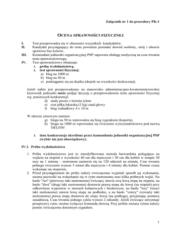 Załącznik nr 1 do procedury PK-1 OCENA SPRAWNOŚCI FIZYCZNEJ I. II. III. IV. Test przeprowadza się w obecności wszystkich kandydatów. Kandydat przystępujący do testu powinien posiadać dowód osobisty, strój i obuwie sportowe bez kolców. Komendant jednostki organizacyjnej PSP zapewnia obsługę medyczną na czas trwania testu sprawnościowego, Test sprawnościowy obejmuje: 1. próbę wydolnościową, 2. test sprawności fizycznej: a) bieg na 1000 m b) bieg na 50 m c) podciąganie się na drąŜku (drąŜek na wysokości doskocznej). JeŜeli nabór jest przeprowadzany na stanowisko administracyjno-kwatermistrzowskie kierownik jednostki moŜe podjąć decyzję o przeprowadzeniu testu sprawności fizycznej wg poniŜszych konkurencji: d) siady proste z leŜenia tyłem e) rzut piłką lekarską (2 kg) znad głowy f) bieg wahadłowy 4 x 10 m W okresie zimowym zamiast: g) biegu na 50 m wprowadza się bieg zygzakiem (koperta), h) biegu na 1000 m wprowadza się ćwiczenie wytrzymałościowe pod nazwą 'DELFIN'. 3. inne konkurencje określone przez komendanta jednostki organizacyjnej PSP (wybór nie jest obowiązkowy). IV.1. Próba wydolnościowa 1. Próba wydolnościowa jest to zmodyfikowana metoda harwardzka polegająca na wejściu na stopień o wysokości 40 cm dla męŜczyzn i 30 cm dla kobiet w tempie 30 razy na 1 minutę – metronom nastawia się na 120 uderzeń na minutę. Czas trwania pełnego ćwiczenia wynosi 5 minut dla męŜczyzn i 4 minuty dla kobiet. Pomiar czasu wykonuje się stoperem. 2. Przed przystąpieniem do próby naleŜy ćwiczącemu wyjaśnić sposób jej wykonania, moŜna pozwolić na wsłuchanie się w rytm metronomu oraz kilka próbnych wejść. Na hasło "raz" (pierwszy takt metronomu) ćwiczący stawia swą lewą stopę na stopniu, na hasło "dwa" (drugi takt metronomu) dostawia prawą stopę do lewej (na stopień) przy całkowitym wyproście w stawach kolanowych i biodrowym, na hasło "trzy" (trzeci takt metronomu) stawia lewą stopę na podłodze, a na hasło "cztery" (czwarty takt metronomu) prawą stopę dostawia do stopy lewej (na podłogę), przyjmując postawę zasadniczą. Czas trwania jednego cyklu wynosi 2 sekundy. JeŜeli ćwiczący utrzymuje przepisowy rytm, moŜna wyłączyć komendę słowną. Przy próbie zmiany rytmu naleŜy pomóc ćwiczącemu donośnym sygnałem. 1 3. Po upływie czasu trwania pełnego ćwiczenia kandydat siada na krześle i wykonywane są trzy pomiary częstości tętna przez 30 sekund, począwszy od 1 min. po zakończeniu próby, następnie od 2 min. oraz od 4 min., które przeliczone według poniŜszego wzoru daje wynik, będący wskaźnikiem FI wydolności organizmu kandydata: czas pracy w [s} x 100 FI = ------------------------------------2 x suma trzech pomiarów tętna 4. Pomiaru tętna ćwiczącego dokonuje lekarz, pielęgniarka lub członek komisji posiadający ukończony kurs ratownictwa medycznego waŜny na dzień przeprowadzania próby wydolnościowej. 5. Dopuszcza się mierzenie tętna za pomocą, dopuszczonych w handlu, urządzeń do pomiaru ciśnienia i tętna, pod warunkiem, Ŝe będzie to urządzenie ramieniowe z moŜliwością dopasowywania mankietu do średnicy ramienia ćwiczącego, zintegrowane z mechanizmem pompującym powietrze do mankietu. 6. Kandydat, który nie jest w stanie wykonać próby w załoŜonym czasie, powinien przerwać próbę wcześniej. Próbę przerywa się równieŜ, jeśli ćwiczący w ciągu ok. 20 s nie jest w stanie skorygować lub utrzymać rytmu wykonywania ćwiczenia; kandydatom tym oblicza się wskaźnik wydolności FI, wstawiając do licznika wzoru cyfrę odpowiadającą ilości sekund wykonywania ćwiczenia. Wydolnościowy wskaźnik próby harwardzkiej - ocena "harvard step-up test": Wskaźnik wydolności poniŜej 65 65 - 79 80 - 89 90 i powyŜej Wynik - Ocena nie zalicza przeciętny dobry bardzo dobry IV.2. Test sprawności fizycznej. IV.2.a) Bieg na 1000 m: Ćwiczący zajmuje pozycję startową stojącą przed linią startu; na sygnał "startera" rozpoczyna bieg; czas mierzony jest do momentu osiągnięcia klatką piersiową linii mety. Falstart powoduje powtórzenie startu. IV.2.b) Bieg na 50 m: Ćwiczący zajmuje pozycję startową (niska lub stojąca) przed linią startu. Na donośny sygnał "startera" rozpoczyna bieg. Czas mierzony jest do momentu osiągnięcia klatką piersiową linii mety. Falstart powoduje powtórzenie startu. IV.2.c) Podciąganie się na drąŜku (drąŜek na wysokości doskocznej). Ćwiczący zajmuje pozycję w zwisie na drąŜku (nachwytem lub podchwytem) - ramiona wyprostowane i pozostaje w bezruchu. Ćwiczący wykonuje podciągnięcia tak, Ŝeby broda znalazła się ponad drąŜkiem, wraca do pozycji wyjściowej (ramiona wyprostowane) i ponawia ewolucję. 2 Oceniający zalicza tylko prawidłowe wykonanie ćwiczenia, wymieniając kolejne liczby zaliczonych powtórzeń. Podczas wykonywania ćwiczenia dozwolona jest praca nóg i tułowia. Wyniki uzyskane podczas konkurencji: bieg na 1000 m., bieg na 50 m. oraz podciąganie się na drąŜku przelicza się wg tabeli nr 1. Ocenę wystawia się na podstawie średniej arytmetycznej uzyskanych punktów . Przykładowa ocena kandydata, który uzyskał: - bieg na 1.000 m – 3 min 25 sek. tj. 60 pkt, - bieg na 50 m – 6,8 sek. tj. 65 pkt, - podciąganie się na drąŜku – 11 razy, tj. 55 pkt. Łącznie kandydat uzyskał 180 pkt. Średnia arytmetyczna (60 + 65 + 55) : 3 = 60 pkt. Średnią arytmetyczną uzyskanych punktów z prób o których mowa w pkt. IV.2a, IV.2b i IV.2c oraz przypisane do nich oceny określa tabela nr 3. IV.2.d) Siady proste z leŜenia tyłem Ćwiczący przyjmuje pozycję leŜącą tyłem (na plecach) - ręce wzdłuŜ tułowia, nogi ustabilizowane (mogą być w lekkim rozkroku), współćwiczący przytrzymuje je w okolicach stawów skokowych lub ćwiczący umieszcza je pod szczebelkiem drabinki. Wykonanie ćwiczenia polega na uniesieniu tułowia do pozycji pionowej. Oceniający zalic