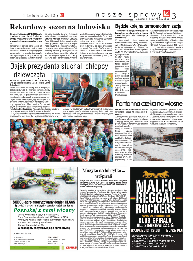 nasze sprawy 4 kwietnia 2013 r Ziemia Piotrkowska Rekordowy sezon na lodowisku Zakończył się sezon 2012/2013 na lodowisku w parku im. J. Poniatowskiego.Wyjątkowo w tym roku piotrkowskiej ślizgawce sprzyjała pogoda. Temperatury poniżej zera, jak i brak deszczu pozwoliły w pełni wykorzystać możliwości obiektu. Z wstępnego podsumowania – na podstawie wpływów kasowych – wynika, że był to rekordowy sezon. Ze sprzedaży karnetów i biletów do kasy Ośrodka Sportu i Rekreacji wpłynęło 68 tys. 236 zł.Jak zaznacza Leszek Heinzel, dyrektor Ośrodka Sporu i Rekreacji, liczby mogą tylko cieszyć, gdyż świadczą o wzroście aktywności fizycznej piotrkowian i systematycznych odwiedzinach obiektu. – Odwiedzały nas szkoły, rodziny oraz liczne wycieczki. Zorganizowaliśmy także kilka imprez sportowych, m. in: pokazy tańca na lodzie czy gry i zabawy na łyż- wach. Szczególnym powodzeniem cieszyła się promocja w ferie. Przeżywaliśmy wówczas prawdziwe oblężenie – cieszy się dyrektor Heinzel. Udany sezon 2012/2013 na piotrkowskim lodowisku od dziś przechodzi do historii. Pracownicy OSiR rozpoczeli demontaż obiektu.Wraz ze zniknięciem śniegu w miejsce ślizgawki powrócą korty do tenisa ziemnego i łyżwiarzy zastąpią tenisiści. Bajek prezydenta słuchali chłopcy i dziewczęta Piotrków Trybunalski od lat uczestniczy w ogólnopolskiej akcji „Cała Polska Czyta Dzieciom”. Do tej szlachetnej inicjatywy rokrocznie przyłączają się również piotrkowscy samorządowcy z władzami miasta na czele. Podobnie, jak w całym kraju, tak i w piotrkowskich bibliotekach, szkołach i przedszkolach organizowane są różnego rodzaju zajęcia polegające na wspólnym, głośnym czytaniu.Tak było w Przedszkolu Samorządowym nr 24 im. Misia Uszatka. Dla najmłodszych piotrkowian bajki czytał wiceprezydent miasta Andrzej Kacperek.Przedszkolaki słuchały między innymi bajek o „Chorym Kotku” i „Murzynku Bambo”. – Czytanie dzieciom wpływa bardzo korzystnie na ich rozwój emocjonalny, uczy je języka i myślenia. Jeśli chcemy, by wy- 3 Będzie kolejna termomodernizacja Termomodernizacje piotrkowskich budynków oświatowych to jedno z ważniejszych zadań inwestycyjnych miasta. W ciągu ostatnich kilku lat wykonano termomodernizacje Szkoły Podstawowej Nr 16, Gimnazjum Nr 4, Przedszkola Samorządowego Nr 7, Gimnazjum Nr 2 oraz Przedszkola Samorządowego Nr 20. Wszystkie te inwestycje nie tylko poprawiły komfort nauki uczniów i pracy nauczycieli, ale także zaczęły generować bardzo duże oszczędności. W związku z tym magistrat na ten rok przewidział kolejne modernizacje: Szkoły Podstawowej Nr 11 i Nr 13, Centrum Kształcenia Praktycznego, a także Przedszkola Samorządowego Nr 24.To jednak nie koniec.Dzięki pozyskanemu dofinansowaniu podobną inwestycję przejdzie Ośrodek Edukacji Artystycznej Miejskiego Ośrodka Kultury. Na realizację tego zadania Miejski Ośrodek Kultury pozyskał 100 tys. zł z programu Infrastruktura Domów Kultury, pochodzącego z Ministerstwa Kultury i Dziedzictwa Narodowego. Fontanna czeka na wiosnę rosły na wykształconych, kulturalnych i mądrych ludzi ważne jest, aby pokazywać maluchom wspaniały świat bajek i wypływające z nich pozytywne wartości – mówił wiceprezydent podkreślając znaczenie akcji. Piotrkowska fontanna miała zostać uruchomiona już na święta Wielkanocne. Ze względu na panujące warunki atmosferyczne tak się jednak nie stanie. Zalegający śnieg oraz minusowa temperatura spowodowałyby uszkodzenie mechanizmów fontanny także wodotrysk czeka na prawdziwą wiosnę i dopiero wtedy rozbłyśnie kolorowymi światłami. Ze względu na mroźną i długą zimę uszkodzeniu uległa część płytek. Przegląd gwarancyjny fontanny wykazał również m.in. odpryski farby na na- krywach i betonowych płytkach. – Awaria będzie usuwana w ramach gwarancji.Wykonawca rozpocznie roboty wraz z ustabilizowaniem się pogody – informują miejscy urzędnicy.– Naprawy mogą potrwać do końca kwietnia, gdyż wszystko zależy od temperatury. Muzyka na fali tylko ... w Spirali W tym roku mija 16 lat od założenia przez Darka Malejonka MALEO REGGAE ROCKERS. Do tej pory zespół wydał sześć płyt, jedno DVD oraz zagrał około 1000 koncertów zarówno w Polsce i za granicą. SOBOL-agro autoryzowany dealer CLAAS Sprzedaż maszyn rolniczych - serwis- części zamienne Poszukaj z nami wiosny Oferujemy: - Ciągniki o mocy 72-524 KM maszyn z rocznika 2012 wyprzedaż - Wielka - Kombajny zbożowe, Sieczkarnie na ciągnikipolowe, serii AXOS oraz ARION - 3 lata Gwarancji - Prasy, Ładowarki warunki teleskopowe - Atrakcyjne finansowania fabrycznego na kombajny maszyny zielonkowe, samozałodawcze - Przyczepy zbożowe oraz maszynyoraz zielonkowe LEMKEN, HORSCH, BAUER, WIELTON, rolnicze: - Maszyny - Oprocentowanie już od 3% MASCHIO GASPARDO, STOLL, QUICKE i inne. O szczegóły zapytaj swojego sprzedawcę Gwarantujemy stałą cenę w PLN SOBOL- agro Sp. z o.o. ul. Bracka 11 97-300 Piotrków Trybunalski Telefon: 44 732 38 90 www.sobol-agro.pl Filia Łowicz: ul. Jana Pawła 177/179 99-400 Łowicz Telefon: 667 500 112 W 2009 roku ekipa wzięła udział w projekt upamiętniającym Powstanie Warszawskie („Pamiętamy 44 – Gajcy”, „Warszawskie Dzieci”). Na płycie wydanej przez Muzeum Powstania Warszawskiego pojawiła się piosenka MALEO REGGAE ROCKERS „Pytanie”, która była singlem promującym cały album. Od kilku lat muzycy MRR angażują się w akcję „Wolna Białoruś”, podczas której składają wyraźny protest przeciwko łamaniu praw człowieka na świecie.Zespół za dotychczasowe dokonania muzyczne dostał trzy nominacje do nagrody przemysłu fonograficznego „Fryderyki” oraz „Superjedynki”, w kategoriach najlepsza płyta reggae oraz najlepszy zespół.Podczas swojej 16-letniej działalności MALEO REGGAE ROCKERS odbyli kilka zagranicznych podróży, odwiedzając m.in. USA, Ukrainę