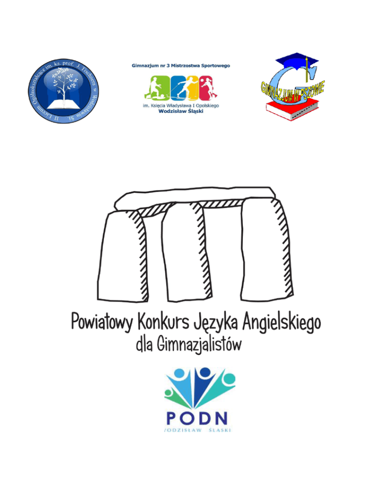 Powiatowy Ośrodek Doskonalenia Nauczycieli w Wodzisławiu Śląskim, II Liceum Ogólnokształcące im. ks. prof. J. Tischnera w Wodzisławiu Śląskim, Gimnazjum nr 3 Mistrzostwa Sportowego w Wodzisławiu Śląskim oraz Gimnazjum w Pszowie zapraszają do udziału w IV Powiatowym Konkursie Języka Angielskiego dla Gimnazjalistów odbywającym się pod honorowym patronatem Starosty Powiatu Wodzisławskiego. REGULAMIN KONKURSU 1. Tegoroczna edycja konkursu odbędzie się 7 marca 2017 r. o godzinie 10.00 w II Liceum Ogólnokształcącym im. ks. prof. Józefa Tischnera w Wodzisławiu Śląskim. Karta zgłoszenia ucznia znajduje się w załączniku do niniejszego regulaminu. 2. Konkurs ma zasięg i rangę powiatową. Patronat naukowy sprawuje Powiatowy Ośrodek Doskonalenia Nauczycieli w Wodzisławiu Śląskim. 3. Konkurs adresowany jest do uczniów klas I, II oraz III szkół gimnazjalnych z terenu powiatu wodzisławskiego. 4. Cele konkursu: rozbudzenie wśród uczniów zainteresowania językiem angielskim, podniesienie poziomu umiejętności językowych u uczniów, motywowanie szkół do rozpoznawania i rozwijania umiejętności oraz zainteresowań uczniów na płaszczyźnie języka angielskiego, a także podejmowania działań w zakresie pracy z uczniem zdolnym, promowanie nauki języka angielskiego oraz osiągnięć uczniów i ich nauczycieli. 5. Tematykę i stopień trudności materiału językowego konkursu określa podstawa programowa dla języków obcych nowożytnych dla III etapu edukacyjnego, poziom III.1. na podbudowie wymagań dla II etapu edukacyjnego. 6. Konkurs zostanie przeprowadzony w trzech kategoriach wiekowych: English is Fun dla uczniów klas I English Challenge dla uczniów klas II Prove Your English dla uczniów klas III 7. Na każdym poziomie konkurs trwa 60 minut. Arkusz konkursowy składa się z następujących części: rozumienie ze słuchu rozumienie tekstów pisanych znajomość środków językowych i funkcji językowych. 8. Do każdego poziomu konkursu szkoła może zgłosić dwóch reprezentantów. 9. Uczestnicy konkursu przyjeżdżają na miejsce na własny koszt, pod opieką wyznaczonego przez swoją szkołę nauczyciela i mają obowiązek okazania legitymacji szkolnej. 10. W skład Komisji Konkursowej wchodzą: przedstawiciel Dyrekcji II Liceum Ogólnokształcącego w Wodzisławiu Śląskim – przewodniczący nauczyciele języka angielskiego szkół organizujących konkurs oraz doradca metodyczny języka angielskiego – członkowie komisji 11. Prace będą sprawdzane bezpośrednio po ich napisaniu, wyniki zostaną ogłoszone w dniu konkursu. 12. Laureaci i finaliści otrzymują dyplomy podpisane przez Starostę powiatu wodzisławskiego - na ich podstawie można uzyskać punkty preferencyjne w toku rekrutacji do szkół ponadgimnazjalnych. 13. Laureaci konkursu otrzymują nagrody rzeczowe zaś opiekunowie merytoryczni uczestników pisemne podziękowania. 14. Laureaci oraz wyróżnieni w Konkursie w części Prove Your English zostają przyjęci do klasy dwujęzycznej II LO w Wodzisławiu Śląskim z wynikiem końcowym 100% w procesie rekrutacji z języka angielskiego. 15. Laureaci I miejsca w każdej kategorii wiekowej zostaną dodatkowo uhonorowani na uroczystej Gali PODN (czerwiec 2017). 15. Nazwiska laureatów oraz wyróżnionych uczniów zostaną zamieszczone na stronie internetowej Powiatowego Ośrodka Doskonalenia Nauczycieli w Wodzisławiu Śląskim oraz na stronach internetowych szkół organizujących konkurs.. Przystąpienie do udziału w konkursie jest jednoznaczne z wyrażeniem przez uczestnika i jego rodziców/opiekunów prawnych zgody na umieszczenie jego imienia i nazwiska oraz zdjęć z konkursu na stronach internetowych organizatorów konkursu. 16. Zgłoszenia uczestników przyjmowane będą drogą mailową na adres: [email protected] W zgłoszeniu należy podać: pełną nazwę i adres szkoły, imiona i nazwiska uczestników wraz z etapem do którego przystępują, imiona i nazwiska opiekunów merytorycznych (patrz załącznik Karta Zgłoszenia). Termin nadsyłania upływa 24 lutego 2017. 17. Dodatkowych informacji na temat konkursu udzielają organizatorzy: Magdalena Adamek, nr tel. 509 443 629, e-mail: [email protected] Helena Matys, nr tel. 600 299 238, e-mail: [email protected] Joanna Dziwoki, nr tel. 509 158 175, e-mail: [email protected] Justyna Reś-Fronczak, nr tel. 668 441 674, e-mail: [email protected]