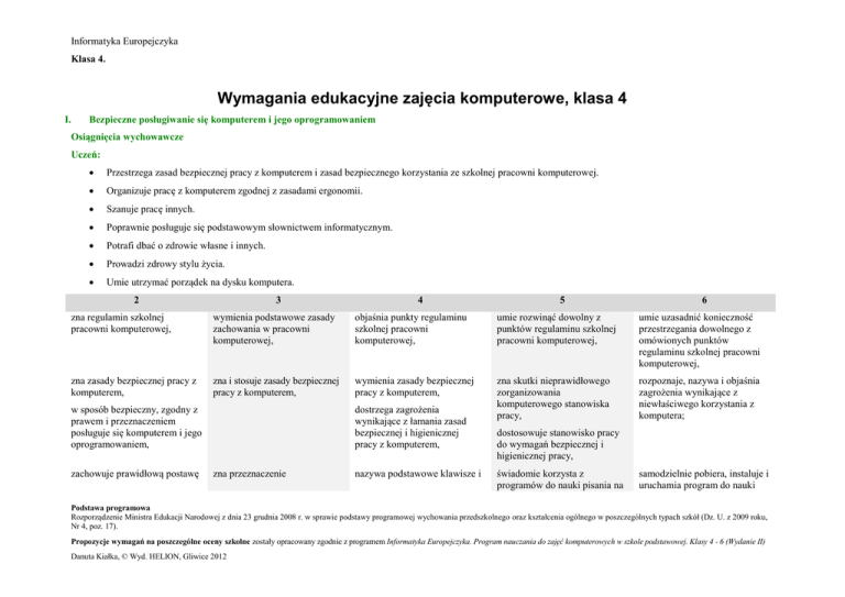 Informatyka Europejczyka Klasa 4. Wymagania edukacyjne zajęcia komputerowe, klasa 4 I. Bezpieczne posługiwanie się komputerem i jego oprogramowaniem Osiągnięcia wychowawcze Uczeń: Przestrzega zasad bezpiecznej pracy z komputerem i zasad bezpiecznego korzystania ze szkolnej pracowni komputerowej. Organizuje pracę z komputerem zgodnej z zasadami ergonomii. Szanuje pracę innych. Poprawnie posługuje się podstawowym słownictwem informatycznym. Potrafi dbać o zdrowie własne i innych. Prowadzi zdrowy stylu życia. Umie utrzymać porządek na dysku komputera. 2 3 4 5 6 zna regulamin szkolnej pracowni komputerowej, wymienia podstawowe zasady zachowania w pracowni komputerowej, objaśnia punkty regulaminu szkolnej pracowni komputerowej, umie rozwinąć dowolny z punktów regulaminu szkolnej pracowni komputerowej, umie uzasadnić konieczność przestrzegania dowolnego z omówionych punktów regulaminu szkolnej pracowni komputerowej, zna zasady bezpiecznej pracy z komputerem, zna i stosuje zasady bezpiecznej pracy z komputerem, wymienia zasady bezpiecznej pracy z komputerem, zna skutki nieprawidłowego zorganizowania komputerowego stanowiska pracy, rozpoznaje, nazywa i objaśnia zagrożenia wynikające z niewłaściwego korzystania z komputera; w sposób bezpieczny, zgodny z prawem i przeznaczeniem posługuje się komputerem i jego oprogramowaniem, zachowuje prawidłową postawę dostrzega zagrożenia wynikające z łamania zasad bezpiecznej i higienicznej pracy z komputerem, zna przeznaczenie nazywa podstawowe klawisze i dostosowuje stanowisko pracy do wymagań bezpiecznej i higienicznej pracy, świadomie korzysta z programów do nauki pisania na samodzielnie pobiera, instaluje i uruchamia program do nauki Podstawa programowa Rozporządzenie Ministra Edukacji Narodowej z dnia 23 grudnia 2008 r. w sprawie podstawy programowej wychowania przedszkolnego oraz kształcenia ogólnego w poszczególnych typach szkół (Dz. U. z 2009 roku, Nr 4, poz. 17). Propozycje wymagań na poszczególne oceny szkolne zostały opracowany zgodnie z programem Informatyka Europejczyka. Program nauczania do zajęć komputerowych w szkole podstawowej. Klasy 4 - 6 (Wydanie II) Danuta Kiałka, © Wyd. HELION, Gliwice 2012 Informatyka Europejczyka Klasa 4. podczas pracy z komputerem, poszczególnych klawiszy, określa ich funkcje, klawiaturze komputera; prawidłowo posługuje się myszą i klawiaturą komputerową, prezentuje prawidłowy układ rąk na klawiaturze, omawia przeznaczenie poszczególnych klawiszy, wie, jak się wpisuje wielkie litery i polskie znaki, sprawnie posługuje się klawiaturą, samodzielnie obsługuje płytę CD dołączoną do podręcznika, odnajduje właściwy plik potrzebny do wykonania zadania, zna przeznaczenie klawiszy: Page Up, Page Down, Home, End oraz klawiszy sterowania kursorem, popełnia nieliczne błędy, wprowadzając tekst z klawiatury, stosuje metodę przeciągnij i upuść, nazywa podstawowe klawisze, przy pomocy nauczyciela obsługuje program do nauki pisania na klawiaturze komputera, korzysta z płyty CD dołączonej do podręcznika, odnajduje na niej właściwy plik według wskazówek nauczyciela, komunikuje się z komputerem za pomocą ikon, przycisków, menu i okien dialogowych, w prawidłowy sposób wprowadza z klawiatury litery z użyciem lewej i prawej ręki, obsługuje program do nauki pisania na klawiaturze komputera, pisania na klawiaturze komputera wykorzystywany na lekcji, samodzielnie zapisuje plik z płyty CD na dysku komputera bez zmiany nazwy oraz ze zmianą nazwy; stara się nie popełniać błędów przy wprowadzaniu tekstu z klawiatury, z niewielką pomocą nauczyciela obsługuje program do nauki pisania na klawiaturze komputera, przy pomocy nauczyciela zapisuje plik z płyty CD na dysku komputera, zna pojęcie sieci komputerowej, przy pomocy nauczyciela poprawnie loguje się do szkolnej sieci komputerowej, prawidłowo rozpoczyna i kończy pracę w sieci; przy pomocy nauczyciela poprawnie loguje się i obsługuje program z płyty CD rozumie pojęcie sieci komputerowej, samodzielnie loguje się do szkolnej sieci komputerowej, wie, czym jest sieć komputerowa, wymienia zalety połączenia komputerów w sieć, przy niewielkiej pomocy nauczyciela loguje się do szkolnej sieci komputerowej, według wskazówek nauczyciela uruchamia i obsługuje komputer oraz samodzielnie obsługuje komputer oraz program z płyty Podstawa programowa Rozporządzenie Ministra Edukacji Narodowej z dnia 23 grudnia 2008 r. w sprawie podstawy programowej wychowania przedszkolnego oraz kształcenia ogólnego w poszczególnych typach szkół (Dz. U. z 2009 roku, Nr 4, poz. 17). Propozycje wymagań na poszczególne oceny szkolne zostały opracowany zgodnie z programem Informatyka Europejczyka. Program nauczania do zajęć komputerowych w szkole podstawowej. Klasy 4 - 6 (Wydanie II) Danuta Kiałka, © Wyd. HELION, Gliwice 2012 Informatyka Europejczyka Klasa 4. dołączonej do podręcznika, program z płyty CD dołączonej do podręcznika, CD dołączonej do podręcznika, rozróżnia podstawowe elementy zestawu komputerowego, wymienia elementy zestawu komputerowego, określa zastosowanie poszczególnych elementów zestawu komputerowego, zna pojęcie stanu uśpienia komputera, rozumie pojęcie stanu uśpienia komputera, wyjaśnia różnicę między całkowitym wyłączeniem komputera a jego przejściem w stan uśpienia; umie prawidłowo rozpocząć i zakończyć pracę z komputerem, opisuje przyciski rozmieszczone na komputerze, wymienia popularne systemy operacyjne, dostosowuje elementy okna programu do własnych potrzeb, jeżeli program daje taką możliwość, potrafi podać nazwę systemu operacyjnego zainstalowanego na komputerach w pracowni, klasyfikuje podstawowe urządzenia wejścia i wyjścia w zestawie komputerowym, nazywa je i określa ich zastosowanie, rozróżnia pojęcia: pulpit, ikona, plik, katalog, rozumie pojęcia: pulpit, ikona, plik, katalog, rozróżnia pliki i katalogi