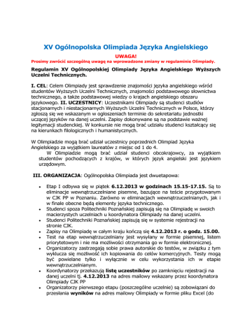 XV Ogólnopolska Olimpiada Języka Angielskiego UWAGA! Prosimy zwrócić szczególną uwagę na wprowadzone zmiany w regulaminie Olimpiady. Regulamin XV Ogólnopolskiej Olimpiady Języka Angielskiego Wyższych Uczelni Technicznych. I. CEL: Celem Olimpiady jest sprawdzenie znajomości języka angielskiego wśród studentów Wyższych Uczelni Technicznych, znajomości podstawowego słownictwa technicznego, a także podstawowej wiedzy o krajach angielskiego obszaru językowego. II. UCZESTNICY: Uczestnikami Olimpiady są studenci studiów stacjonarnych i niestacjonarnych Wyższych Uczelni Technicznych w Polsce, którzy zgłoszą się we wskazanym w ogłoszeniach terminie do sekretariatu jednostki uczącej języków na danej uczelni. Zapisy dokonywane są na podstawie ważnej legitymacji studenckiej. W konkursie nie mogą brać udziału studenci kształcący się na kierunkach filologicznych i humanistycznych. W Olimpiadzie mogą brać udział uczestnicy poprzednich Olimpiad Języka Angielskiego za wyjątkiem laureatów z miejsc od 1 do 4. W Olimpiadzie mogą brać udział studenci obcokrajowcy, za wyjątkiem studentów pochodzących z krajów, w których język angielski jest językiem urzędowym. III. ORGANIZACJA: Ogólnopolska Olimpiada jest dwuetapowa: Etap I odbywa się w piątek 6.12.2013 w godzinach 15.15-17.15. Są to eliminacje wewnątrzuczelniane pisemne, bazujące na teście przygotowanym w CJK PP w Poznaniu. Zarówno w eliminacjach wewnątrzuczelnianych, jak i w finale obecne będą elementy języka technicznego. Studenci spoza Politechniki Poznańskiej zapisują się na Olimpiadę w swoich macierzystych uczelniach u koordynatora Olimpiady na danej uczelni. Studenci Politechniki Poznańskiej zapisują się w systemie rejestracji na stronie CJK. Zapisy na Olimpiadę w całym kraju kończą się 4.12.2013 r. o godz. 15.00. Test na etap wewnątrzuczelniany jest wysyłany w formie pisemnej, listem priorytetowym i nie ma możliwości otrzymania go w formie elektronicznej. Organizatorzy zastrzegają sobie prawa autorskie do testów, w związku z tym wyklucza się możliwość ich kopiowania do celów komercyjnych. Testy mogą być powielane tylko i wyłącznie w celu wykorzystania ich w etapie wewnątrzuczelnianym. Koordynatorzy przekazują listę uczestników po zamknięciu rejestracji na danej uczelni tj. 4.12.2013 na adres mailowy wskazany przez koordynatora Olimpiady CJK PP Organizatorzy pierwszego etapu (poszczególne uczelnie) są zobowiązani do przesłania wyników na adres mailowy Olimpiady w formie pliku Excel (do pobrania na stronie: http://www.clc.put.poznan.pl/) w terminie do 17.12.2013 oraz przesłanie testów wszystkich uczestników pocztą na adres CJK Politechniki Poznańskiej. Testy muszą być sprawdzone przez dwóch lektorów i opatrzone dwoma czytelnymi podpisami. Wyniki łącznie z listą uczestników kwalifikujących się do etapu ogólnopolskiego zostaną ogłoszone do dnia 31.01.2014 r. na stronie CJK oraz przesłane drogą mailową do poszczególnych uczelni. Czas trwania testu: 2 godziny zegarowe – nie ma przerwy. Organizatorzy zastrzegają sobie prawo wyrywkowego kontrolowania testów nadesłanych z poszczególnych uczelni. Osoby zakwalifikowane do kolejnego etapu są zobowiązane do przygotowania prezentacji w formie multimedialnej. Temat prezentacji: My formula for success in professional life Prezentacja w etapie finałowym musi być przygotowana na dwóch różnych nośnikach elektronicznych. Studenci są zobowiązani do korzystania z laptopa udostępnionego przez CJK PP. Zabrania się używania prywatnych laptopów uczestników. Czas trwania prezentacji nie może przekroczyć 10 minut. Etap II: o Eliminacje pisemne: piątek, 9.05.2014 r., godz. 12.00 (czas trwania 2 godziny zegarowe, nie ma przerwy); o Eliminacje ustne: piątek, 9.05.2014 r. od godziny 15.15; o Prezentacje: sobota 10.05.2014 r. – prezentacje 10 najlepszych studentów po etapie pisemnym i ustnym. Nazwiska tych osób zostaną podane w sobotę przed rozpoczęciem prezentacji o godz. 8:45. UWAGA! Jeśli osoba z grupy zakwalifikowanych do przedstawienia prezentacji nie będzie jej miała lub nie będzie chciała jej przedstawić, automatycznie zostaje wykluczona z grupy laureatów. Kolejna osoba z listy kwalifikuje się do grona laureatów i przedstawia swoją prezentację. O ostatecznie zajętym miejscu decyduje suma punktów z etapów pisemnego, ustnego oraz prezentacji. Prezentacje uczestników są oceniane przez komisję powołaną przez CJK PP. W przypadku uzyskania przez dwóch lub więcej laureatów jednakowej liczby punktów w finałowym etapie ogólnopolskim, kolejność laureatów jest wyłaniana w drodze publicznego losowania. Uwagi dodatkowe: Zakres zagadnień do etapu ustnego wraz z sugerowaną literaturą udostępniony jest w gablocie CJK PP oraz na stronach internetowych CJK: http://www.clc.put.poznan.pl/ (zakładka „Olimpiada Języka Angielskiego”); Każdy uczestnik Olimpiady przyjeżdżający na etap II zobowiązany jest do przygotowania prezentacji multimedialnej (akceptowane formaty: Power Point, PDF). Na każdy etap uczestnicy zobowiązani są zabrać ze sobą ważną legitymację studencką i dowód osobisty. W przypadku etapu II obowiązuje strój galowy. Organizatorzy nie pokrywają kosztów uczestników związanych z udziałem w Olimpiadzie. Ogłoszenie nazwisk laureatów, zdobytych przez nich miejsc oraz wręczenie nagród nastąpi po prezentacjach. W przypadku nieobecności laureata podczas finału, nagrody należy odebrać osobiście w terminie nie późniejszym niż 2 miesiące od dnia finału w sekretariacie CJK PP. Po upływie tego terminu nagrody przechodzą na rzecz CJK PP. IV. ORGANIZATORZY: Organizatorem Ogólnopolskiej Olimpiady Języka Angielskiego jest Zespół Lektorów Języka Angielskiego CJK PP. Szczegółowej informacji udzielają: mgr Elżbieta Jeziorek, mgr Agata Jankiewicz, mgr Justyna Połomka oraz mgr Hanna Samolej. Patronat honorowy coro