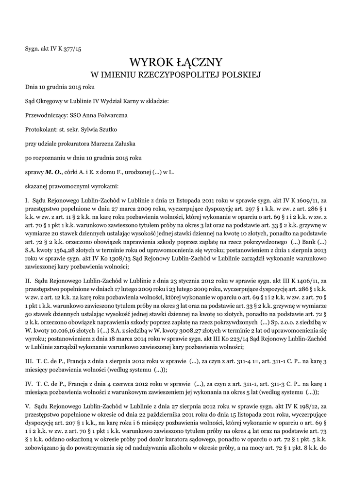 Sygn. akt IV K 377/15 WYROK ŁĄCZNY W IMIENIU RZECZYPOSPOLITEJ POLSKIEJ Dnia 10 grudnia 2015 roku Sąd Okręgowy w Lublinie IV Wydział Karny w składzie: Przewodniczący: SSO Anna Folwarczna Protokolant: st. sekr. Sylwia Szutko przy udziale prokuratora Marzena Załuska po rozpoznaniu w dniu 10 grudnia 2015 roku sprawy M. O., córki A. i E. z domu F., urodzonej (...) w L. skazanej prawomocnymi wyrokami: I. Sądu Rejonowego Lublin-Zachód w Lublinie z dnia 21 listopada 2011 roku w sprawie sygn. akt IV K 1609/11, za przestępstwo popełnione w dniu 27 marca 2009 roku, wyczerpujące dyspozycję art. 297 § 1 k.k. w zw. z art. 286 § 1 k.k. w zw. z art. 11 § 2 k.k. na karę roku pozbawienia wolności, której wykonanie w oparciu o art. 69 § 1 i 2 k.k. w zw. z art. 70 § 1 pkt 1 k.k. warunkowo zawieszono tytułem próby na okres 3 lat oraz na podstawie art. 33 § 2 k.k. grzywnę w wymiarze 20 stawek dziennych ustalając wysokość jednej stawki dziennej na kwotę 10 złotych, ponadto na podstawie art. 72 § 2 k.k. orzeczono obowiązek naprawienia szkody poprzez zapłatę na rzecz pokrzywdzonego (...) Bank (...) S.A. kwoty 1564,28 złotych w terminie roku od uprawomocnienia się wyroku; postanowieniem z dnia 1 sierpnia 2013 roku w sprawie sygn. akt IV Ko 1308/13 Sąd Rejonowy Lublin-Zachód w Lublinie zarządził wykonanie warunkowo zawieszonej kary pozbawienia wolności; II. Sądu Rejonowego Lublin-Zachód w Lublinie z dnia 23 stycznia 2012 roku w sprawie sygn. akt III K 1406/11, za przestępstwo popełnione w dniach 17 lutego 2009 roku i 23 lutego 2009 roku, wyczerpujące dyspozycję art. 286 § 1 k.k. w zw. z art. 12 k.k. na karę roku pozbawienia wolności, której wykonanie w oparciu o art. 69 § 1 i 2 k.k. w zw. z art. 70 § 1 pkt 1 k.k. warunkowo zawieszono tytułem próby na okres 3 lat oraz na podstawie art. 33 § 2 k.k. grzywnę w wymiarze 50 stawek dziennych ustalając wysokość jednej stawki dziennej na kwotę 10 złotych, ponadto na podstawie art. 72 § 2 k.k. orzeczono obowiązek naprawienia szkody poprzez zapłatę na rzecz pokrzywdzonych (...) Sp. z.o.o. z siedzibą w W. kwoty 10.016,16 złotych i (...) S.A. z siedzibą w W. kwoty 3008,27 złotych w terminie 2 lat od uprawomocnienia się wyroku; postanowieniem z dnia 18 marca 2014 roku w sprawie sygn. akt III Ko 223/14 Sąd Rejonowy Lublin-Zachód w Lublinie zarządził wykonanie warunkowo zawieszonej kary pozbawienia wolności; III. T. C. de P., Francja z dnia 1 sierpnia 2012 roku w sprawie (...), za czyn z art. 311-4 1=, art. 311-1 C. P.. na karę 3 miesięcy pozbawienia wolności (według systemu (...)); IV. T. C. de P., Francja z dnia 4 czerwca 2012 roku w sprawie (...), za czyn z art. 311-1, art. 311-3 C. P.. na karę 1 miesiąca pozbawienia wolności z warunkowym zawieszeniem jej wykonania na okres 5 lat (według systemu (...)); V. Sądu Rejonowego Lublin-Zachód w Lublinie z dnia 27 sierpnia 2012 roku w sprawie sygn. akt IV K 198/12, za przestępstwo popełnione w okresie od dnia 22 października 2011 roku do dnia 15 listopada 2011 roku, wyczerpujące dyspozycję art. 207 § 1 k.k., na karę roku i 6 miesięcy pozbawienia wolności, której wykonanie w oparciu o art. 69 § 1 i 2 k.k. w zw. z art. 70 § 1 pkt 1 k.k. warunkowo zawieszono tytułem próby na okres 4 lat oraz na podstawie art. 73 § 1 k.k. oddano oskarżoną w okresie próby pod dozór kuratora sądowego, ponadto w oparciu o art. 72 § 1 pkt. 5 k.k. zobowiązano ją do powstrzymania się od nadużywania alkoholu w okresie próby, a na mocy art. 72 § 1 pkt. 8 k.k. do poprawnego zachowania w okresie próby względem pokrzywdzonej E. F. poprzez niewszczynanie awantur domowych; postanowieniem z dnia 1 marca 2013 roku w sprawie sygn. akt IV Ko 294/13 Sąd Rejonowy Lublin-Zachód w Lublinie zarządził wykonanie warunkowo zawieszonej kary pozbawienia wolności; VI. T. C. de P., Francja z dnia 23 maja 2012 roku w sprawie (...), za czyn z art. 311-4 1=, art. 311-1 C. P.. na karę 3 miesięcy pozbawienia wolności z warunkowym zawieszeniem jej wykonania na okres 5 lat (według systemu (...)); VII. T. C. de P., Francja z dnia 1 czerwca 2012 roku w sprawie (...), za czyn z art. 311-1, art. 311-3 C. P.. na karę 1 miesiąca pozbawienia wolności z warunkowym zawieszeniem jej wykonania na okres 5 lat (według systemu (...)); VIII. T. C. de P., Francja z dnia 29 sierpnia 2012 roku w sprawie (...), za czyn z art. 311-1, art. 311-3 C. P.. na karę 3 miesięcy pozbawienia wolności (według systemu (...)); IX. T. C. de P., Francja z dnia 31 października 2012 roku w sprawie (...), za czyn z art. 311-4 1=, art. 311-1 C. P.. na karę 3 miesięcy pozbawienia wolności z warunkowym zawieszeniem jej wykonania na okres 5 lat (według systemu (...)); X. Sądu Rejonowego Lublin-Zachód w Lublinie z dnia 6 maja 2013 roku w sprawie sygn. akt IX K 405/13, za przestępstwo popełnione w dniu 18 lutego 2009 roku, wyczerpujące dyspozycję art. 286 § 1 k.k. w zw. z art. 12 k.k., na karę roku i 6 miesięcy pozbawienia wolności, której wykonanie w oparciu o art. 69 § 1 i 2 k.k. w zw. z art. 70 § 1 pkt 1 k.k. warunkowo zawieszono tytułem próby na okres 3 lat oraz na podstawie art. 33 § 2 i 3 k.k. grzywnę w wymiarze 50 stawek dziennych ustalając wysokość jednej stawki dziennej na kwotę 10 złotych, ponadto na podstawie art. 72 § 2 k.k. orzeczono obowiązek naprawienia szkody poprzez zapłatę na rzecz pokrzywdzonego (...) spółki z ograniczoną odpowiedzialnością kwoty 4184,74 złote w terminie 2 lat od uprawomocnienia się wyroku; XI. T. C. de P., Francja z dnia 19 czerwca 2012 roku w sprawie (...), za czyn z art. 311-4 1=, art. 311-1 C. P.. na karę 3 miesięcy pozbawienia wolności z warunkowym zawieszeniem jej wykonania na okres 5 lat (według systemu (...)); XII. T. C. de P., Francja z dnia 30 sierpnia 2012 roku w sprawie (...), za czyn z art. 311-1, art. 311-3 C. P.. na karę 2 miesięcy pozbawienia wolności (według systemu (...)); XIII. Sądu Rejonowego Lublin-W