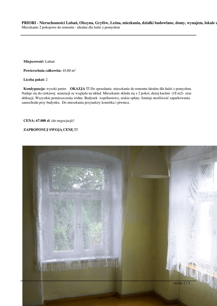 PRIORI - Nieruchomości Lubań, Olszyna, Gryfów, Leśna, miezkania, działki budowlane, domy, wynajem, lokale u Mieszkanie 2 pokojowe do remontu - idealne dla ludzi z pomysłem Miejscowość: Lubań Powierzchnia całkowita: 45,00 m2 Liczba pokoi: 2 Kondygnacja: wysoki parter OKAZJA !!! Do sprzedania mieszkanie do remontu idealne dla ludzi z pomysłem. Nadaje się do ciekawej aranżacji ze względu na układ. Mieszkanie składa się z 2 pokoi, dużej kuchni (18 m2) oraz ubikacji. Wszystkie pomieszczenia widne. Budynek wspólnotowy, niskie opłaty. Istnieje możliwość zaparkowania samochodu przy budynku. Do mieszkania przynależy komórka i piwnica. CENA: 67.000 zł. (do negocjacji)! ZAPROPONUJ SWOJĄ CENĘ !!! strona 1 / 3 PRIORI - Nieruchomości Lubań, Olszyna, Gryfów, Leśna, miezkania, działki budowlane, domy, wynajem, lokale u Mieszkanie 2 pokojowe do remontu - idealne dla ludzi z pomysłem strona 2 / 3 PRIORI - Nieruchomości Lubań, Olszyna, Gryfów, Leśna, miezkania, działki budowlane, domy, wynajem, lokale u Mieszkanie 2 pokojowe do remontu - idealne dla ludzi z pomysłem strona 3 / 3