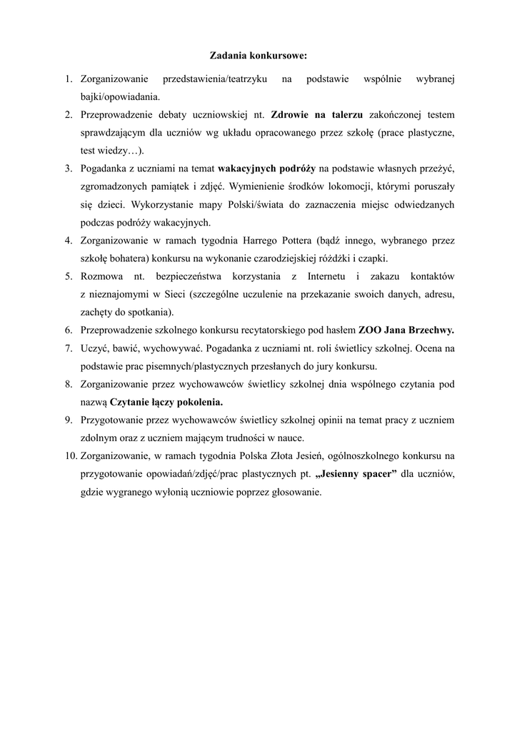 Zadania konkursowe: 1. Zorganizowanie przedstawienia/teatrzyku na podstawie wspólnie wybranej bajki/opowiadania. 2. Przeprowadzenie debaty uczniowskiej nt. Zdrowie na talerzu zakończonej testem sprawdzającym dla uczniów wg układu opracowanego przez szkołę (prace plastyczne, test wiedzy…). 3. Pogadanka z uczniami na temat wakacyjnych podróży na podstawie własnych przeżyć, zgromadzonych pamiątek i zdjęć. Wymienienie środków lokomocji, którymi poruszały się dzieci. Wykorzystanie mapy Polski/świata do zaznaczenia miejsc odwiedzanych podczas podróży wakacyjnych. 4. Zorganizowanie w ramach tygodnia Harrego Pottera (bądź innego, wybranego przez szkołę bohatera) konkursu na wykonanie czarodziejskiej różdżki i czapki. 5. Rozmowa nt. bezpieczeństwa korzystania z Internetu i zakazu kontaktów z nieznajomymi w Sieci (szczególne uczulenie na przekazanie swoich danych, adresu, zachęty do spotkania). 6. Przeprowadzenie szkolnego konkursu recytatorskiego pod hasłem ZOO Jana Brzechwy. 7. Uczyć, bawić, wychowywać. Pogadanka z uczniami nt. roli świetlicy szkolnej. Ocena na podstawie prac pisemnych/plastycznych przesłanych do jury konkursu. 8. Zorganizowanie przez wychowawców świetlicy szkolnej dnia wspólnego czytania pod nazwą Czytanie łączy pokolenia. 9. Przygotowanie przez wychowawców świetlicy szkolnej opinii na temat pracy z uczniem zdolnym oraz z uczniem mającym trudności w nauce. 10. Zorganizowanie, w ramach tygodnia Polska Złota Jesień, ogólnoszkolnego konkursu na przygotowanie opowiadań/zdjęć/prac plastycznych pt. „Jesienny spacer” dla uczniów, gdzie wygranego wyłonią uczniowie poprzez głosowanie.