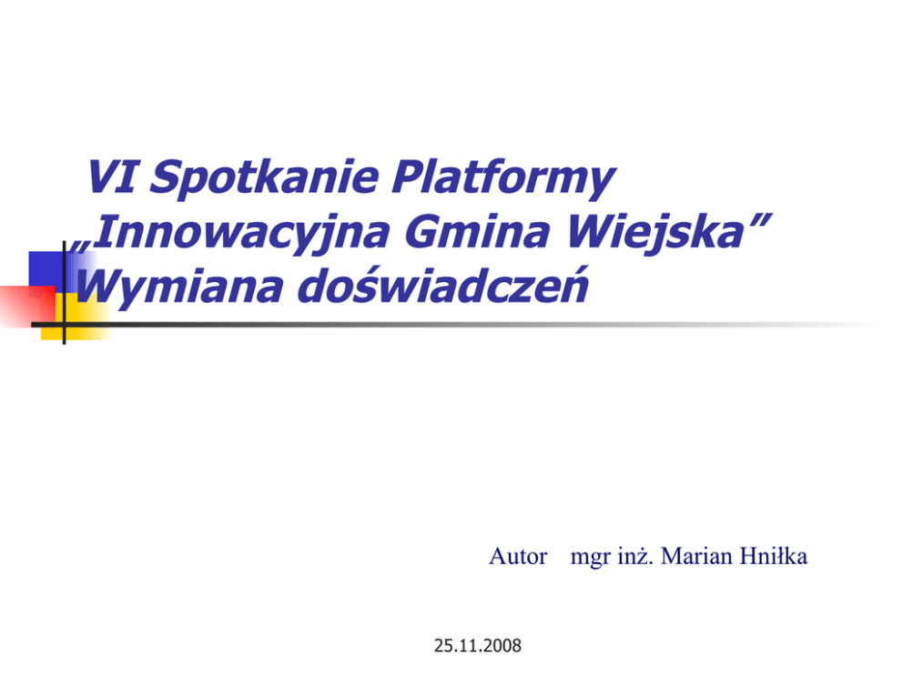 VI Spotkanie Platformy „Innowacyjna Gmina Wiejska” Wymiana doświadczeń Autor mgr inż. Marian Hniłka 25.11.2008 Plan prezentacji Przygotowania do budowy biogazowni. Analiza możliwości wykorzystania ciepła z biogazowni Doświadczenia w budowie sieci radiowej w technologii WiMAX, w terenie górzystym Nowy system gospodarki odpadami w Gminie Zagórz 25.11.2008 Przygotowania do budowy biogazowni Zdecydowano o wyborze terenu pod biogazownię Uzyskano ostateczną decyzję o warunkach zabudowy Opracowano dokumentacje geotechniczna z badaniami gruntu 25.11.2008 Przygotowanie do budowy biogazowni – plan badań geotechnicznych 25.11.2008 Przygotowania do budowy biogazowni – badanie gruntu 25.11.2008 Przygotowania do budowy biogazowni – wyniki badania gruntu 25.11.2008 Analiza wykorzystania ciepła z biogazowni 2 1 1. Teren biogazowni 2. Projektowany zakład odbiór ciepła o mocy 1,1 MW 3. Osiedle mieszkaniowe -moc szczytowa 960kW, ccw- 240 kW 3 25.11.2008 Doświadczenie w budowie sieci WiMAX 25.11.2008 Doświadczenie w budowie sieci WiMAX – zastosowane urządzenia 1 stacja bazowa typ EMAXFDAP-B6AC firmy Axxcelera Antena nadawcza typ AMV2510-90N-S AXX SectorShape 90VP 4 stacja abonenckie typu EMAXHD-CPE3300-C6 firmy Axxcelera Stacja bazowa zamontowana na wysokości 18 m.np.t Urządzenia pracują w trybie FDD w paśmie 3,5 GHz 25.11.2008 Doświadczenie w budowie sieci WiMAX – praca urzązdeń Stacje klienckie przy widoczności anteny pracują poprawnie Stacja kliencka – pomiędzy antenami wysokie drzewa – praca niestabilne, niskie transfery duże opóźnienia (odległość poniżej 1 km) W terenie górzystym i zalesionym nie można liczyć na uzyskanie dobrych zasięgów bez widoczności anteny (duże tłumienie sygnału przez drzewa) 25.11.2008 Nowy system gospodarki odpadami Przejście z sytemu ogólnodostępnych pojemników na odbiór indywidualny z posesji Wprowadzenie identyfikacji klientów w oparciu o kod kreskowy Odpady zmieszane odbierane są w workach – opłata od wagi Surowce wtórne odbierane są bezpłatnie 25.11.2008 Nowy system gospodarki odpadami - identyfikacja 25.11.2008 Nowy system gospodarki odpadami – ważenie i identyfikacja 25.11.2008 Dziękuję za uwagę 25.11.2008