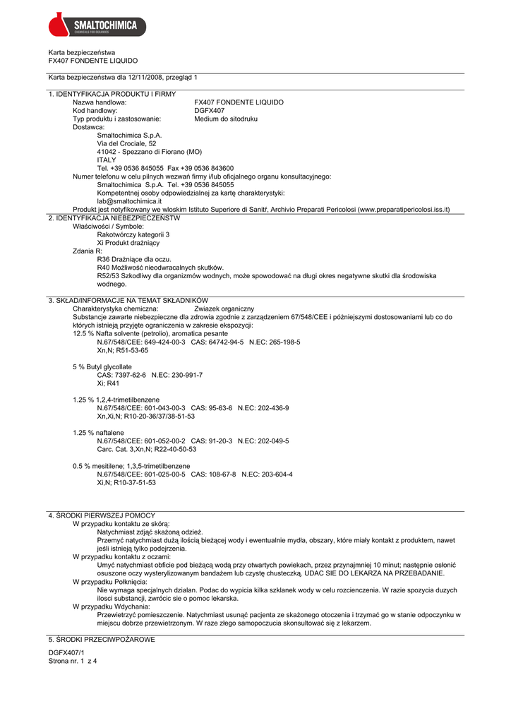 Karta bezpieczeñstwa FX407 FONDENTE LIQUIDO Karta bezpieczeñstwa dla 12/11/2008, przegl±d 1 1. IDENTYFIKACJA PRODUKTU I FIRMY Nazwa handlowa: FX407 FONDENTE LIQUIDO Kod handlowy: DGFX407 Typ produktu i zastosowanie: Medium do sitodruku Dostawca: Smaltochimica S.p.A. Via del Crociale, 52 41042 - Spezzano di Fiorano (MO) ITALY Tel. +39 0536 845055 Fax +39 0536 843600 Numer telefonu w celu pilnych wezwañ firmy i/lub oficjalnego organu konsultacyjnego: Smaltochimica S.p.A. Tel. +39 0536 845055 Kompetentnej osoby odpowiedzialnej za kartê charakterystyki: [email protected] Produkt jest notyfikowany we wloskim Istituto Superiore di Sanità, Archivio Preparati Pericolosi (www.preparatipericolosi.iss.it) 2. IDENTYFIKACJA NIEBEZPIECZEÑSTW W³a¶ciwo¶ci / Symbole: Rakotwórczy kategorii 3 Xi Produkt dra¿ni±cy Zdania R: R36 Dra¿ni±ce dla oczu. R40 Mo¿liwo¶æ nieodwracalnych skutków. R52/53 Szkodliwy dla organizmów wodnych, mo¿e spowodowaæ na d³ugi okres negatywne skutki dla ¶rodowiska wodnego. 3. SK£AD/INFORMACJE NA TEMAT SK£ADNIKÓW Charakterystyka chemiczna: Zwiazek organiczny Substancje zawarte niebezpieczne dla zdrowia zgodnie z zarz±dzeniem 67/548/CEE i pó¿niejszymi dostosowaniami lub co do których istniej± przyjête ograniczenia w zakresie ekspozycji: 12.5 % Nafta solvente (petrolio), aromatica pesante N.67/548/CEE: 649-424-00-3 CAS: 64742-94-5 N.EC: 265-198-5 Xn,N; R51-53-65 5 % Butyl glycollate CAS: 7397-62-6 N.EC: 230-991-7 Xi; R41 1.25 % 1,2,4-trimetilbenzene N.67/548/CEE: 601-043-00-3 CAS: 95-63-6 N.EC: 202-436-9 Xn,Xi,N; R10-20-36/37/38-51-53 1.25 % naftalene N.67/548/CEE: 601-052-00-2 CAS: 91-20-3 N.EC: 202-049-5 Carc. Cat. 3,Xn,N; R22-40-50-53 0.5 % mesitilene; 1,3,5-trimetilbenzene N.67/548/CEE: 601-025-00-5 CAS: 108-67-8 N.EC: 203-604-4 Xi,N; R10-37-51-53 4. ¦RODKI PIERWSZEJ POMOCY W przypadku kontaktu ze skór±: Natychmiast zdj±æ ska¿on± odzie¿. Przemyæ natychmiast du¿± ilo¶ci± bie¿±cej wody i ewentualnie myd³a, obszary, które mia³y kontakt z produktem, nawet je¶li istniej± tylko podejrzenia. W przypadku kontaktu z oczami: Umyæ natychmiast obficie pod bie¿±c± wod± przy otwartych powiekach, przez przynajmniej 10 minut; nastêpnie os³oniæ osuszone oczy wysterylizowanym banda¿em lub czystê chusteczk±. UDAC SIE DO LEKARZA NA PRZEBADANIE. W przypadku Po³kniêcia: Nie wymaga specjalnych dzialan. Podac do wypicia kilka szklanek wody w celu rozcienczenia. W razie spozycia duzych ilosci substancji, zwrócic sie o pomoc lekarska. W przypadku Wdychania: Przewietrzyæ pomieszczenie. Natychmiast usun±æ pacjenta ze ska¿onego otoczenia i trzymaæ go w stanie odpoczynku w miejscu dobrze przewietrzonym. W raze z³ego samopoczucia skonsultowaæ siê z lekarzem. 5. ¦RODKI PRZECIWPO¯AROWE DGFX407/1 Strona nr. 1 z 4 Karta bezpieczeñstwa FX407 FONDENTE LIQUIDO Odpowiednie ¶rodki ga¶nicze: Woda. Ga¶nice zakazane: ¯adna w szczególno¶ci. Ryzyka spalania: Unikaæ wdychania dymów. ¦rodki ochrony: Zastosowaæ os³ony na drogi oddechowe. Specjalne procedury do zwalczania pozaru: Brak. 6. ¦RODKI W RAZIE PRZYPADKOWEGO WYDOSTANIA SIÊ ¦rodki ostro¿no¶ci indywidualne: Za³o¿yæ maskê, rêkawice i odzie¿ ochronn±. ¦rodki ochrony ¶rodowiska: Zasklepiæ ubytki przy u¿yciu ziemi lub piasku. Je¶li produkt jest rozpuszczony w sp³ywie wodnym, sieci kanalizacyjnej lub skazi³ pod³o¿e terenowe lub ro¶linno¶æ, powiadomiæ o tym kompetente w³adze. Metody oczyszczania: Szybko zebraæ produkt po za³o¿eniu maski i odzie¿y ochronnej. Po zebraniu, umyæ wod± zainteresowan± strefê i materia³y. 7. MANIPULACJA I MAGAZYNOWANIE ¦rodki ostro¿no¶ci przy manipulowaniu: Podczas pracy nie je¶æ ani nie piæ. W miare mozliwosci unikac bezposredniego kontaktu z produktem. Ograniczenie narazenia patrz rozdzial 8. Materia³y niekompatybilne: ¯aden w szczególno¶ci. Zobacz równie¿ nastêpny paragraf 10. Warunki sk³adowania: Produkt przechowywac w oryginalnych opakowaniach, zawsze szczelnie zamknietych. Wskazówka dla pomieszczeñ: Pomieszczenia odpowiednio przewietrzone. 8. KONTROLA EKSPOZYCJI/ OCHRONY INDYWIDUALNEJ ¦rodki ostro¿no¶ci: Zapewnic odpowiednia wentylacje pomieszczen, w których jest produkt przechowywany lub poddawany manipulacji, aby utrzymac poziom narazenia ponizej wartosci granicznej. Ochrona dróg oddechowych: Nie wymaga sie przy normalnym zastosowaniu. W specyficznych sytuacjach przy pracy (przyklad: mycie, konserwacja), przy których istnieje mozliwosc nadmiernego narazenia, stosowac maski lub pól-maski do ochrony przed pylem, lub wyposazone w filtr chroniacy przed parami organicznymi, w zaleznosci od charakteru produktu. Z odniesieniem do przepisów UNI EN 149 (pyly), oraz UNI EN 371 (pary organiczne). Ochrona r±k: Uzywac nieprzemakalne rekawice (przyklad: PCV, neopren, guma). Zywotnosc materialu tworzacego strukture zalezy od czestotliwosci i czasu trwania narazenia. Z odniesieniem do przepisów UNI EN 374-1, 374-2, 374-3. Ochrona oczu: Nie wymaga sie przy normalnym zastosowaniu. W razie operacji, które moglyby prowadzic do przypadkowego kontaktu z oczami, uzywac okulary lub maske ochronna. Z odniesieniem do przepisów UNI EN 166. Ochrona skóry: Przy normalnym zastosowaniu nie wymaga specjalnych zabezpieczen. Graniczne wartosci narazenia dla zawartych substancji (Zal. VIII dekretu legislacyjnego 626/94): Graniczne wartosci narazenia (Wytyczna 2000/39/WE): 1,3,5-trimethylbenzene OEL- 8 hours: 100 mg/mc Ograniczenia ekspozycji zawartych substancji: 1,2,4-trimetilbenzene TLV TWA: 100 mg/mc naftalene TLV TWA: 52 mg/mc TLV STEL: 79 mg/mc Kontrola narazenia srodowiska. Urzadzenia wentylacyjne powinny byc wyposazone w odpowiedni system filtrujacy substancje zanieczyszczajace, uniemozliwiajac ich emisje do srodowiska, zgodnie z ustaleniami zawartymi w DPR 203/88). Woda, zawierajaca produkt lub jego resztki, musi byc zebrana. Nie wolno jej odprowadzac do kanalizacji lub wodociagów bez uprzedniej zgody, w mysl odnosnej nor