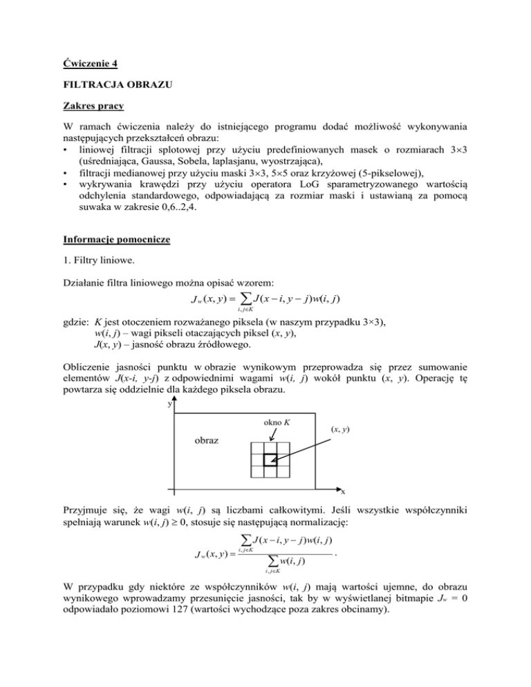 Ćwiczenie 4 FILTRACJA OBRAZU Zakres pracy W ramach ćwiczenia należy do istniejącego programu dodać możliwość wykonywania następujących przekształceń obrazu: • liniowej filtracji splotowej przy użyciu predefiniowanych masek o rozmiarach 33 (uśredniająca, Gaussa, Sobela, laplasjanu, wyostrzająca), • filtracji medianowej przy użyciu maski 33, 55 oraz krzyżowej (5-pikselowej), • wykrywania krawędzi przy użyciu operatora LoG sparametryzowanego wartością odchylenia standardowego, odpowiadającą za rozmiar maski i ustawianą za pomocą suwaka w zakresie 0,6..2,4. Informacje pomocnicze 1. Filtry liniowe. Działanie filtra liniowego można opisać wzorem: J w ( x, y) J ( x i, y j)w(i, j) i , jK gdzie: K jest otoczeniem rozważanego piksela (w naszym przypadku 3×3), w(i, j) – wagi pikseli otaczających piksel (x, y), J(x, y) – jasność obrazu źródłowego. Obliczenie jasności punktu w obrazie wynikowym przeprowadza się przez sumowanie elementów J(x-i, y-j) z odpowiednimi wagami w(i, j) wokół punktu (x, y). Operację tę powtarza się oddzielnie dla każdego piksela obrazu. y okno K (x, y) obraz x Przyjmuje się, że wagi w(i, j) są liczbami całkowitymi. Jeśli wszystkie współczynniki spełniają warunek w(i, j) 0, stosuje się następującą normalizację: J w ( x, y ) J ( x i, y j )w(i, j ) . w(i, j ) i , jK i , jK W przypadku gdy niektóre ze współczynników w(i, j) mają wartości ujemne, do obrazu wynikowego wprowadzamy przesunięcie jasności, tak by w wyświetlanej bitmapie Jw = 0 odpowiadało poziomowi 127 (wartości wychodzące poza zakres obcinamy). Maski filtrów: uśredniająca 1 1 1 1 1 1 1 1 1 Gaussa 1 4 1 4 12 4 1 4 1 Sobela 1 2 0 0 1 2 laplasjanu 2 1 2 0 1 0 wyostrzająca 1 5 1 0 1 0 1 0 1 1 2 1 0 0 0 1 2 1 1 2 4 1 1 2 2. Filtr medianowy. Mediana jest wartością środkową w monotonicznie uporządkowanym ciągu jasności pikseli, które na obrazie pokrywa maska filtra. Typowe maski używane do oczyszczania obrazów za pomocą filtrów medianowych pokazano poniżej. a) a b c d e f g h i b) b d e f h 3. Filtr LoG. Funkcja LoG (Laplacian of Gaussian) jest opisana następującym wzorem: x 2 y 2 2 2 e LoG( x, y ) 4 gdzie jest parametrem zmieniającym się w granicach 0,6..2,4. x2 y 2 2 2 Wykres funkcji LoG to tzw. sombrero (Mexican hat): y x Maska filtra LoG powinna aproksymować kształt powyższej funkcji. Należy ją tworzyć dynamicznie, w zależności od zadanej przez użytkownika wartości parametru . Szerokość maski wyznacza się ze wzoru = 1+2 2.5. Przyjmujemy, że w tym przypadku maska będzie zawierać wagi o wartościach zmiennoprzecinkowych, przeskalowanych tak, by ich suma wynosiła (w przybliżeniu) zero. Wskazówki implementacyjne Podczas implementowania filtrów medianowych warto skorzystać z funkcji std:sort(), np.: #include <algorithm> vector<int> vNeighbors; sort(vNeighbors.begin(), vNeighbors.end()); Aby uzyskać prawidłowy efekt mapy krawędzi po zastosowaniu filtru LoG należy najpierw dodać do wyniku wartość 127 (jak w przypadku filtrów górnoprzepustowych), a następnie zaznaczyć w kolorze czarnym (na białym tle) tylko te punkty, dla których jasność jest nadal mniejsza od 0.