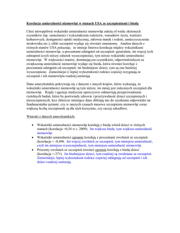 Korelacje umieralności niemowląt w stanach USA ze szczepieniami i biedą Choć niewątpliwie wskaźniki umieralności niemowląt zależą of wielu złożonych czynników (np. zamożności i wykształcenia rodziców, warunków życia, wartości kulturowych, dostępności opieki medycznej, zdrowia matek i rodzin, zanieczyszczenia środowiska etc.), efekt szczepień wydaje się również znamienny. Analiza danych z różnych stanów USA pokazuje, że istnieje liniowa korelacja między wskaźnikami umieralności niemowląt, a procentami odstąpień od szczepień: generalnie, im więcej tych odstapień (czyli niższy odsetek wyszczepienia), tym niższe wskaźniki umieralności niemowląt. W większości stanów, dominującym czynnikiem, odpowiedzialnym za zwiększoną umieralność niemowląt wydaje się bieda, która również koreluje z procentami odstąpień od szczepień: im biedniejsze dzieci, tym są one bardziej wyszczepione. Zamożniejsi (i lepiej wykształceni) rodzice częściej rezygnują ze szczepień i ich niemowlęta rzadziej umierają. Dane amerykańskie pokrywają się z danymi z innych krajów, które wykazują, że wskaźniki umieralności niemowląt są tym niższe, im mniej jest zalecanych szczepień dla niemowląt. Rządy i agencje medyczne uporczywie odmawiają przeprowadzenia rzetelnych badań, które by porównały zdrowie i przeżywalność dzieci szczepionych i nieszczepionych, lecz zbiorczo istniejące dane zbliżają nas do uzyskania odpowiedzi na fundamentalne pytanie: czy w naszych czasach masowe szczepienia niemowląt coraz większą liczbą szczepionek są dla nich korzystne, czy raczej szkodliwe. Wnioski z danych amerykańskich:    Wskaźniki umieralności niemowląt korelują z biedą wśród dzieci w różnych stanach (korelacja =0,54 w r. 2009). Im większa bieda, tym większa umieralność niemowląt. Wskaźniki umieralności ujemnie korelują z procentami zwolnień ze szczepień (korelacja = -0,496. Im więcej zwolnień ze szczepień, tym mniejsza umieralność, czyli im mniejsza wyszczepialność, tym mniejsza umieralność niemowląt. Procenty zwolnień ze szczepień również ujemnie korelują z biedą dzieci (korelacja =-371). Im biedniejsze dzieci, tym rzadziej są zwalniane ze szczepień. Zamożniejsi, lepiej wykształceni rodzice częściej odstępują od szczepień i ich dzieci rzadziej umierają. http://www.usatoday.com/news/health/story/2012-08-19/schoolchildrenvaccinations/57146910/1 http://www.mchb.hrsa.gov/chusa10/state/pdfs/406inmTsmr.pdf http://het.sagepub.com/content/30/9/1420.full.pdf+html http://www.census.gov/prod/2011pubs/acsbr10-05.pdf
