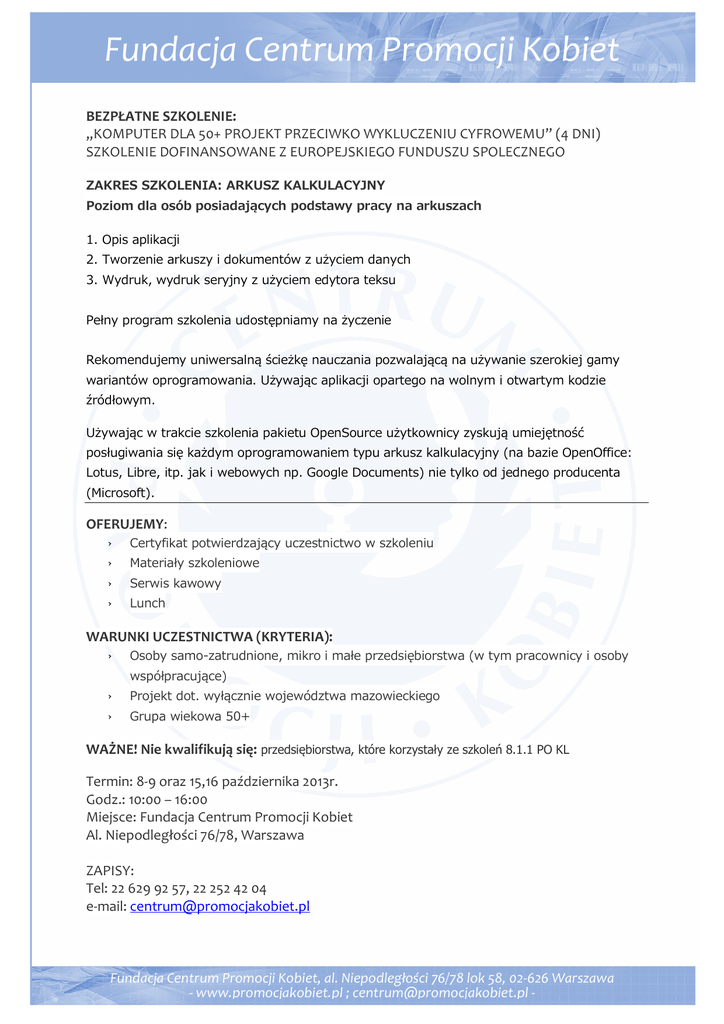 Fundacja Centrum Promocji Kobiet BEZPŁATNE SZKOLENIE: „KOMPUTER DLA 50+ PROJEKT PRZECIWKO WYKLUCZENIU CYFROWEMU” (4 DNI) SZKOLENIE DOFINANSOWANE Z EUROPEJSKIEGO FUNDUSZU SPOLECZNEGO ZAKRES SZKOLENIA: ARKUSZ KALKULACYJNY Poziom dla osób posiadających podstawy pracy na arkuszach 1. Opis aplikacji 2. Tworzenie arkuszy i dokumentów z użyciem danych 3. Wydruk, wydruk seryjny z użyciem edytora teksu Pełny program szkolenia udostępniamy na życzenie Rekomendujemy uniwersalną ścieżkę nauczania pozwalającą na używanie szerokiej gamy wariantów oprogramowania. Używając aplikacji opartego na wolnym i otwartym kodzie źródłowym. Używając w trakcie szkolenia pakietu OpenSource użytkownicy zyskują umiejętność posługiwania się każdym oprogramowaniem typu arkusz kalkulacyjny (na bazie OpenOffice: Lotus, Libre, itp. jak i webowych np. Google Documents) nie tylko od jednego producenta (Microsoft). OFERUJEMY: › Certyfikat potwierdzający uczestnictwo w szkoleniu › Materiały szkoleniowe › Serwis kawowy › Lunch WARUNKI UCZESTNICTWA (KRYTERIA): › Osoby samo-zatrudnione, mikro i małe przedsiębiorstwa (w tym pracownicy i osoby współpracujące) › Projekt dot. wyłącznie województwa mazowieckiego › Grupa wiekowa 50+ WAŻNE! Nie kwalifikują się: przedsiębiorstwa, które korzystały ze szkoleń 8.1.1 PO KL Termin: 8-9 oraz 15,16 października 2013r. Godz.: 10:00 – 16:00 Miejsce: Fundacja Centrum Promocji Kobiet Al. Niepodległości 76/78, Warszawa ZAPISY: Tel: 22 629 92 57, 22 252 42 04 e-mail: [email protected] Fundacja Centrum Promocji Kobiet, al. Niepodległości 76/78 lok 58, 02-626 Warszawa - www.promocjakobiet.pl ; [email protected] - 1 Fundacja Centrum Promocji Kobiet Opinie uczestników I edycji po szkoleniu: Dowiedziałam się wielu przydatnych rzeczy, nie tylko o arkuszu kalkulacyjnym. Pomogło to w sprawniejszej obsłudze również innych programów komputerowych, a także w zabezpieczeniach antywirusowych. Barbara, 58 lat. Kurs bardzo przydatny, zakres tematyczny ok. Może trochę więcej przykładów ćwiczeń. Bardzo polecam. Anna, 59 lat. Bardzo mi się podobało. Nie boję się już komputera i mogę swobodnie poruszać się w Internecie i w programach komputerowych. Ewa, 57 lat. Bardzo potrzebny. Odpowiednio dobrana grupa docelowa słuchaczy i materiałów szkoleniowych. Program kursu zapewnia podniesienie kwalifikacji obsługującego komputer użytkownika. Adam, 54 lata. Wysoka ocena wiedzy prowadzących i chęć jej przekazania. Zabrakło natomiast programu i metodyki zajęć. Wiele się dowiedziałam, ale nazwałabym to pogadankami przy komputerze. Bardzo fajne. Barbara, 69 lat. Kurs przydatny dla osób z niewielką wiedzą o komputerze. Praktyczne informacje, choć nie do końca tylko o arkuszu kalkulacyjnym, które zwiększą odwagę, ośmielą do korzystania z komputera. Małgorzata, 52 lata. Bardzo przydatne szkolenie, pozwalające uświadomić sobie o możliwościach pracy z komputerem. Uważam, że 4 dni programowe to stanowczo za mało, by wprowadzić w życie zasygnalizowaną wiedzę. Bronisław, 60 lat. Bardzo pomocny, praktyczny kurs komputerowy z zakresu Worda i Excela. Instruktorzy życzliwi, cierpliwie odpowiadali na pytania uczestników. Monika, 57 lat. Bardzo dobre szkolenie. Przydałoby się parę dni dodatkowych warsztatów, by pogłębić wiedzę teoretyczną i ćwiczenia. Halina, 56 lat. Fundacja Centrum Promocji Kobiet, al. Niepodległości 76/78 lok 58, 02-626 Warszawa - www.promocjakobiet.pl ; [email protected] - 2