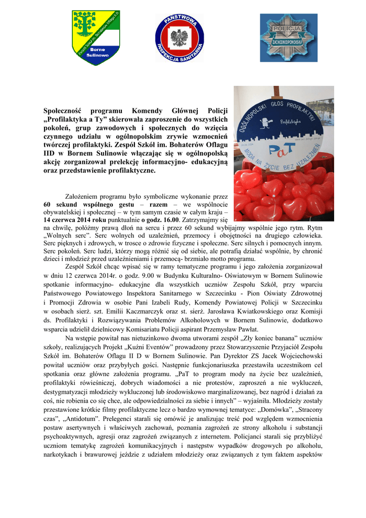 Społeczność programu Komendy Głównej Policji „Profilaktyka a Ty” skierowała zaproszenie do wszystkich pokoleń, grup zawodowych i społecznych do wzięcia czynnego udziału w ogólnopolskim zrywie wzmocnień twórczej profilaktyki. Zespół Szkół im. Bohaterów Oflagu IID w Bornem Sulinowie włączając się w ogólnopolską akcję zorganizował prelekcję informacyjno- edukacyjną oraz przedstawienie profilaktyczne. Założeniem programu było symboliczne wykonanie przez 60 sekund wspólnego gestu – razem – we wspólnocie obywatelskiej i społecznej – w tym samym czasie w całym kraju – 14 czerwca 2014 roku punktualnie o godz. 16.00. Zatrzymajmy się na chwilę, połóżmy prawą dłoń na sercu i przez 60 sekund wybijajmy wspólnie jego rytm. Rytm „Wolnych serc”. Serc wolnych od uzależnień, przemocy i obojętności na drugiego człowieka. Serc pięknych i zdrowych, w trosce o zdrowie fizyczne i społeczne. Serc silnych i pomocnych innym. Serc pokoleń. Serc ludzi, którzy mogą różnić się od siebie, ale potrafią działać wspólnie, by chronić dzieci i młodzież przed uzależnieniami i przemocą- brzmiało motto programu. Zespół Szkół chcąc wpisać się w ramy tematyczne programu i jego założenia zorganizował w dniu 12 czerwca 2014r. o godz. 9.00 w Budynku Kulturalno- Oświatowym w Bornem Sulinowie spotkanie informacyjno- edukacyjne dla wszystkich uczniów Zespołu Szkół, przy wparciu Państwowego Powiatowego Inspektora Sanitarnego w Szczecinku - Pion Oświaty Zdrowotnej i Promocji Zdrowia w osobie Pani Izabeli Rudy, Komendy Powiatowej Policji w Szczecinku w osobach sierż. szt. Emilii Kaczmarczyk oraz st. sierż. Jarosława Kwiatkowskiego oraz Komisji ds. Profilaktyki i Rozwiązywania Problemów Alkoholowych w Bornem Sulinowie, dodatkowo wsparcia udzielił dzielnicowy Komisariatu Policji aspirant Przemysław Pawłat. Na wstępie powitał nas nietuzinkowo dwoma utworami zespół „Zły koniec banana” uczniów szkoły, realizujących Projekt „Kuźni Eventów” prowadzony przez Stowarzyszenie Przyjaciół Zespołu Szkół im. Bohaterów Oflagu II D w Bornem Sulinowie. Pan Dyrektor ZS Jacek Wojciechowski powitał uczniów oraz przybyłych gości. Następnie funkcjonariuszka przestawiła uczestnikom cel spotkania oraz główne założenia programu. „PaT to program mody na życie bez uzależnień, profilaktyki rówieśniczej, dobrych wiadomości a nie protestów, zaproszeń a nie wykluczeń, destygmatyzacji młodzieży wykluczonej lub środowiskowo marginalizowanej, bez nagród i działań za coś, nie robienia co się chce, ale odpowiedzialności za siebie i innych” – wyjaśniła. Młodzieży zostały przestawione krótkie filmy profilaktyczne lecz o bardzo wymownej tematyce: „Domówka”, „Stracony czas”, „Antidotum”. Prelegenci starali się omówić je analizując treść pod względem wzmocnienia postaw asertywnych i właściwych zachowań, poznania zagrożeń ze strony alkoholu i substancji psychoaktywnych, agresji oraz zagrożeń związanych z internetem. Policjanci starali się przybliżyć uczniom tematykę zagrożeń komunikacyjnych i następstw wypadków drogowych po alkoholu, narkotykach i brawurowej jeździe z udziałem młodzieży oraz związanych z tym faktem aspektów prawnych. Natomiast Pani Izabela Rudy skupiła się na elemencie zdrowotnym związanym z bezpieczeństwem uczniów podczas spędzania wakacji. W związku ze zgodnością tematyczną uczniom zostały wręczone nagrody z dwóch konkursów profilaktycznych. W VI Gminnym Konkursie Plastyczny „ Granice Wolności” jury postanowiło przyznać: I miejsce – Monice Balickiej uczennicy Gimnazjum ZS w Bornem Sulinowie, II miejsce –Oktawii Zygadło uczennicy Gimnazjum ZS w Łubowie, III miejsce – Mai Bykowskiej uczennicy Gimnazjum ZS w Bornem Sulinowie oraz wyróżnienie dla uczennicy ZS w Łubowie Adrianny Czaplińskiej za pomysł i ciekawą technikę pracy. Natomiast w VI Gminnym Konkursie Literackim „ Opowiedz mi swoją historię…” jury przyznało nagrody: I miejsce – Julii Galikowskiej uczennicy Gimnazjum w Bornem Sulinowie, II miejsce –Oliwii Malinowskiej uczennicy Gimnazjum w Bornem Sulinowie, III miejsce – Kinga Kubiak uczennicy Gimnazjum w Bornem Sulinowie. Nagrody zostały ufundowane przez Gminną Komisję Rozwiązywania Problemów Alkoholowych w Bornem Sulinowie oraz Stację Sanitarno Epidemiologiczną w Szczecinku. Natomiast 13 czerwca 2014r. godz. 10.00 w ramach działań PaT odbył się spektakl o tematyce dotyczącej profilaktyki narkomanii, wykonany przez szkolną grupę teatralną BETON (borneńską ekipę teatralną optymistycznie nastawionych) pt.„ Mój drogi przyjacielu”, którego opiekunkami są Pani Magdalena Szyło oraz Pani Iwona Gajewska- Tranbowicz. Biletem wstępu było przyklejenie na piersi czerwonego serca- naklejki rozdawanej przez uczniów. Na koniec, uczniowie wraz z całym gronem pedagogicznym przy rytmie bijącego serca, wykonali symboliczny gest - „Rytm wolnych serc”. Po spektaklu wychodzący uczniowie otrzymali balony w kształcie serca z hasłem programu „Moda na życie bez uzależnień”. Pani dyrektor SANEPID Pani Barbara Szysz oraz Pan dyrektor ZS Jacek Wojciechowski otrzymali podziękowania z rąk podkom. Tomasza Bykowskiego za umożliwienie KPP w Szczecinku realizacji programu oraz za udzielone wsparcie merytoryczne. Reakcje widzów, uczniów jak i ich opiekunów, oraz wypowiedzi po dwóch dniach profilaktyki pozwalają sądzić, że warto organizować w Bornem Sulinowie takie przedsięwzięcia.