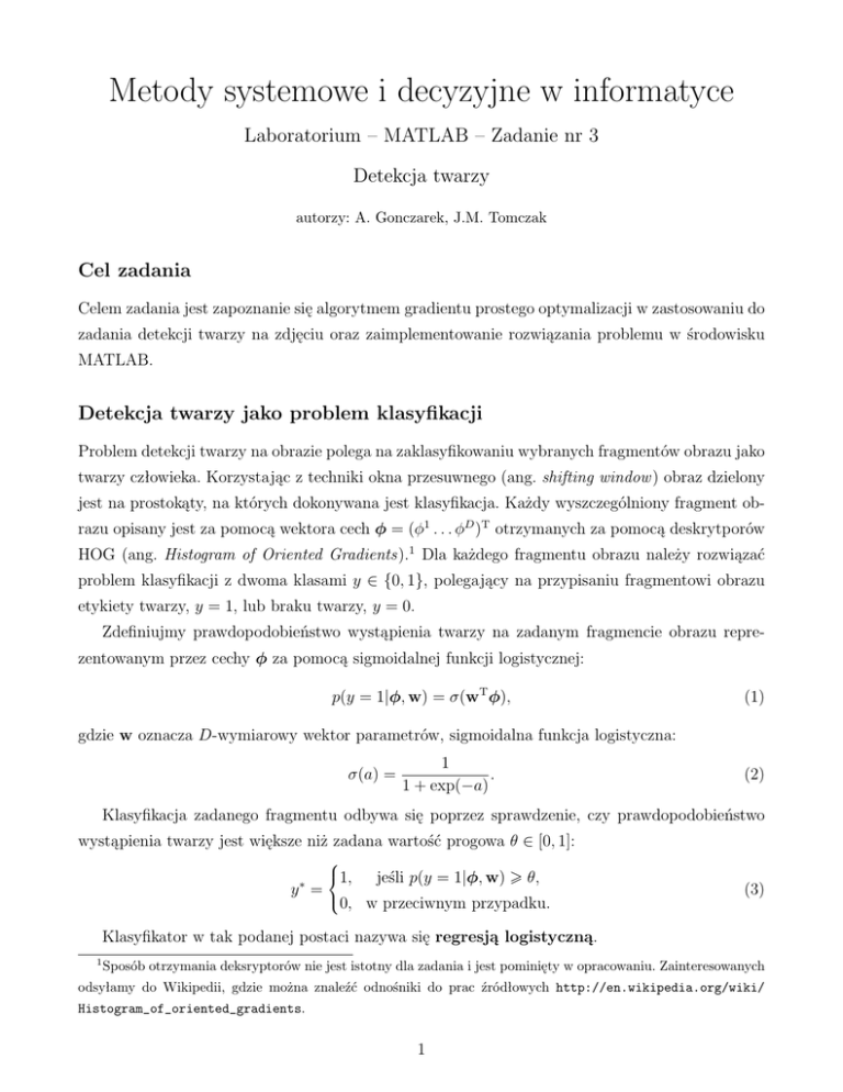 HOG (ang. Histogram of Oriented Gradients).1 Dla każdego fragmentu obrazu należy rozwiązać