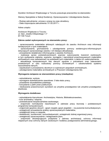 Dyrektor Archiwum Wojskowego w Toruniu poszukuje pracownika na stanowisko: Starszy Specjalista w Sekcji Ewidencji, Opracowywania i Udostępniania Zasobu. - Rodzaj zatrudnienia: umowa o pracę na czas określony. - Data rozpoczęcia zatrudnienia: 01.02.2017 r. Adres urzędu: Archiwum Wojskowe w Toruniu ul. Gen. Józefa Chłopickiego 1-7 87-100 Toruń Zakres zadań wykonywanych na stanowisku pracy: - opracowywanie materiałów aktowych należących do zasobu Archiwum oraz informacji tematycznych o tych materiałach, - opracowywanie, gromadzenie i udostępnianie pomocy ewidencyjno-informacyjnych dotyczących opracowanego zasobu i ich bieżąca aktualizacja, - prowadzenie działalności informacyjnej o zasobie Archiwum, - realizacja spraw poświadczeniowych poprzez wykonywanie kwerend osobowych, w tym wydawanie odpisów, wypisów, wyciągów i reprodukcji przechowywanych materiałów archiwalnych oraz zaświadczeń na podstawie tych materiałów, a także ich uwierzytelnienie, - aktualizacja komputerowych baz danych zgodnie z potrzebami oraz zaleceniami przełożonych w celu rozbudowy pomocy archiwalnych i udoskonalenia systemu wyszukiwania danych, - współudział w prowadzeniu skontrum w wybranych zespołach archiwalnych, - udostępnianie materiałów archiwalnych w Pracowni Udostępniania Akt. Wymagania związane ze stanowiskiem pracy (niezbędne): - wykształcenie: wyższe, - wymagane doświadczenie zawodowe: 3 lata stażu pracy, - posiadanie obywatelstwa polskiego, - korzystanie z pełni praw publicznych, - nieskazanie prawomocnym wyrokiem za umyślne przestępstwo lub umyślne przestępstwo skarbowe. Wymagania dodatkowe: - wykształcenie kierunkowe: Archiwistyka, Historia, Bibliotekoznawstwo, - kurs archiwalny I stopnia, - poświadczenie bezpieczeństwa osobowego, - znajomość normatywów resortowych w zakresie pracy biurowej i podstawowych programów komputerowych, - znajomość języków obcych - język rosyjski, język angielski – na poziomie komunikatywnym, - umiejętność prowadzenia analizy opracowywanych materiałów, - umiejętność pracy w zespole, - dokładność, sumienność, komunikatywność, umiejętność dobrej organizacji pracy, - umiejętność opracowywania i redagowania pism, - znajomość obowiązujących przepisów z zakresu archiwizacji, ochrony informacji niejawnych oraz ochrony danych osobowych i kodeksu postępowania administracyjnego. 1 Dokumenty i oświadczenia niezbędne: - życiorys i list motywacyjny, kopie dokumentów potwierdzających spełnienie wymagania niezbędnego w zakresie wykształcenia, - kopia dokumentu potwierdzającego posiadanie polskiego obywatelstwa lub oświadczenie o posiadaniu obywatelstwa polskiego, - kopia poświadczenia bezpieczeństwa uprawniającego do dostępu do informacji niejawnych oznaczonych klauzulą „Tajne”, - w przypadku braku poświadczenia bezpieczeństwa oświadczenie o wyrażeniu zgody na przeprowadzenie postępowania sprawdzającego zgodnie z ustawą z dnia 5 sierpnia 2010 r. o ochronie informacji niejawnych (Dz. U. Nr 182, poz. 1228), - kopie dotychczasowych świadectw pracy potwierdzających posiadanie doświadczenia w pracy w wymiarze co najmniej 3 lat, - oświadczenie o wyrażeniu zgody na przetwarzanie danych osobowych do celów rekrutacji, - oświadczenie o korzystaniu z pełni praw publicznych, - oświadczenie o nieskazaniu prawomocnym wyrokiem za umyślne przestępstwo lub umyślne przestępstwo skarbowe. Dokumenty i oświadczenia dodatkowe: - kopia dokumentu potwierdzającego niepełnosprawność (w przypadku posiadania), - świadectwo ukończenia kursu archiwalnego I stopnia. Terminy i miejsce składania dokumentów: - dokumenty należy złożyć do: 25.01.2017 r. - decyduje data : wpływu oferty do urzędu, - miejsce składnia dokumentów: Archiwum Wojskowe w Toruniu ul. gen. Józefa Chłopickiego 1-7 87 – 100 Toruń Informacje inne: - kandydaci/kandydatki zakwalifikowani/e zostaną poinformowani o terminie testu i rozmowy wstępnej, - dokumenty złożone w formie aplikacji nie będą zwracane, - wymagane dokumenty i oświadczenia muszą być podpisane własnoręcznie, - aplikację proszę składać w kopercie z dopiskiem „Oferta pracy na stanowisko starszego specjalisty w Sekcji Ewidencji, Opracowywania i Udostępniania Zasobu”, - oferty złożone po terminie nie będą rozpatrywane, - oferty złożone po terminie oraz oferty rozpatrzone negatywnie zostaną komisyjnie zniszczone po zakończeniu procedury rekrutacji, - dodatkowe informacje można uzyskać pod nr tel. 261-432-917 w godz. 8.00-14.00, - budynek nie jest dostosowany dla potrzeb osób niepełnosprawnych, bez podjazdu dla wózków inwalidzkich, w budynku brak windy osobowej. 2