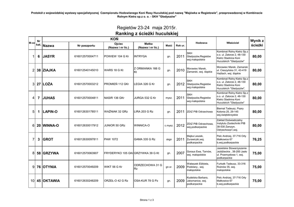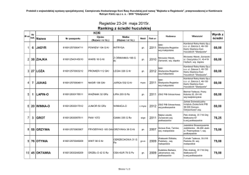 Protokół z wojewódzkiej wystawy specjalistycznej Czempionatu Hodowlanego Koni Rasy Huculskiej pod nazwą "Majówka w Regietowie", przeprowadzonej w Kombinacie Rolnym Kietrz sp.z o. o. - SKH "Gładyszów" Regietów 23-24 maja 2015r. Ranking z ścieżki huculskiej M-ce Nr kat. KOŃ Nazwa Nr paszportu Ojciec (Nazwa i nr lic.) Matka (Nazwa i nr lic.) Hodowca Maść Właściciel Wynik z ścieżki Kombinat Rolny Kietrz Sp.z o.o. ul. Zatorze 2, 48-130 Kietrz Stadnina Koni Huculskich "Gładyszów" 80,00 Morawiec Marek, Zamarski ul. Cieszyńska 31, 43-419 Hażlach, woj. śląskie 80,00 Rok ur. 1 6 JASYR 616012570004711 POWIEW 104 G Kr INTRYGA gn. 2011 SKH Gładyszów,Regietów woj.małopolskie 2 38 ZIAJKA 616012540145010 WARS 18 G Kt Z ORMIANKA 166 G Kt gn. 2010 Morawiec Marek, Zamarski, woj. śląskie Kombinat Rolny Kietrz Sp.z o.o. ul. Zatorze 2, 48-130 Kietrz Stadnina Koni Huculskich "Gładyszów", woj.opolskie Kombinat Rolny Kietrz Sp.z o.o. ul. Zatorze 2, 48-130 Kietrz Stadnina Koni Huculskich "Gładyszów" 3 27 LOŻA 616012570003212 PROMIEŃ 112 GKr LEGIA 326 G Kr gn. 2012 SKH Gładyszów,Regietów woj.małopolskie 4 7 JUHAS 616012570004811 NASIR 136 GKr JURGA 532 G Kr mysz. 2011 SKH Gładyszów,Regietów woj.małopolskie 5 1 LAPIN-O 616012630178511 WAŻNIAK 32 GRz LIRA 203 G Rz gn. 2011 ZDIZ PIB Odrzechowa 6 20 WINNA-O 616012630017912 JUNIOR 50 GRz WINNICA-O c.mysz. 2012 ZDIZ PIB Odrzechowa, woj.podkarpackie 7 3 GROT 616012630097811 PAW 1072 GAMA 335 G Rz skgn 2011 Majka Leszek, Żurawiczki,woj. podkarpackie 8 58 GRZYWA 616012570063907 FRYDERYKO 105 GKr GRZYWKA 39 G Kt gn. 2007 Goraus Ewa, Tarnów, woj. malopolskie Jasielskie Stowarzyszenie Jeźdźieckie , 38-200 Jasło ul. Przemysłowa 1, woj. podkarpackie 75,00 9 76 OTYNIA 616012570049209 WIKT 56 G Kr ODRZECHOWA 31 G Rz gn.sr. 2009 Wałaszek Elżbieta, Podolany , woj. małopolskie Furkatk Tadeusz, 33-316 Rożnów 35, woj. malopolskie 75,00 10 45 OKTAWIA 616012630248209 ORZEŁ-O 42 G Rz OSA-KUR 78 G Pz gn. 2009 Kudelska Barbara, Jaksmanice, woj. podkarpackie Pelc Andrzej, 37-716 Orły Małkowice 67 b,woj.podkarpackie 75,00 Strona 1 z 3 Biernat Tadeusz, Psary Kolonia 25, 29-145 woj.świętokrzyskie Zakład Doświadczalny Instytutu Zootechniki PIB 38-530 Zarszyn, Odrzechowa1,woj. podkarpackie, Pelc Andrzej, 37-716 Orły Małkowice 67 b,woj.podkarpackie 80,00 80,00 80,00 80,00 76,25 M-ce Nr kat. KOŃ Nazwa Nr paszportu Ojciec (Nazwa i nr lic.) Matka (Nazwa i nr lic.) Hodowca j.gn. 2011 Gajewski Stanisław Plecka Dąbrowa,woj. łódzkie Biernat Tadeusz, Psary Kolonia 25, 29-145 woj.świętokrzyskie 74,75 gn.sr. 2011 ZDIZ PIB Odrzechowa Marek Andrzej, Bujaków, ul. Stawowa 10, 43-356 Kobiernice, woj. śląskie 72,00 616012590071311 HASAN Z SADYBY 16 GŁd LOTKA 40 G Łd 12 2 WAFELEK -O 616012630178111 ZEFIREK 12 G Lb WSTĘGA 55 G Rz 13 18 JEŻÓWKA 616012570003712 LEN 2113 ISKRA 314 G Kr c.mysz. 2012 SKH Gładyszów,Regietów woj.małopolskie 14 24 FABUŁA 616012570002112 POWIEW 104 G Kr FLANKA 416 G Kr c.mysz. 2012 SKH Gładyszów,Regietów woj.małopolskie 15 35 JONKA Z IZB 616012570113911 LIMER 149 G Kr IKRA 37 G Kr mysz. 2011 16 21 LINIA 616012570003512 NASIR 136 GKr LIGAWKA 327 G Kr c.mysz. 2012 17 22 GAŻA 616012570004112 NAGAN 135 GKr GRAŻDA 92 G Kr mysz. 2012 616012630063511 SAMBOR -W GIRGONIA 171 G Rz 19 29 WENECJA 616012540007212 AMANT-W 19 G Kt WOSEBA 165 G Kt JUNIOR 50 GRz GNIEWOSZÓWKA 44 G Rz 20 30 GILA-O 616012630179311 Strona 2 z 3 Wynik z ścieżki Rok ur. 11 4 LOTEK 18 5 AZJA-W Właściciel Maść Kombinat Rolny Kietrz Sp.z o.o. ul. Zatorze 2, 48-130 Kietrz Stadnina Koni Huculskich "Gładyszów", woj.opolskie Kombinat Rolny Kietrz Sp.z o.o. ul. Zatorze 2, 48-130 Kietrz Stadnina Koni Huculskich "Gładyszów", woj.opolskie Gosp.Rolne Astir w Izbach Gosp.Rolne Astir w Jan Rączka, 31-128 Izbach Jan Rączka, Kraków ul.Karmelicka 8/5 Kraków, woj. małopolsie A, woj. małopolsie Kombinat Rolny Kietrz Sp.z SKH o.o. ul. Zatorze 2, 48-130 Gładyszów,Regietów Kietrz Stadnina Koni woj.małopolskie Huculskich "Gładyszów", woj.opolskie Kombinat Rolny Kietrz Sp.z SKH o.o. ul. Zatorze 2, 48-130 Gładyszów,Regietów Kietrz Stadnina Koni woj.małopolskie Huculskich "Gładyszów", woj.opolskie Górski Krystian, Jodłówka 225, 37-560 Pruchnik, woj. podkarpackie 72,00 70,50 66,00 65,75 61,00 mysz.sr. 2011 BPN Ustrzyki Górne, woj. podkarpackie c.gn. 2012 Marek Andrzej, Bujaków, Marek Andrzej, Bujaków, Stawowa 10,43-356, woj.śląskie Kobiernice, woj.śląskie 55,00 2011 ZDIZ PIB Odrzechowa, woj.podkarpackie Zakład Doświadczalny Instytutu Zootechniki PIB 38-530 Zarszyn, Odrzechowa1,woj. podkarpackie, 55,00 kara 56,50 M-ce Nr kat. KOŃ Nazwa Nr paszportu Ojciec (Nazwa i nr lic.) Matka (Nazwa i nr lic.) 21 36 WIZJA Z IZB 616012570113711 LIMER 149 G Kr 22 23 FASOLKA 616012570003112 CZERCHAN 155 G Kr FRAZA 9640 Podpis sędziego głównego: Maciej Jackowski JAUTA 151 G Kr Hodowca Maść Rok ur. mysz. 2011 c.mysz. 2012 Gosp.Rolne Astir w Izbach Gosp.Rolne Astir w Jan Rączka, 31-128 Izbach Jan Rączka, Kraków ul.Karmelicka 8/5 Kraków, woj. małopolsie A, woj. małopolsie Kombinat Rolny Kietrz Sp.z SKH o.o. ul. Zatorze 2, 48-130 Gładyszów,Regietów Kietrz Stadnina Koni woj.małopolskie Huculskich "Gładyszów", woj.opolskie ……………………………………………………. © MZHK Kraków Strona 3 z 3 Właściciel Wynik z ścieżki 54,50 rezygnacja