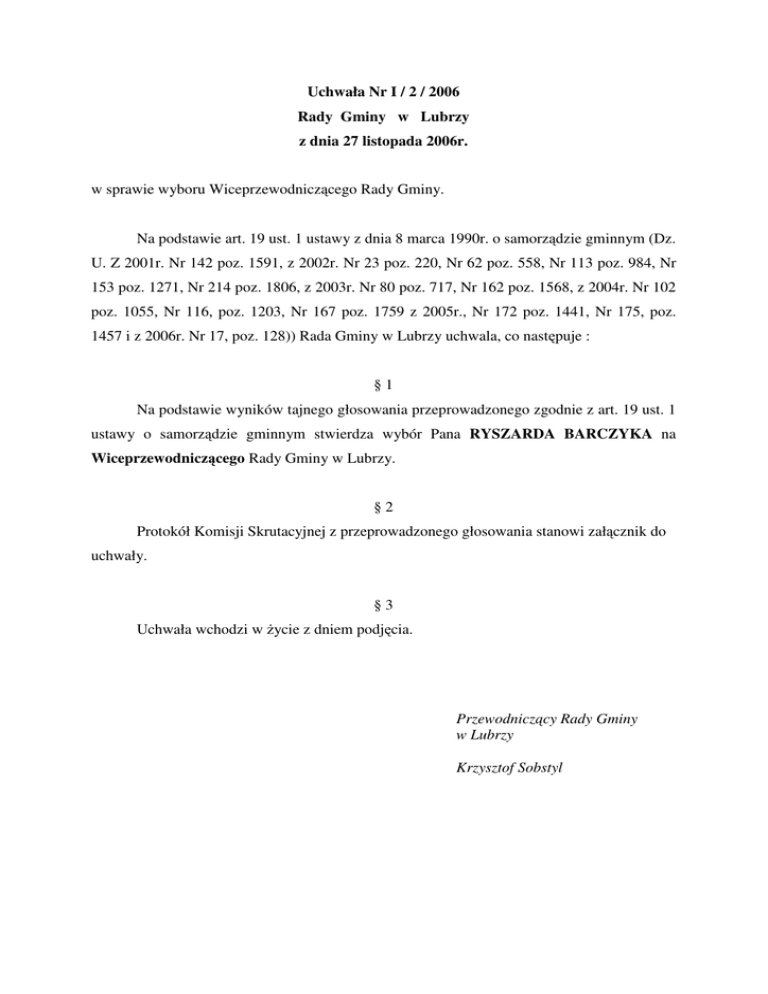 Uchwała Nr I / 2 / 2006 Rady Gminy w Lubrzy z dnia 27 listopada 2006r. w sprawie wyboru Wiceprzewodnicz cego Rady Gminy. Na podstawie art. 19 ust. 1 ustawy z dnia 8 marca 1990r. o samorz dzie gminnym (Dz. U. Z 2001r. Nr 142 poz. 1591, z 2002r. Nr 23 poz. 220, Nr 62 poz. 558, Nr 113 poz. 984, Nr 153 poz. 1271, Nr 214 poz. 1806, z 2003r. Nr 80 poz. 717, Nr 162 poz. 1568, z 2004r. Nr 102 poz. 1055, Nr 116, poz. 1203, Nr 167 poz. 1759 z 2005r., Nr 172 poz. 1441, Nr 175, poz. 1457 i z 2006r. Nr 17, poz. 128)) Rada Gminy w Lubrzy uchwala, co nast puje : §1 Na podstawie wyników tajnego głosowania przeprowadzonego zgodnie z art. 19 ust. 1 ustawy o samorz dzie gminnym stwierdza wybór Pana RYSZARDA BARCZYKA na Wiceprzewodnicz cego Rady Gminy w Lubrzy. §2 Protokół Komisji Skrutacyjnej z przeprowadzonego głosowania stanowi zał cznik do uchwały. §3 Uchwała wchodzi w ycie z dniem podj cia. Przewodnicz cy Rady Gminy w Lubrzy Krzysztof Sobstyl Protokół Komisji Skrutacyjnej powołanej na sesji Rady Gminy w Lubrzy w dniu 27 listopada 2006r. dla przeprowadzenia wyboru Przewodnicz cego Rady Gminy w Lubrzy Komisja w składzie : - Przewodnicz cy – Ryszard Barczyk - członek – Robert Smole - członek- Mieczysław Kras Stwierdza, e : 1. W głosowaniu wzi ło udział 15 radnych Rady Gminy w Lubrzy 2. Zgłoszono nast puj cych kandydatów na Przewodnicz cego Rady Gminy : - KRZYSZTOF SOBSTYL - LILLA G SIOR 3. Przeprowadzono tajne głosowanie zgodnie z art. 19 ustawy o samorz dzie gminnym. Głosów wa nych oddano – 14 Głosów niewa nych oddano – 0 Głosów „wstrzymuj cych si ” - 1 4. Zgłoszeni kandydaci otrzymali nast puj c ilo głosów : - KRZYSZTOF SOBSTYL - 10 - głosów - LILLA G SIOR - 4 - głosów 5. Wobec powy szego Komisja stwierdza, e Przewodnicz cym Rady Gminy został wybrany KRZYSZTOF SOBSTYL Podpisy członków Komisji ………………………………………….. …………………………………………… …………………………………………… Lubrza, dn. 2006-11-27 Protokół Komisji Skrutacyjnej powołanej na sesji Rady Gminy w Lubrzy w dniu 27 listopada 2006r. dla przeprowadzenia wyboru Wiceprzewodnicz cego Rady Gminy w Lubrzy Komisja w składzie : - Przewodnicz cy – Mieczysław Kras - członek – Andrzej Kału a - członek- Łukasz Hanusiak Stwierdza, e : 3. W głosowaniu wzi ło udział 15 radnych Rady Gminy w Lubrzy 4. Zgłoszono nast puj cych kandydatów na Wiceprzewodnicz cego Rady Gminy : - Ryszard Barczyk - Ryszard Surmiak 3. Przeprowadzono tajne głosowanie zgodnie z art. 19 ustawy o samorz dzie gminnym. Głosów wa nych oddano – 15 Głosów niewa nych oddano – 0 Głosów „wstrzymuj cych si ” - 0 4. Zgłoszeni kandydaci otrzymali nast puj c ilo głosów : - Ryszard Barczyk - 9 - głosów - Ryszard Surmiak - 6 - głosów 5. Wobec powy szego Komisja stwierdza, e Wiceprzewodnicz cym Rady Gminy został wybrany Pan Ryszard Barczyk Podpisy członków Komisji ………………………………………….. …………………………………………… ……………………………………………
