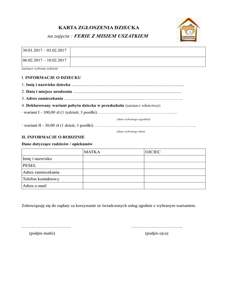 KARTA ZGŁOSZENIA DZIECKA na zajęcia : FERIE Z MISIEM USZATKIEM 30.01.2017 – 03.02.2017 06.02.2017 – 10.02.2017 (zaznacz wybrany tydzień) I. INFORMACJE O DZIECKU 1. Imię i nazwisko dziecka ....................................................................................................... 2. Data i miejsce urodzenia ................................................................................................... 3. Adres zamieszkania .......................................................................... ……………………. 4. Deklarowany wariant pobytu dziecka w przedszkolu (zaznacz właściwe): wariant I - 100,00 zł (1 tydzień; 3 posiłki) ……………………………………………………... (data wybranego tygodnia) wariant II - 30,00 zł (1 dzień; 3 posiłki) …………………………………………………………………….. (data wybranego dnia) II. INFORMACJE O RODZINIE Dane dotyczące rodziców / opiekunów MATKA OJCIEC Imię i nazwisko PESEL Adres zamieszkania Telefon kontaktowy Adres e-mail Zobowiązuję się do zapłaty za korzystanie ze świadczonych usług zgodnie z wybranym wariantem. ……………………………. (podpis matki) …………………………….. (podpis ojca) Ważne informacje o dziecku: (np. specjalna dieta, uczulenia, przyzwyczajenia, inne…) ………………………………………………………………………………………………………… ………………………………………………………………………………………………………… ………………………………………………………………………………………………………… ………………………………………………………………………………………………………… ………………………………………………………………………………………………………… Dane dotyczące osób upoważnionych do odbioru dziecka z placówki (wpisać osoby poza rodzicami): Imię i nazwisko Stopień pokrewieństwa Numer dowodu osobistego Numer telefonu ● Oświadczamy, że bierzemy na siebie pełną odpowiedzialność prawną za bezpieczeństwo dziecka od chwili odebrania go z placówki przez wskazaną powyżej, upoważnioną przez nas osobę. ● Oświadczam/y, że zobowiązujemy się do poniesienia kosztów pobytu dziecka w przedszkolu zgodnie z wybranym wariantem. ● Integralną częścią umowy jest przedstawiona oferta, z którą Rodzice się zapoznali. …………………………… …………………………….. (podpis matki) (podpis ojca)