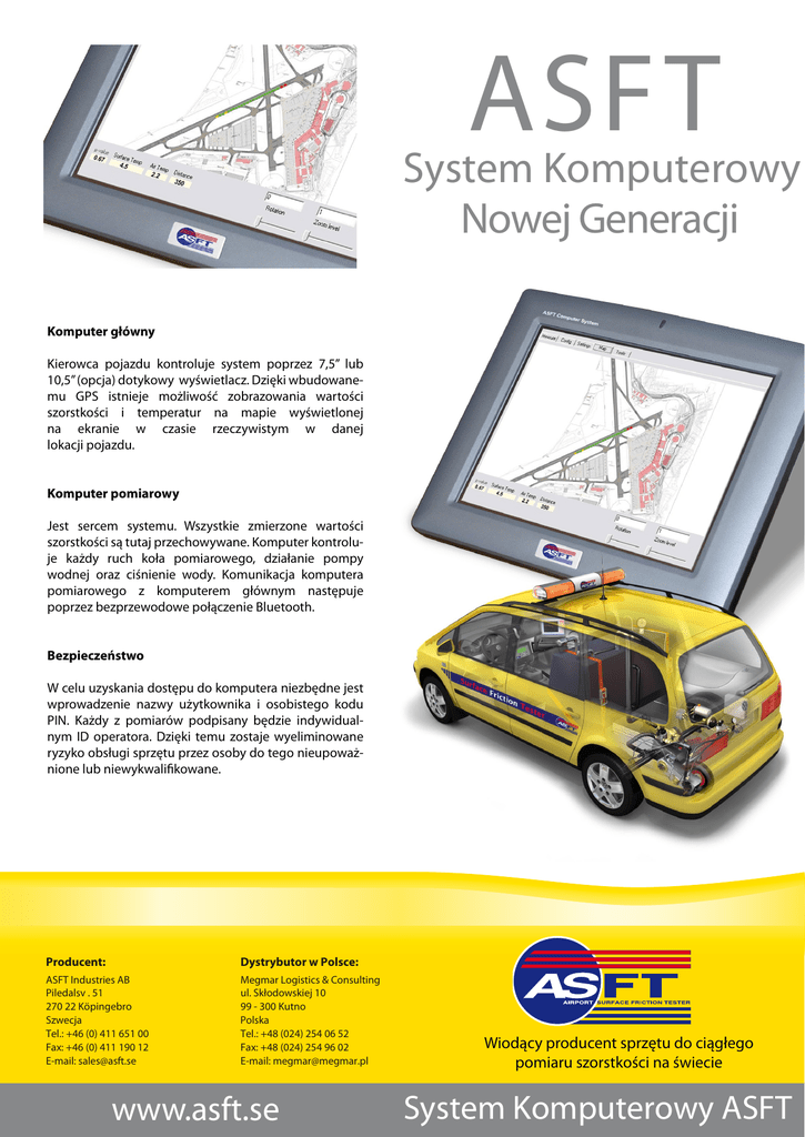 ASFT System Komputerowy Nowej Generacji Komputer główny Kierowca pojazdu kontroluje system poprzez 7,5” lub 10,5” (opcja) dotykowy wyświetlacz. Dzięki wbudowanemu GPS istnieje możliwość zobrazowania wartości szorstkości i temperatur na mapie wyświetlonej na ekranie w czasie rzeczywistym w danej lokacji pojazdu. Komputer pomiarowy Jest sercem systemu. Wszystkie zmierzone wartości szorstkości są tutaj przechowywane. Komputer kontroluje każdy ruch koła pomiarowego, działanie pompy wodnej oraz ciśnienie wody. Komunikacja komputera pomiarowego z komputerem głównym następuje poprzez bezprzewodowe połączenie Bluetooth. Bezpieczeństwo W celu uzyskania dostępu do komputera niezbędne jest wprowadzenie nazwy użytkownika i osobistego kodu PIN. Każdy z pomiarów podpisany będzie indywidualnym ID operatora. Dzięki temu zostaje wyeliminowane ryzyko obsługi sprzętu przez osoby do tego nieupoważnione lub niewykwalifikowane. Producent: Dystrybutor w Polsce: ASFT Industries AB Piledalsv . 51 270 22 Köpingebro Szwecja Tel.: +46 (0) 411 651 00 Fax: +46 (0) 411 190 12 E-mail: [email protected] Megmar Logistics & Consulting ul. Skłodowskiej 10 99 - 300 Kutno Polska Tel.: +48 (024) 254 06 52 Fax: +48 (024) 254 96 02 E-mail: [email protected] www.asft.se Wiodący producent sprzętu do ciągłego pomiaru szorstkości na świecie System Komputerowy ASFT Klienci Baza Danych (4) (5) (7) (6) Internet System pomiarowy Komputer pomiarowy (1) GPS Zbiornik na wodę Połączenie Bluetooth GPRS (3) Dotykowy wyświetlacz GPS, GPRS (2) Czujniki temperatur Wszystkie dane pochodzące z pomiaru tworzone są w komputerze pomiarowym (1) a następnie przez Bluetooth wysyłane do komputera głównego (2), gdzie są przechowywane i przekazywane do Bazy Danych (4). Tam tworzona jest i przechowywana kopia zapasowa każdego pojedynczego pomiaru oraz przekazywana wszystkim autoryzowanym klientom (5, 6, 7) do obejrzenia na dowolnym komputerze w czasie rzeczywistym lub później. System komputerowy NG System komputerowy Nowej Generacji firmy ASFT jest połączeniem dotychczas zdobytej przez nas wiedzy na temat pomiarów szorstkości i najnowszych technologii w taki sposób, by obsługa i administrowanie pomiarami były łatwiejsze, szybsze i bezpieczniejsze. Dodaliśmy także funkcjonalność, jakiej można oczekiwać od systemu stworzonego w dzisiejszych czasach. Głównym założeniem dla systemu NG było zapewnienie możliwości: • użycia standardowych, niezawodnych, sprawdzonych technik, • identyfikacji rezultatów pomiaru, • identyfikacji operatora, • szybkiego i łatwego montażu, • zapisu pozycji wskazanej przez GPS, • zdalnej obsługi monitora i pokazanie pomiaru w czasie rzeczywistym, • użycia 10,5” dotykowego wyświetlacza i systemu Windows. Podstawowe funkcje: • Identyfikacja operatora sprzętu związana z koniecznością wprowadzenia indywidualnej nazwy użytkownika i numeru PIN przed dokonaniem pomiaru • Ciągły pomiar szorstkości nawierzchni z wodą lub bez wody • Dane dotyczące pomiarów przechowywane w pojeździe w postaci pliku XML • Możliwość wysyłania danych pomiarowych poprzez e-mail prosto z pojazdu do innej lokalizacji • Możliwość stworzenia kopii zapasowej wprowadzonej konfiguracji nawierzchni • Ciągły zapis wyników pomiarów w każdej lokacji • Rzeczywisty czas pomiaru i dystans przechowywany w pojeździe Opcje: • Sprawdzanie w czasie rzeczywistym przez Internet wartości szorstkości oraz lokacji pojazdu (poprzez GPS) na dowolnym komputerze klienta • Odczyt dowolnych wcześniejszych pomiarów na komputerze klienta, znajdującym się w jakimkolwiek miejscu na świecie • Prowadzenie przez system statystyki oblodzenia nawierzchni, co pozwala na zmniejszenie ilości zużywanego płynu do odladzania • Dwa sensory temperatury (nawierzchni i powietrza) • Ciągły zapis wartości temperatur nawierzhni i powietrza dla każdej lokacji samochodu poprzez wbudowane urządzenie pomiarowe • e-SNOWTAM • Baza Danych zdalnie tworzy kopię zapasową konfiguracji zdefiniowanych typów nawierzchni