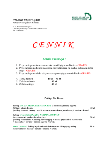 STUDIO URODY GABI Autoryzowany gabinet Bielendy ul. T. Rozwadowskiego 6 ( uliczka prowadząca do MOPS’u, obok I LO) Tel. 728345201 CENNIK Letnia Promocja ! 1. Przy zabiegu na twarz maseczka nawilŜająca na dłonie – GRATIS 2. Przy zabiegu pedicure maseczka rewitalizująca na suchą, pękającą skórę stóp - GRATIS 3. Przy zabiegu na ciało odŜywczo-regenerujący masaŜ dłoni – GRATIS 4. Tipsy Ŝelowe 5. śelki na dłonie 6. śelki na stopy 55 zł – 70 zł 45 zł 40 zł Zabiegi Na Twarz: Zabieg NA ZMARSZCZKI MIMICZNE z niebieską maską algową /lifting i odmłodzenie/ 60 zł /peeling + masaŜ twarzy i szyi + serum wprowadzone jonoforezą + maska + krem/ Zabieg OCZYSZCZAJĄCO-NORMALIZUJĄCY /oczyszczanie+ peeling kawitacyjny/ /peeling + maseczka + peeling kawitacyjny + masaŜ prądami d’ Arsonvalla + maseczka + serum + maska algowa + krem/ TOPP LIFTING Zabieg błyskawicznie i efektywnie liftingujący skórę /neutralizator, maska + serum + maska + krem/ 90 zł 90 zł LIFT&GO Zabieg SUPERLIFTINGUJĄCY dla skóry dojrzałej NOWOŚĆ!!! /ampułka + maska + ampułka wprowadzona sonofonezą + masaŜ twarzy i szyi + serum + maseczka/ 130 zł OGRÓD PRZYJEMNOŚCI Zabieg róŜano – piwoniowy NOWOŚĆ!!! /peeling + masaŜ twarzy i szyi + maska + maska algowa + serum + maska/ 140 zł WODOSPAD DLA SKÓRY Zabieg nawilŜający dla skóry przesuszonej 70 zł /peeling + masaŜ ( twarz, szyja, dekolt) + serum + maska algowa + serum + krem/ Zabieg ODMŁADZAJĄCY Z PLACENTĄ ROŚLINNĄ dla skóry dojrzałej /peeling + serum + maska algowa + krem/ 65 zł Zabieg KOJĄCO-NAPRAWCZY dla skóry wraŜliwej z popękanymi naczynkami – RóŜowa maska algowa CZERWONE WINO 65 zł /peeling + serum + maska algowa + krem/ Zabieg REWITALIZUJĄCY dla męŜczyzn /peeling + maska + serum + maska + krem/ 70 zł PŁATY KOLAGENOWE na twarz 55 zł PŁATKI KOLAGENOWE pod oczy /liftingujące, przeciwzmarszczkowe/ 20 zł MAGICZNE SPOJRZENIE Zabieg przeciwzmarszczkowy na okolice oczu /peeling + płatki kolagenowe + maska + serum + krem/ 40 zł Pozostałe Zabiegi Na Twarz: PEELING KAWITACYJNY /bezbolesne oczyszczanie/ /peeling + serum + krem/ 45 zł MASECZKI pielęgnacyjne + masaŜ 35 zł MASECZKI pielęgnacyjne + ampułka + masaŜ 42 zł ZŁUSZCZANIE KWASAMI /linia medyczna MEDIDERMA/ PROMOCJA!!! Pytaj o rabat przy serii zabiegów !! 90 zł Zabiegi Uzupełniające: Uzupełniające Oczyszczanie pleców 70 zł Oczyszczanie dekoltu 30 zł Henna brwi i rzęs + regulacja 17 zł Henna brwi ; rzęs 7 zł Regulacja 6 zł Trwała na rzęsy 38 zł Zabiegi Na Ciało: /peeling + maska + serum + masaŜ + krem/ GORĄCZKA ZŁOTA- Zabieg odmładzający i rozświetlający / maska ze złotem i glinką Ghassoul/ Częściowy 90 zł-130 zł 55 zł- 90 zł MORSKA KURACJA-Zabieg wyszczuplający i redukujący cellulit Częściowy 80 zł-130 zł 50 zł- 90 zł CZERWONE WINO- Zabieg odmładzająco-ujedrniający Częściowy 80 zł-130 zł 50 zł- 90 zł PEELING całego ciała + balsam Częściowy 40 zł 25 zł Manicure i Pedicure JEDWABNE DŁONIE OdŜywczo-regenerujący zabieg parafinowy na dłonie 30 zł Manicure Biologiczny + malowanie + frencz + zdobienie 20 zł 10 zł 15 zł 20 zł Manicure CąŜkowy 25 zł Manicure na Ciepło 26 zł Manicure deLuxe /peeling + maska/parafina/masaŜ + manicure/ 50 zł Zabieg parafinowy + manicure 40 zł Zabieg parafinowy /peeling + parafina + krem/ 20 zł Pedicure Frezarką + malowanie + french + zdobienie 50 zł 10 zł 15 zł 20 zł FLASH PEDICURE 25 zł AKSAMITNE STOPY /zabieg parafinowy + pedicure/ 65 zł SPECJALISTYCZNA PIELĘGNACJA STÓP Pedicure leczniczy Usunięcie modzeli Usunięcie odcisków ZałoŜenie klamry 70 zł 10-20 zł / szt. 15 zł / szt. 45 zł / szt. Tipsy Tipsy Korekta Uzupełnienie Odnowa Ściągnięcie tipsów śelki na stopach śelki na dłonie Spiłowanie Ŝelu 60-80 zł 20 zł 30 - 35 zł 45 zł 26 zł 40 - 45 zł 45 – 50 zł 10 zł MasaŜe Ciała MasaŜ relaksacyjny – odpręŜenie, regeneracja 65 zł - 60 min MasaŜ ciepłym olejkiem ALGAMARINA – relaks, rewitalizacja 65 zł - 60 min MasaŜ wspomagający odchudzanie 120 zł - 60 min MasaŜ pleców 35 zł - 30 min MasaŜ odprowadzający- ułatwiający odpływ limfy Częściowy 70 zł - 60 min 35 zł MasaŜ dłoni lub stóp 20 zł - 20 min MasaŜ: twarz, szyja, dekolt 30 zł - 30 min MasaŜ Bańką Chińską Częściowy 65 zł - 60 min 35 zł - 30 min Czekoladowa Euforia – masaŜ ciepłą czekoladą Chocolate MasaŜ 150 zł – 120 min 100 zł – 80 min Depilacja Woskiem Nogi Nogi + bikini Łydki Uda Rąk /przedramię/ Bikini Pach Wąsik; broda; baczki; brwi 60 zł 70 zł 30 zł 30 zł 30 zł 15 zł-25 zł 15 zł 7 zł Wykonujemy zabiegi na produktach firm: BIELENDA , DERMIKA , CLARENA , GEHWOL. Oferujemy talony podarunkowe oraz karnety dla stałych klientów Godziny otwarcia: pon. - pt. 10 - 18 Specjalna aura stworzona podczas zabiegu – blask świec, łagodna muzyka, unoszące się aromaty, podgrzewany fotel, sprawią, Ŝe zabieg stanie się czasem odpoczynku, czasem dla siebie. Zapraszamy ∞∞∞∞∞∞∞∞∞∞∞∞∞∞∞∞∞∞∞∞∞∞∞∞∞∞∞∞∞∞∞∞∞∞∞∞ Wynajmę pomieszczenie o powierzchni ok. 20