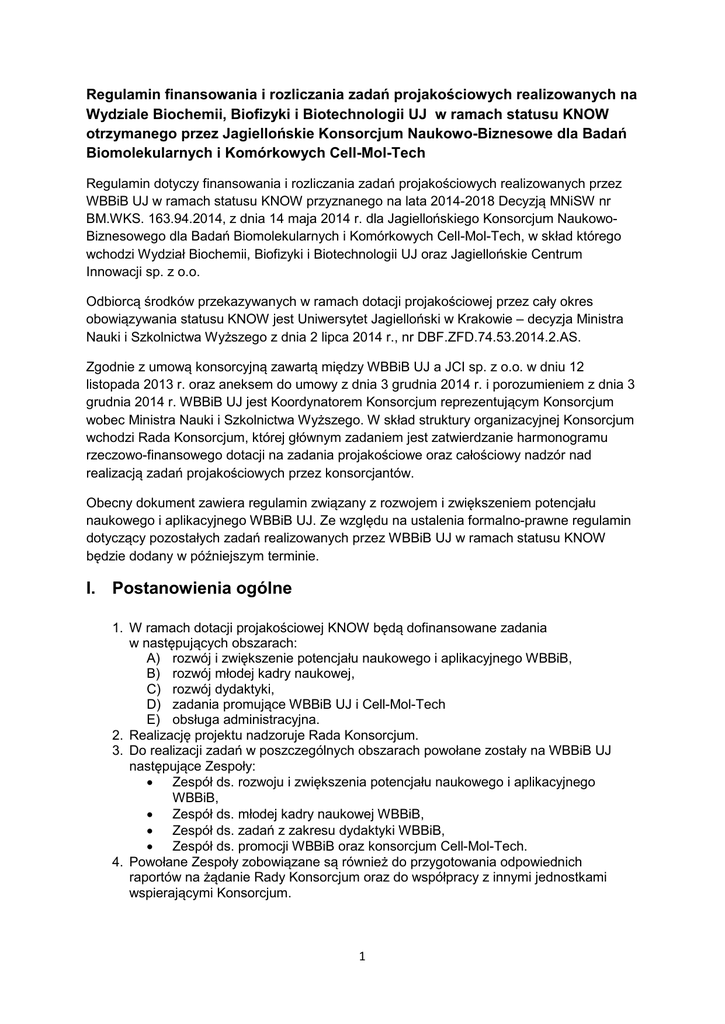 Regulamin finansowania i rozliczania zadań projakościowych realizowanych na Wydziale Biochemii, Biofizyki i Biotechnologii UJ w ramach statusu KNOW otrzymanego przez Jagiellońskie Konsorcjum Naukowo-Biznesowe dla Badań Biomolekularnych i Komórkowych Cell-Mol-Tech Regulamin dotyczy finansowania i rozliczania zadań projakościowych realizowanych przez WBBiB UJ w ramach statusu KNOW przyznanego na lata 2014-2018 Decyzją MNiSW nr BM.WKS. 163.94.2014, z dnia 14 maja 2014 r. dla Jagiellońskiego Konsorcjum NaukowoBiznesowego dla Badań Biomolekularnych i Komórkowych Cell-Mol-Tech, w skład którego wchodzi Wydział Biochemii, Biofizyki i Biotechnologii UJ oraz Jagiellońskie Centrum Innowacji sp. z o.o. Odbiorcą środków przekazywanych w ramach dotacji projakościowej przez cały okres obowiązywania statusu KNOW jest Uniwersytet Jagielloński w Krakowie – decyzja Ministra Nauki i Szkolnictwa Wyższego z dnia 2 lipca 2014 r., nr DBF.ZFD.74.53.2014.2.AS. Zgodnie z umową konsorcyjną zawartą między WBBiB UJ a JCI sp. z o.o. w dniu 12 listopada 2013 r. oraz aneksem do umowy z dnia 3 grudnia 2014 r. i porozumieniem z dnia 3 grudnia 2014 r. WBBiB UJ jest Koordynatorem Konsorcjum reprezentującym Konsorcjum wobec Ministra Nauki i Szkolnictwa Wyższego. W skład struktury organizacyjnej Konsorcjum wchodzi Rada Konsorcjum, której głównym zadaniem jest zatwierdzanie harmonogramu rzeczowo-finansowego dotacji na zadania projakościowe oraz całościowy nadzór nad realizacją zadań projakościowych przez konsorcjantów. Obecny dokument zawiera regulamin związany z rozwojem i zwiększeniem potencjału naukowego i aplikacyjnego WBBiB UJ. Ze względu na ustalenia formalno-prawne regulamin dotyczący pozostałych zadań realizowanych przez WBBiB UJ w ramach statusu KNOW będzie dodany w późniejszym terminie. I. Postanowienia ogólne 1. W ramach dotacji projakościowej KNOW będą dofinansowane zadania w następujących obszarach: A) rozwój i zwiększenie potencjału naukowego i aplikacyjnego WBBiB, B) rozwój młodej kadry naukowej, C) rozwój dydaktyki, D) zadania promujące WBBiB UJ i Cell-Mol-Tech E) obsługa administracyjna. 2. Realizację projektu nadzoruje Rada Konsorcjum. 3. Do realizacji zadań w poszczególnych obszarach powołane zostały na WBBiB UJ następujące Zespoły: • Zespół ds. rozwoju i zwiększenia potencjału naukowego i aplikacyjnego WBBiB, • Zespół ds. młodej kadry naukowej WBBiB, • Zespół ds. zadań z zakresu dydaktyki WBBiB, • Zespół ds. promocji WBBiB oraz konsorcjum Cell-Mol-Tech. 4. Powołane Zespoły zobowiązane są również do przygotowania odpowiednich raportów na żądanie Rady Konsorcjum oraz do współpracy z innymi jednostkami wspierającymi Konsorcjum. 1 5. Za koordynację i nadzór nad zadaniami realizowanymi w ramach dotacji KNOW odpowiedzialna jest Komisja WBBiB UJ ds. wydatkowania środków z dotacji KNOW powołana zgodnie z uchwałą Rady Wydziału z dnia 9 grudnia 2014 r. 6. Regulamin aplikowania o środki finansowe, ich rozliczanie w ramach poszczególnych obszarów dotacji KNOW wraz z odpowiednimi formularzami będą umieszczone na stronie internetowej Konsorcjum. 7. Beneficjenci programu KNOW zobowiązani są do wizualizacji skrótu KNOW podczas ustnych prezentacji wyników oraz do umieszczania w prezentacjach plakatowych i publikacjach niżej zamieszczonej formuły, odpowiednio w języku angielskim: Faculty of Biochemistry, Biophysics and Biotechnology of Jagiellonian University is a partner of the Leading National Research Center (KNOW) supported by the Ministry of Science and Higher Education lub polskim: Wydział Biochemii, Biofizyki i Biotechnologii Uniwersytetu Jagiellońskiego jest członkiem Konsorcjum, które uzyskało status Krajowego Naukowego Ośrodka Wiodącego (KNOW). II. Zasady przyznawania finansowania A. ROZWÓJ I ZWIĘKSZENIE POTENCJAŁU NAUKOWEGO I APLIKACYJNEGO WBBiB UJ a. ZWIĘKSZENIE MOBILNOŚCI PRACOWNIKÓW WBBiB UJ i. Dofinansowanie wyjazdów na konferencje naukowe Kryteria przyznania środków: • • • • • • • kwota maksymalnego dofinansowania, o jaką można wnioskować to: 1 000 zł na wyjazd krajowy (ok. 10 wyjazdów rocznie) oraz 5 000 zł na wyjazd zagraniczny (ok. 12 wyjazdów rocznie); aplikować mogą jedynie pracownicy zatrudnieni na WBBiB UJ; aplikować można tylko raz do roku o dofinansowanie do jednej konferencji krajowej lub jednej konferencji zagranicznej, przy zastrzeżeniu, że tylko jeden pracownik z Zakładu/Pracowni może być beneficjentem w kategorii A.a.i.; w przypadku większej liczby zgłoszeń o dofinansowanie, pierwszeństwo będą miały zgłoszenia dla których streszczenie zostało zakwalifikowane do prezentacji ustnej lub posiadają zaproszenie do wygłoszenia wykładu, oraz zgłoszenia od młodszych pracowników naukowych (magistrów, doktorów). W następnej kolejności decydować będzie rodzaj konferencji naukowej i jej zasięg (zagraniczna/krajowa). W przypadku konferencji organizowanych w kraju pierwszeństwo w dofinansowaniu będą miały konferencje o zasięgu międzynarodowym; składanie wniosków o dofinansowanie będzie się odbywało w dwóch terminach w czasie, gdy WBBiB UJ jest beneficjentem programu KNOW: − do 28 lutego − do 30 października; w celu złożenia aplikacji należy wypełnić Formularz Zgłoszeniowy A1 dostarczając wszystkie wymagane informacje; pracownik, który uzyskał dofinansowanie musi rozliczyć wyjazd przedstawiając wypełniony Formularz Rozliczeniowy A2 wraz z wymaganymi załącznikami najpóźniej do 30 dni od daty powrotu z konferencji. ii. Dofinansowanie wyjazdów na szkolenia/warsztaty specjalistyczne 2 Kryteria przyznania środków: • • • • • • • • • kwota maksymalnego dofinansowania, o jaką można wnioskować to: 1 000 zł na wyjazd krajowy (ok. 10 wyjazdów rocznie) oraz 2 000 zł na wyjazd zagraniczny (ok. 10 wyjazdów rocznie); aplikować mogą jedynie pracownicy zatrudnieni na WBBiB 