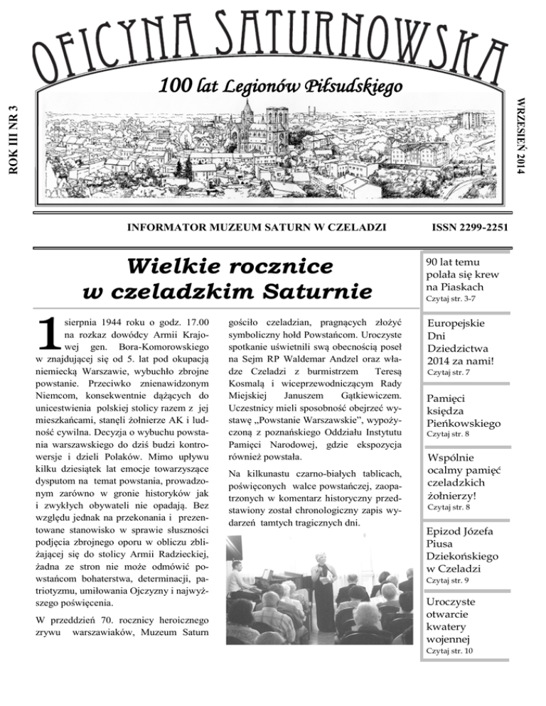 100 lat Legionów Piłsudskiego TOSHIBA ROK III NR 3 WRZESIEŃ 2014 Data wydania Na g łówe k a rty kułu w stępne go INFORMATOR MUZEUM SATURN W CZELADZI 1 Wielkie rocznice w czeladzkim Saturnie sierpnia 1944 roku o godz. 17.00 na rozkaz dowódcy Armii Krajowej gen. Bora-Komorowskiego w znajdującej się od 5. lat pod okupacją niemiecką Warszawie, wybuchło zbrojne powstanie. Przeciwko znienawidzonym Niemcom, konsekwentnie dążących do unicestwienia polskiej stolicy razem z jej mieszkańcami, stanęli żołnierze AK i ludność cywilna. Decyzja o wybuchu powstania warszawskiego do dziś budzi kontrowersje i dzieli Polaków. Mimo upływu kilku dziesiątek lat emocje towarzyszące dysputom na temat powstania, prowadzonym zarówno w gronie historyków jak i zwykłych obywateli nie opadają. Bez względu jednak na przekonania i prezentowane stanowisko w sprawie słuszności podjęcia zbrojnego oporu w obliczu zbliżającej się do stolicy Armii Radzieckiej, żadna ze stron nie może odmówić powstańcom bohaterstwa, determinacji, patriotyzmu, umiłowania Ojczyzny i najwyższego poświęcenia. W przeddzień 70. rocznicy heroicznego zrywu warszawiaków, Muzeum Saturn gościło czeladzian, pragnących złożyć symboliczny hołd Powstańcom. Uroczyste spotkanie uświetnili swą obecnością poseł na Sejm RP Waldemar Andzel oraz władze Czeladzi z burmistrzem Teresą Kosmalą i wiceprzewodniczącym Rady Miejskiej Januszem Gątkiewiczem. Uczestnicy mieli sposobność obejrzeć wystawę „Powstanie Warszawskie”, wypożyczoną z poznańskiego Oddziału Instytutu Pamięci Narodowej, gdzie ekspozycja również powstała. Na kilkunastu czarno-białych tablicach, poświęconych walce powstańczej, zaopatrzonych w komentarz historyczny przedstawiony został chronologiczny zapis wydarzeń tamtych tragicznych dni. ISSN 2299-2251 90 lat temu polała się krew na Piaskach Czytaj str. 3-7 Europejskie Dni Dziedzictwa 2014 za nami! Czytaj str. 7 Pamięci księdza Pieńkowskiego Czytaj str. 8 Wspólnie ocalmy pamięć czeladzkich żołnierzy! Czytaj str. 8 Epizod Józefa Piusa Dziekońskiego w Czeladzi Czytaj str. 9 Uroczyste otwarcie kwatery wojennej Czytaj str. 10 OFICYNA SATURNOWSKA wrzesień Wielkie rocznice w czeladzkim Saturnie Pamięć 63 dni sierpnia i września 1944 roku oraz żołnierzy, przele- wających w obronie każdego domu stolicy krew, mieszkańcy naszego miasta uczcili nie tylko swą obecnością ale przede wszystkim spontanicznym, wspólnym śpiewem piosenek powstańczych. W kolejnej edycji patriotycznego muzykowania „Dla Ciebie śpie- wam, Polsko!”, poruszająco i imponująco zabrzmiały Warszawskie Dzieci, Marsz Mokotowa i wiele innych doskonale znanych pieśni towarzyszących powstańczej Warszawie. Wspólne wykonywanie utworów gościom ułatwiały, przygotowane przez Muzeum na tę okoliczność śpiewniki oraz doświadczeni muzycy: Anna Piech (śpiew) i Tobiasz Nykamowicz (fortepian). Dokładnie miesiąc później 1 września br. czeladzki Saturn zorgani- zował uroczysty wieczór, upamiętniający kolejną tragiczną rocznicę z historii polskiego narodu - 75. lecie wybuchu drugiej wojny światowej. Głównym akcentem uroczystości był wernisaż dwóch wystaw opatrzonych wspólnym tytułem zaczerpniętym z jednej z nich „A więc wojna!!!”. Tytuł nawiązuje do słynnej wypowiedzi prezydenta Warszawy Stefana Starzyńskiego, wyemitowanej na antenie polskiego radia 1 września 1939 roku. Zdanie Starzyńskiego zapisało się w pamięci kolejnych pokoleń Polaków. Poruszało 75 lat temu, porusza i dzisiaj szczególnie w aktualnej sytuacji politycznej. Pierwsza z prezentowanych ekspozycji przygotowana przez Instytut Pamięci Narodowej w Lublinie przestawiała losy ludności cywilnej podczas wojny obronnej we wrześniu 1939 roku. Druga, bardziej lokalna, to wypożyczona z Muzeum Górnośląskiego w Bytomiu pt. „Górnośląskie i zagłębiowskie oddziały Wojska Polskiego w służbie Rzeczpospolitej w latach 1922 – 1939”. Niejako dopełnieniem tej drugiej był wykład skiego i Małopolski. Dr W. Moś pasjonat wojskowości, na co dzień pracownik bytomskiego Muzeum przybliżył nieznane fakty i cichych, często zapomnianych bohaterów naszego regionu z września ‘39 roku. Pomimo, że do końca 2014 roku pozostało zaledwie trzy miesiące, kalendarz ważnych rocznic przypadających w tym roku nie został jeszcze wyczerpany. Na listopad Muzeum przygotowuje uroczystości upamiętniające 96. rocznicę odzyskania niepodległości i 100. rocznicę powstania Legionów Polskich. Warto przypomnieć, że już w styczniu br. zawiązany został Zagłębiowski Komitet Obchodów 100. lecia Legionów Polski, a rok 2014 został ogłoszony Rokiem Legionów Polskich w Zagłębiu Dąbrowskim. Patronat honorowy nad uroczystościami, odbywającymi się w ramach Komitetu objęli wszyscy włodarze miast Zagłębia. Już dziś zapraszamy. Iwona Szaleniec dra Wojciecha Mosia opowiadający o pierwszych dniach wojny na terenach Śląska, Śląska Cieszyń2 OFICYNA SATURNOWSKA wrzesień 90 lat temu polała się krew na Piaskach W dzisiejszych czasach trudno wyobrazić sobie życie codzienne bez kontaktu z prasą. Postęp technologiczny sprawia jednak, iż oprócz tradycyjnej gazety coraz częściej przekonujemy się do e-prasy. Obie te formy pozostają w równym stopniu istotnym impulsem do kreowania własnych informacji i opinii. Choć, jak wiele innych pisanych źródeł historycznych, z łatwością mogą wpaść w pułapkę stronniczości czy nawet moralizatorstwa. Wszystkie fakty historyczne przedstawione w gazetach są opisywane z punktu widzenia dziennikarza, autora artykułu, który dokonał na swój subiektywny sposób oceny opisywanych przez siebie wydarzeń. Stąd tak ważna umiejętność rozsądnego interpretowania czasami sprzecznych ze sobą relacji o danej sprawie. W marcowym numerze „Oficyny Saturnowskiej” przedstawione zostały artykuły opublikowane w konserwatywnym dzie