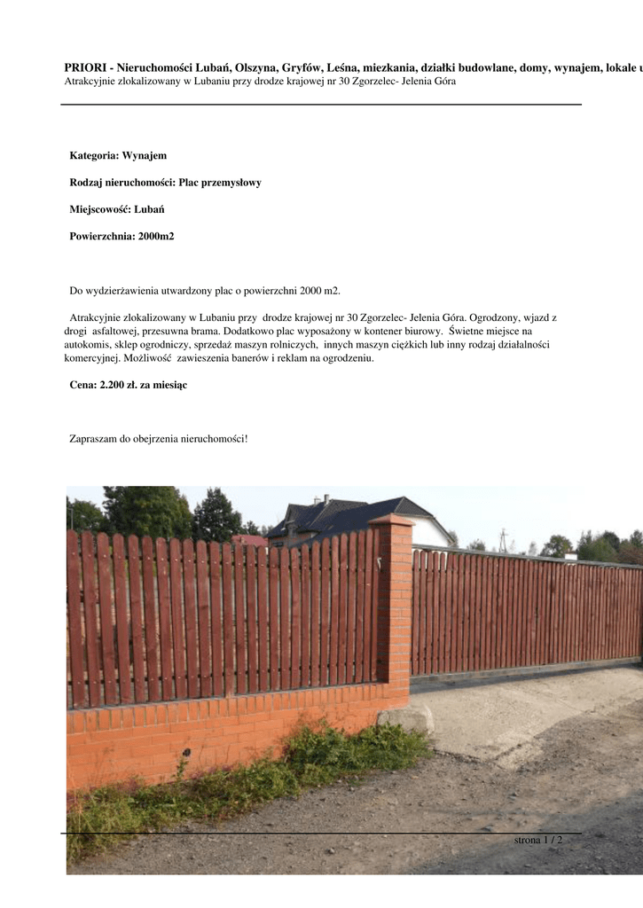 PRIORI - Nieruchomości Lubań, Olszyna, Gryfów, Leśna, miezkania, działki budowlane, domy, wynajem, lokale u Atrakcyjnie zlokalizowany w Lubaniu przy drodze krajowej nr 30 Zgorzelec- Jelenia Góra Kategoria: Wynajem Rodzaj nieruchomości: Plac przemysłowy Miejscowość: Lubań Powierzchnia: 2000m2 Do wydzierżawienia utwardzony plac o powierzchni 2000 m2. Atrakcyjnie zlokalizowany w Lubaniu przy drodze krajowej nr 30 Zgorzelec- Jelenia Góra. Ogrodzony, wjazd z drogi asfaltowej, przesuwna brama. Dodatkowo plac wyposażony w kontener biurowy. Świetne miejsce na autokomis, sklep ogrodniczy, sprzedaż maszyn rolniczych, innych maszyn ciężkich lub inny rodzaj działalności komercyjnej. Możliwość zawieszenia banerów i reklam na ogrodzeniu. Cena: 2.200 zł. za miesiąc Zapraszam do obejrzenia nieruchomości! strona 1 / 2 PRIORI - Nieruchomości Lubań, Olszyna, Gryfów, Leśna, miezkania, działki budowlane, domy, wynajem, lokale u Atrakcyjnie zlokalizowany w Lubaniu przy drodze krajowej nr 30 Zgorzelec- Jelenia Góra strona 2 / 2