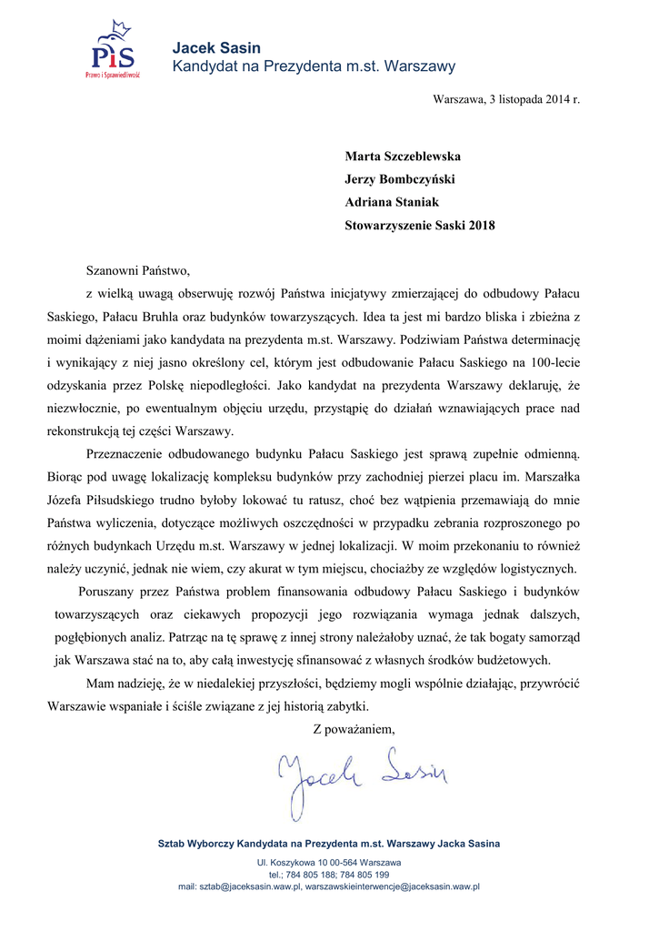 Jacek Sasin Kandydat na Prezydenta m.st. Warszawy Warszawa, 3 listopada 2014 r. Marta Szczeblewska Jerzy Bombczyński Adriana Staniak Stowarzyszenie Saski 2018 Szanowni Państwo, z wielką uwagą obserwuję rozwój Państwa inicjatywy zmierzającej do odbudowy Pałacu Saskiego, Pałacu Bruhla oraz budynków towarzyszących. Idea ta jest mi bardzo bliska i zbieżna z moimi dążeniami jako kandydata na prezydenta m.st. Warszawy. Podziwiam Państwa determinację i wynikający z niej jasno określony cel, którym jest odbudowanie Pałacu Saskiego na 100-lecie odzyskania przez Polskę niepodległości. Jako kandydat na prezydenta Warszawy deklaruję, że niezwłocznie, po ewentualnym objęciu urzędu, przystąpię do działań wznawiających prace nad rekonstrukcją tej części Warszawy. Przeznaczenie odbudowanego budynku Pałacu Saskiego jest sprawą zupełnie odmienną. Biorąc pod uwagę lokalizację kompleksu budynków przy zachodniej pierzei placu im. Marszałka Józefa Piłsudskiego trudno byłoby lokować tu ratusz, choć bez wątpienia przemawiają do mnie Państwa wyliczenia, dotyczące możliwych oszczędności w przypadku zebrania rozproszonego po różnych budynkach Urzędu m.st. Warszawy w jednej lokalizacji. W moim przekonaniu to również należy uczynić, jednak nie wiem, czy akurat w tym miejscu, chociażby ze względów logistycznych. Poruszany przez Państwa problem finansowania odbudowy Pałacu Saskiego i budynków towarzyszących oraz ciekawych propozycji jego rozwiązania wymaga jednak dalszych, pogłębionych analiz. Patrząc na tę sprawę z innej strony należałoby uznać, że tak bogaty samorząd jak Warszawa stać na to, aby całą inwestycję sfinansować z własnych środków budżetowych. Mam nadzieję, że w niedalekiej przyszłości, będziemy mogli wspólnie działając, przywrócić Warszawie wspaniałe i ściśle związane z jej historią zabytki. Z poważaniem, Sztab Wyborczy Kandydata na Prezydenta m.st. Warszawy Jacka Sasina Ul. Koszykowa 10 00-564 Warszawa tel.; 784 805 188; 784 805 199 mail: [email protected], [email protected]