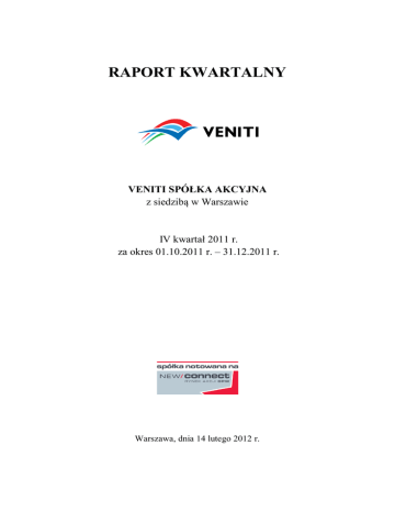 RAPORT KWARTALNY VENITI SPÓŁKA AKCYJNA z siedzibą w Warszawie IV kwartał 2011 r. za okres 01.10.2011 r. – 31.12.2011 r. Warszawa, dnia 14 lutego 2012 r. Raport kwartalny za IV kwartał 2011 r. Spis treści 1. Podstawowe informacje o Spółce ............................................................................................. 3 2. Organy spółki .......................................................................................................................... 3 2.1. Skład Zarządu Spółki na dzień 14.02.2012 r. ........................................................................ 3 2.2. Skład Rady Nadzorczej Spółki na dzień 14.02.2012 r. .......................................................... 3 3. Komentarz Zarządu Emitenta na temat czynników i zdarzeń, które miały wpływ na osiągnięte wyniki finansowe. ........................................................................................................................... 3 4. Informacja Zarządu Emitenta na temat aktywności, jaką w okresie objętym raportem Emitent podejmował w obszarze rozwoju prowadzonej działalności, w szczególności poprzez działania nastawione na wprowadzenie rozwiązań innowacyjnych w przedsiębiorstwie. ................................ 4 5. Wybrane dane finansowe ......................................................................................................... 5 5.1. Wybrane pozycje z bilansu na dzień 31 grudnia 2011 r. ........................................................ 5 5.2. Wybrane pozycje z rachunku zysków i strat ......................................................................... 5 6. Stanowisko odnośnie możliwości zrealizowania publikowanych w dokumencie informacyjnym prognoz wyników na lata 2011-2013 w świetle wyników zaprezentowanych w danym raporcie kwartalnym. .................................................................................................................................... 5 7. Oświadczenie Zarządu ............................................................................................................. 6 8. Dane teleadresowe spółki ......................................................................................................... 6 –1– Raport kwartalny za IV kwartał 2011 r. Szanowni Państwo, W imieniu Zarządu Spółki VENITI S.A. przekazuję na Państwa ręce raport kwartalny z działalności spółki za okres 01.10.2011 – 31.12.2011 r. Niniejszy dokument stanowi kompendium wiedzy na temat prowadzonej przez spółkę działalności. Przedstawia on również podstawowe dane finansowe za IV kwartał 2011 roku oraz analogiczne dane za rok 2010. Z wyrazami szacunku, Maciej Szymański Prezes Zarządu VENITI S.A. –2– Raport kwartalny za IV kwartał 2011 r. 1. Podstawowe informacje o Spółce VENITI S.A. rozpoczęła działalność w oparciu o portal Plażuj.pl, który w 2010 roku stał się liderem wynajmu nieruchomości wakacyjnych w Bułgarii i Chorwacji – z oferty firmy skorzystało wówczas ponad 5000 osób. W lipcu 2010 roku spółka przejęła dwa podmioty – firmę SAFPOL Travel – jeden z pięciu podmiotów w Polsce posiadający bezpośrednie umowy z liniami żeglugowymi, oraz firmę informatyczną INOVELTI. Na początku 2011 roku rozpoczęła działalność marka Incentive – EXCITERS Incentive Travel – organizator wyjazdów grupowych typu Incentive dla klientów biznesowych. W IV kwartale 2011 r. spółka uruchomiła portal KRUZY.PL będący pierwszą w Europie Środkowo-Wschodniej platformą sprzedaży rejsów online. 2. Organy spółki 2.1. Skład Zarządu Spółki na dzień 14.02.2012 r. Maciej Szymański Dariusz Matulka Prezes Zarządu Członek Zarządu 2.2. Skład Rady Nadzorczej Spółki na dzień 14.02.2012 r. dr Paweł Jarzyński Tomasz Dąbrowski Igor Herma Bogdan Kołakowski Dariusz Żuk Przewodniczący Rady Nadzorczej Wiceprzewodniczący Rady Nadzorczej Członek Rady Nadzorczej Członek Rady Nadzorczej Członek Rady Nadzorczej 3. Komentarz Zarządu Emitenta na temat czynników i zdarzeń, które miały wpływ na osiągnięte wyniki finansowe. Znaczący wpływ na osiągnięte wyniki finansowe spółki w 2011 roku miał sposób księgowania przychodów ze sprzedaży, wynikający z charakterystyki działalności spółki – sprzedaż imprez turystycznych. Zarząd spółki wyjaśnia, że w przypadku sprzedaży imprez turystycznych przychód księgowany jest w momencie rozpoczęcia danej imprezy, a nie w momencie jej sprzedaży. Wartość sprzedanych imprez w 2011 roku osiągnęła poziom 3 mln zł. Wpływ na wyniki finansowe spółki w raportowanym okresie miały prace związane z uruchomieniem portalu KRUZY.PL – pierwszej w Europie Środkowo-Wschodniej platformy umożliwiającej zakup rejsów wycieczkowych online. Spółka bardzo mocno zintensyfikowała prace, tak aby jak najszybciej uruchomić portal i rozpocząć jego komercjalizację. Od momentu uruchomienia w listopadzie 2011 roku portal KRUZY.PL wygenerował 0,1 mln przychodów, a spółka pozyskała ponad 30 agentów, którzy będą sprzedawać rejsy za pośrednictwem udostępnionej im platformy. –3– Raport kwartalny za IV kwartał 2011 r. Spółka podjęła szereg działań mających na celu wypromowanie marki EXCITERS Incentive Travel – liczne prezentacje i spotkania z potencjalnymi kontrahentami zaowocowały pierwszymi kontraktami na wyjazdy typu Incentive. Wartość podpisanych kontraktów w IV kwartale 2011 roku to 0,5 mln zł. Duże zainteresowanie ofertą ukazuje ogromny potencjał wzrostu spółki w tym segmencie działalności. W ocenie Zarządu znaczący wzrost zainteresowania ofertą spółki, w szczególności wyjazdami typu Incentive oraz prowadzone negocjacje z dużymi partnerami handlowymi w zakresie sprzedaży wyjazdów grupowych, a także uruchomienie portalu KRUZY.PL przyczynią się do realizacji planów finansowych spółki na lata 2012-2013. 4. Informacja Zarządu Emitenta na 