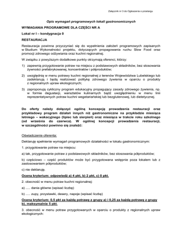 Załącznik nr 3 do Ogłoszenia o przetargu Opis wymagań programowych lokali gastronomicznych WYMAGANIA PROGRAMOWE DLA CZĘŚCI NR A Lokal nr I – kondygnacja 0 RESTAURACJA Restauracja powinna przyczyniać się do wypełnienia założeń programowych zapisanych w Studium Wykonalności projektu, dotyczących propagowania ruchu Slow Food oraz promocji zdrowego odżywiania oraz kuchni regionalnej. W związku z powyższym dodatkowe punkty otrzymają oferenci, którzy: 1) zapewnią przygotowanie potraw na miejscu z podstawowych składników, bez stosowania żywności prefabrykowanej, koncentratów i półproduktów; 2) uwzględnią w menu potrawy kuchni regionalnej z terenów Województwa Lubelskiego lub zadeklarują i będą realizować politykę zdrowego żywienia w oparciu o produkty z regionalnych upraw ekologicznych; 3) zaproponują cykliczny program edukacyjny propagujący zasady zdrowego żywienia, np. w formie degustacji, warsztatów kulinarnych bądź uwzględnieniu w menu linii reprezentatywnych potraw kuchni wegetariańskiej lub bezglutenowej, lub dietetycznej. Do oferty należy dołączyć ogólną koncepcję prowadzenia restauracji oraz przykładowy program działań innych niż gastronomiczne na przykładzie miesiąca letniego – wakacyjnego (lipiec lub sierpień) oraz miesiąca w trakcie roku szkolnego (od września do czerwca). W ogólnej koncepcji prowadzenia restauracji, w szczególności powinno się znaleźć: Oświadczenie oferenta: Deklaruję spełnienie wymagań programowych działalności w lokalu gastronomicznym: 1. przygotowanie potraw na miejscu: a) tak, przygotowanie potraw z podstawowych składników, bez stosowania półproduktów; b) częściowo – część produktów może być przygotowana wstępnie poza lokalem lub z zastosowaniem półproduktów; c) nie deklaruję. Ocena kryterium: odpowiedź a) 4 pkt, b) 2 pkt, c) 0 pkt. 2. obecność w menu potraw kuchni regionalnej: a) ..... dania główne (wpisać liczbę) b) ..... zupy, przystawki, desery, napoje (wpisać liczbę) Ocena kryterium: 0,5 pkt za każdą potrawę z grupy a) i 0,25 za każdą potrawę z grupy b), maksymalnie 5 pkt. 3. obecność w menu potraw przygotowanych w oparciu o produkty z regionalnych upraw ekologicznych: Załącznik nr 3 do Ogłoszenia o przetargu a) ..... dania główne (wpisać liczbę) b) ..... zupy, przystawki, desery, napoje (wpisać liczbę) Ocena kryterium: 0,5 pkt za każdą potrawę z grupy a) i 0,25 za każdą potrawę z grupy b), maksymalnie 5 pkt. 4. za zaproponowanie cyklicznego program edukacyjny propagujący zasady zdrowego żywienia zostanie przyznany 1 pkt. 5. Ocena programu działań innych niż gastronomiczne na przykładzie miesiąca letniego – wakacyjnego (lipiec lub sierpień) oraz miesiąca w trakcie roku szkolnego (od września do czerwca) – od 0 do 5 pkt. WYMAGANIA PROGRAMOWE DLA CZĘŚCI NR B, C, D LOKAL nr II – kondygnacja 0 BISTRO (LOKAL SZYBKIEJ OBSŁUGI) Założeniem bistro jest zapewnienie szybkiej i dostępnej cenowo obsługi gastronomicznej dla gości i wizytujących CSK, a także dla personelu CSK i personelu działających w nim instytucji. Wymogi, które muszą być spełnione przez najemcę: a) obecność w ofercie co najmniej: - 5 rodzajów kanapek lub przekąsek, w tym opcja wegetariańska, - 2 rodzajów zup, w tym opcja wegetariańska, - 3 rodzajów sałatek, b) wprowadzenie menu, które zapewni zróżnicowanie potraw w wybranej formule kuchni, np. zupy; c) czas oczekiwania na zamówienie – nie dłuższy niż 10 minut lub samoobsługa; d) oferowanie kawy parzonej w profesjonalnym ekspresie ciśnieniowym; e) oferowanie potraw i napojów na wynos; f) uzyskanie zezwolenia na sprzedaż alkoholi mało i średnio procentowych. W okresie letnim istnieje możliwość korzystania z całości lub części przestrzeni zewnętrznego patio od strony ul. Radziszewskiego w formie ogródka sezonowego. LOKAL nr III kondygnacja +1 LOUNGE BAR Bar przeznaczony jest jako miejsce spotkań, jak również do obsługi gastronomicznej uczestników wydarzeń kulturalnych. Powinien być czynny co najmniej na 2 godziny przed i po wydarzeniu odbywającym się w Sali Operowej lub Sali Kameralnej. Załącznik nr 3 do Ogłoszenia o przetargu Menu powinno obejmować napoje ciepłe i zimne, w tym alkoholowe, wymagany jest niewielki wybór deserów i drobnych przekąsek. LOKAL nr IV KAWIARNIA kondygnacja +4 Kawiarnia powinna stanowić przede wszystkim miejsce spotkań, jej oferta kulinarna powinna zawierać przede wszystkim bezalkoholowe napoje (ciepłe i zimne) desery oraz drobne przekąski. Dopuszcza się serwowanie napoi alkoholowych. Do oferty należy dołączyć ogólną koncepcję prowadzenia lokalu gastronomicznego oraz przykładowy program działań innych niż gastronomiczne na przykładzie miesiąca letniego – wakacyjnego (lipiec lub sierpień) oraz miesiąca w trakcie roku szkolnego (od września do czerwca). Ocena ww. dokumentów dokonana zostanie przez poszczególnych członków Komisji przetargowej w skali od 0 do 20 pkt.
