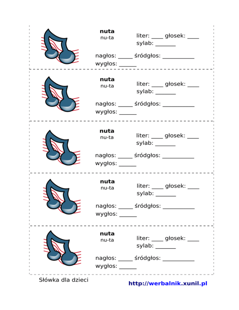 nuta nu-ta liter: ____ głosek: ____ sylab: _______ nagłos: _____ śródgłos: ___________ wygłos: ______ nuta nu-ta liter: ____ głosek: ____ sylab: _______ nagłos: _____ śródgłos: ___________ wygłos: ______ nuta nu-ta liter: ____ głosek: ____ sylab: _______ nagłos: _____ śródgłos: ___________ wygłos: ______ nuta nu-ta liter: ____ głosek: ____ sylab: _______ nagłos: _____ śródgłos: ___________ wygłos: ______ nuta nu-ta liter: ____ głosek: ____ sylab: _______ nagłos: _____ śródgłos: ___________ wygłos: ______ Słówka dla dzieci http://werbalnik.xunil.pl