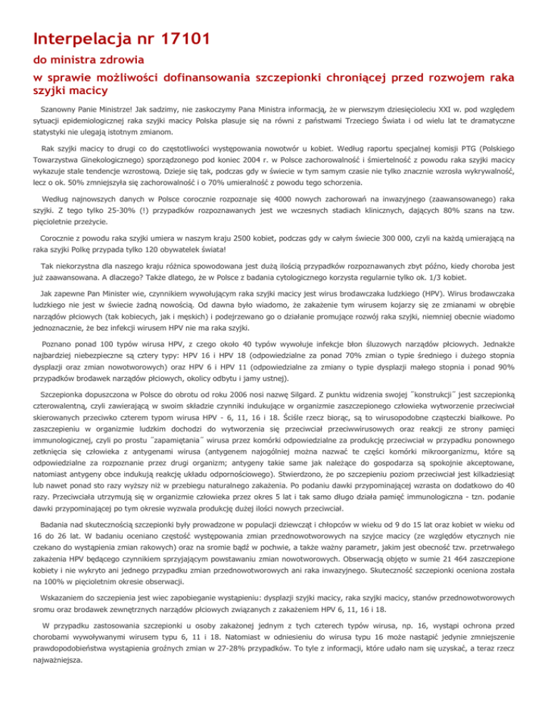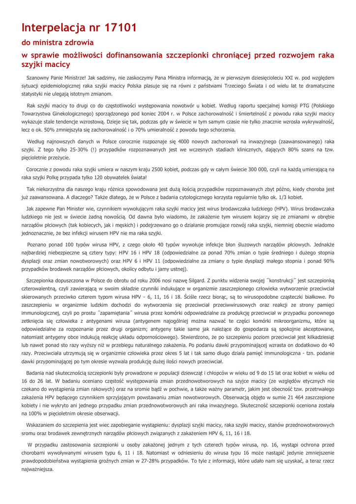 Interpelacja nr 17101 do ministra zdrowia w sprawie możliwości dofinansowania szczepionki chroniącej przed rozwojem raka szyjki macicy Szanowny Panie Ministrze! Jak sadzimy, nie zaskoczymy Pana Ministra informacją, że w pierwszym dziesięcioleciu XXI w. pod względem sytuacji epidemiologicznej raka szyjki macicy Polska plasuje się na równi z państwami Trzeciego Świata i od wielu lat te dramatyczne statystyki nie ulegają istotnym zmianom. Rak szyjki macicy to drugi co do częstotliwości występowania nowotwór u kobiet. Według raportu specjalnej komisji PTG (Polskiego Towarzystwa Ginekologicznego) sporządzonego pod koniec 2004 r. w Polsce zachorowalność i śmiertelność z powodu raka szyjki macicy wykazuje stale tendencje wzrostową. Dzieje się tak, podczas gdy w świecie w tym samym czasie nie tylko znacznie wzrosła wykrywalność, lecz o ok. 50% zmniejszyła się zachorowalność i o 70% umieralność z powodu tego schorzenia. Według najnowszych danych w Polsce corocznie rozpoznaje się 4000 nowych zachorowań na inwazyjnego (zaawansowanego) raka szyjki. Z tego tylko 25-30% (!) przypadków rozpoznawanych jest we wczesnych stadiach klinicznych, dających 80% szans na tzw. pięcioletnie przeżycie. Corocznie z powodu raka szyjki umiera w naszym kraju 2500 kobiet, podczas gdy w całym świecie 300 000, czyli na każdą umierającą na raka szyjki Polkę przypada tylko 120 obywatelek świata! Tak niekorzystna dla naszego kraju różnica spowodowana jest dużą ilością przypadków rozpoznawanych zbyt późno, kiedy choroba jest już zaawansowana. A dlaczego? Także dlatego, że w Polsce z badania cytologicznego korzysta regularnie tylko ok. 1/3 kobiet. Jak zapewne Pan Minister wie, czynnikiem wywołującym raka szyjki macicy jest wirus brodawczaka ludzkiego (HPV). Wirus brodawczaka ludzkiego nie jest w świecie żadną nowością. Od dawna było wiadomo, że zakażenie tym wirusem kojarzy się ze zmianami w obrębie narządów płciowych (tak kobiecych, jak i męskich) i podejrzewano go o działanie promujące rozwój raka szyjki, niemniej obecnie wiadomo jednoznacznie, że bez infekcji wirusem HPV nie ma raka szyjki. Poznano ponad 100 typów wirusa HPV, z czego około 40 typów wywołuje infekcje błon śluzowych narządów płciowych. Jednakże najbardziej niebezpieczne są cztery typy: HPV 16 i HPV 18 (odpowiedzialne za ponad 70% zmian o typie średniego i dużego stopnia dysplazji oraz zmian nowotworowych) oraz HPV 6 i HPV 11 (odpowiedzialne za zmiany o typie dysplazji małego stopnia i ponad 90% przypadków brodawek narządów płciowych, okolicy odbytu i jamy ustnej). Szczepionka dopuszczona w Polsce do obrotu od roku 2006 nosi nazwę Silgard. Z punktu widzenia swojej ˝konstrukcji˝ jest szczepionką czterowalentną, czyli zawierającą w swoim składzie czynniki indukujące w organizmie zaszczepionego człowieka wytworzenie przeciwciał skierowanych przeciwko czterem typom wirusa HPV - 6, 11, 16 i 18. Ściśle rzecz biorąc, są to wirusopodobne cząsteczki białkowe. Po zaszczepieniu w organizmie ludzkim dochodzi do wytworzenia się przeciwciał przeciwwirusowych oraz reakcji ze strony pamięci immunologicznej, czyli po prostu ˝zapamiętania˝ wirusa przez komórki odpowiedzialne za produkcję przeciwciał w przypadku ponownego zetknięcia się człowieka z antygenami wirusa (antygenem najogólniej można nazwać te części komórki mikroorganizmu, które są odpowiedzialne za rozpoznanie przez drugi organizm; antygeny takie same jak należące do gospodarza są spokojnie akceptowane, natomiast antygeny obce indukują reakcję układu odpornościowego). Stwierdzono, że po szczepieniu poziom przeciwciał jest kilkadziesiąt lub nawet ponad sto razy wyższy niż w przebiegu naturalnego zakażenia. Po podaniu dawki przypominającej wzrasta on dodatkowo do 40 razy. Przeciwciała utrzymują się w organizmie człowieka przez okres 5 lat i tak samo długo działa pamięć immunologiczna - tzn. podanie dawki przypominającej po tym okresie wyzwala produkcję dużej ilości nowych przeciwciał. Badania nad skutecznością szczepionki były prowadzone w populacji dziewcząt i chłopców w wieku od 9 do 15 lat oraz kobiet w wieku od 16 do 26 lat. W badaniu oceniano częstość występowania zmian przednowotworowych na szyjce macicy (ze względów etycznych nie czekano do wystąpienia zmian rakowych) oraz na sromie bądź w pochwie, a także ważny parametr, jakim jest obecność tzw. przetrwałego zakażenia HPV będącego czynnikiem sprzyjającym powstawaniu zmian nowotworowych. Obserwacją objęto w sumie 21 464 zaszczepione kobiety i nie wykryto ani jednego przypadku zmian przednowotworowych ani raka inwazyjnego. Skuteczność szczepionki oceniona została na 100% w pięcioletnim okresie obserwacji. Wskazaniem do szczepienia jest wiec zapobieganie wystąpieniu: dysplazji szyjki macicy, raka szyjki macicy, stanów przednowotworowych sromu oraz brodawek zewnętrznych narządów płciowych związanych z zakażeniem HPV 6, 11, 16 i 18. W przypadku zastosowania szczepionki u osoby zakażonej jednym z tych czterech typów wirusa, np. 16, wystąpi ochrona przed chorobami wywoływanymi wirusem typu 6, 11 i 18. Natomiast w odniesieniu do wirusa typu 16 może nastąpić jedynie zmniejszenie prawdopodobieństwa wystąpienia groźnych zmian w 27-28% przypadków. To tyle z informacji, które udało nam się uzyskać, a teraz rzecz najważniejsza. Szanowny Panie Ministrze! Mamy wiedzę, że wiele miast, miasteczek na podstawie przyjmowanych uchwał miejscowych dofinansowuje prowadzenie szczepień wśród dziewcząt w odpowiednim wieku. Jest to poparte wielomiesięcznymi przygotowaniami, uzyskiwaniem odpowiedniej dokumentacji, ale wiele gmin się tego nie zlękło i na to zdecydowało. Rozmawiałyśmy też z kilkoma prezydentami, burmistrzami i wójtami i wskazywali, że łatwiej byłoby im wyłożyć pieniądze z lokalnego budżetu, gdyby mieli także wsparcie w postaci dofinanso