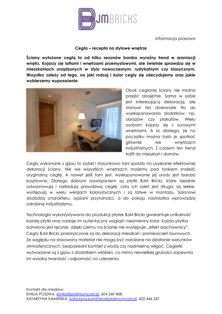 Informacja prasowa Cegła – recepta na stylowe wnętrze Ściany wyłożone cegłą to od kilku sezonów bardzo wyraźny trend w aranżacji wnętrz. Kojarzy się loftami i wnętrzami przemysłowymi, ale świetnie sprawdza się w mieszkaniach urządzonych w stylu nowoczesnym, rustykalnym czy klasycznym. Wszystko zależy od tego, na jaki rodzaj i kolor cegły się zdecydujemy oraz jakie wybierzemy wyposażenie. Obok ceglanej ściany nie można przejść obojętnie. Sama w sobie jest interesującą dekoracją, ale stanowi też doskonałe tło do wyeksponowania dodatków, np. obrazów czy plakatów. Wielu osobom kojarzy się z surowymi wnętrzami. A to dlatego, że na początku można było je spotkać głównie we wnętrzach industrialnych. Z czasem ten trend trafił do mieszkań i domów. Cegły wykonane z gipsu to szybki i stosunkowo tani sposób na uzyskanie efektownej dekoracji ściany. Nie we wszystkich wnętrzach możemy pod tynkiem znaleźć oryginalną cegłę. A nawet jeśli tam jest, wyeksponowanie jej urody jest bardzo kosztowne. Dlatego dobrym rozwiązaniem są płytki BJM Bricks, które idealnie odwzorowują i naśladują prawdziwą cegłę. Lista ich zalet jest długa: są lekkie, występują w wielu wersjach kolorystycznych i są łatwe w montażu. Salonowi dodadzą charakteru, sypialni przytulności, a do pokoju nastolatka wprowadzą odrobinę industrializmu. Technologia wykorzystywana do produkcji płytek BJM Bricks gwarantuje unikalność każdej płytki oraz nadaje im autentyczny wygląd i niezmienny kolor. Każda płytka barwiona jest ręcznie, dzięki czemu na ścianie nie występuje „efekt szachownicy”. Cegły BJM Bricks przeznaczone są do dekoracji mieszkań i pomieszczeń biurowych. Ze względu na stosowany materiał nie mogą być narażane na działanie warunków atmosferycznych, bezpośredni kontakt z wodą czy nadmierną wilgoć. Cegiełki wytwarzane są z gipsu z dodatkiem włókien, co mimo niewielkiej grubości zapewnia im wysoką twardość i odporność na uderzenia. Kontakt dla mediów: EMILIA POSZWA, [email protected], 604 240 408; KATARZYNA KAMIŃSKA, katarzyna.kamiń[email protected], 602 446 247 Cegiełki mają nieregularny kształt, dlatego wyglądają na ścianie autentycznie. Ich wymiary zawierają się w przedziałach od 6,5 cm do 7,2 cm wysokości i od 23 cm do 23,5 cm szerokości. Ich grubość wynosi 6-9 mm. W każdym opakowaniu znajduje się 7 elastycznych arkuszy z gipsowymi cegiełkami o wymiarach 85 cm x 30 cm każdy. Układanie cegiełek na arkuszach znacząco skraca czas i koszt montażu. Cegiełki ustawione są na arkuszach w tradycyjną mijankę przez co uzyskuje się wygląd ceglanego muru. Dla urozmaicenia wyglądu ściany, można je łamać podczas montażu i przyklejać jako połówki. Po zafugowaniu zaprawą cementową można je malować. Cegły występują w kilku wersjach kolorystycznych: białej, szarej, piaskowej, rudej i czerwonej. Na życzenie Klienta BJM Bricks może wykonać cegłę w dowolnym odcieniu. Cena: 55 zł/m2 - cegła biała, 60 zł/m2 - pozostałe kolory www.bjm-bricks.pl Produkty można zakupić przez stronę bjm-bricks.pl oraz najlepsze biura projektowe (lista biur dostępna na stronie internetowej) Kontakt dla mediów: EMILIA POSZWA, [email protected], 604 240 408; KATARZYNA KAMIŃSKA, katarzyna.kamiń[email protected], 602 446 247