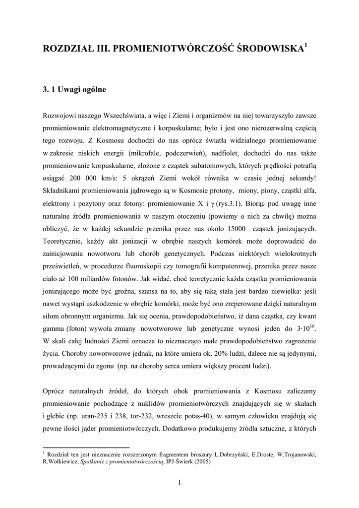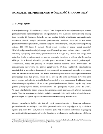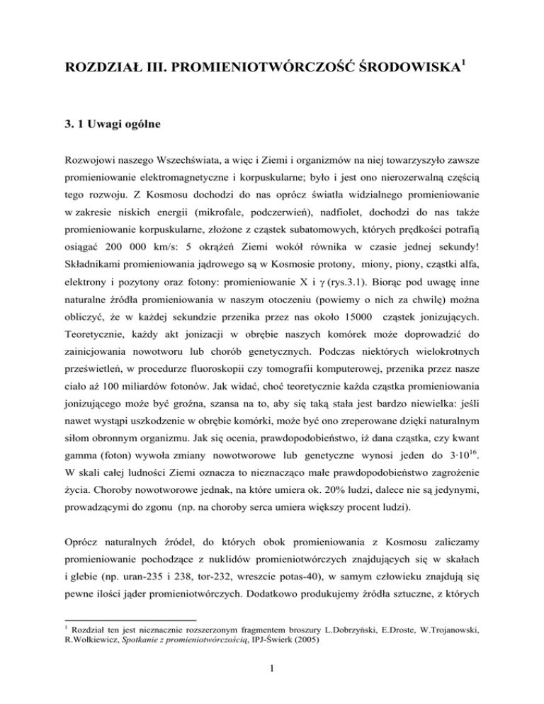 ROZDZIAŁ III. PROMIENIOTWÓRCZOŚĆ ŚRODOWISKA1 3. 1 Uwagi ogólne Rozwojowi naszego Wszechświata, a więc i Ziemi i organizmów na niej towarzyszyło zawsze promieniowanie elektromagnetyczne i korpuskularne; było i jest ono nierozerwalną częścią tego rozwoju. Z Kosmosu dochodzi do nas oprócz światła widzialnego promieniowanie w zakresie niskich energii (mikrofale, podczerwień), nadfiolet, dochodzi do nas także promieniowanie korpuskularne, złożone z cząstek subatomowych, których prędkości potrafią osiągać 200 000 km/s: 5 okrążeń Ziemi wokół równika w czasie jednej sekundy! Składnikami promieniowania jądrowego są w Kosmosie protony, miony, piony, cząstki alfa, elektrony i pozytony oraz fotony: promieniowanie X i γ (rys.3.1). Biorąc pod uwagę inne naturalne źródła promieniowania w naszym otoczeniu (powiemy o nich za chwilę) można obliczyć, że w każdej sekundzie przenika przez nas około 15000 cząstek jonizujących. Teoretycznie, każdy akt jonizacji w obrębie naszych komórek może doprowadzić do zainicjowania nowotworu lub chorób genetycznych. Podczas niektórych wielokrotnych prześwietleń, w procedurze fluoroskopii czy tomografii komputerowej, przenika przez nasze ciało aż 100 miliardów fotonów. Jak widać, choć teoretycznie każda cząstka promieniowania jonizującego może być groźna, szansa na to, aby się taką stała jest bardzo niewielka: jeśli nawet wystąpi uszkodzenie w obrębie komórki, może być ono zreperowane dzięki naturalnym siłom obronnym organizmu. Jak się ocenia, prawdopodobieństwo, iż dana cząstka, czy kwant gamma (foton) wywoła zmiany nowotworowe lub genetyczne wynosi jeden do 3·1016. W skali całej ludności Ziemi oznacza to nieznacząco małe prawdopodobieństwo zagrożenie życia. Choroby nowotworowe jednak, na które umiera ok. 20% ludzi, dalece nie są jedynymi, prowadzącymi do zgonu (np. na choroby serca umiera większy procent ludzi). Oprócz naturalnych źródeł, do których obok promieniowania z Kosmosu zaliczamy promieniowanie pochodzące z nuklidów promieniotwórczych znajdujących się w skałach i glebie (np. uran-235 i 238, tor-232, wreszcie potas-40), w samym człowieku znajdują się pewne ilości jąder promieniotwórczych. Dodatkowo produkujemy źródła sztuczne, z których 1 Rozdział ten jest nieznacznie rozszerzonym fragmentem broszury L.Dobrzyński, E.Droste, W.Trojanowski, R.Wołkiewicz, Spotkanie z promieniotwórczością, IPJ-Świerk (2005) 1 najbardziej znanymi są trzy: bomby jądrowe, reaktory jądrowe i źródła do terapii, w tym akceleratory medyczne. Choć takie źródła wnoszą wkład do ogólnego bilansu poziomu promieniowania, łatwo pokazać, że jest to wkład stosunkowo niewielki, jeśli porówna się go z poziomem tła, tj. promieniowaniem nas otaczającym, które ewidentnie nie powoduje znaczących szkód. 3.2 Promieniowanie naturalne wokół nas 3.2.1 Promieniowanie kosmiczne Jak mówiliśmy, W zewnętrznych pierwszym warstwach źródłem atmosfery promieniowania napotykamy jonizującego całe widmo jest Kosmos. promieniowania elektromagnetycznego: od widzialnego do wysokoenergetycznych kwantów gamma, a także intensywne, wysokoenergetyczne promieniowanie korpuskularne. Wyniki pomiarów wskazują, iż na półkuli północnej Ziemi i szerokości geograficznej powyżej 55o przez każdy centymetr kwadratowy przechodzi w ciągu godziny2 ok. 4500 protonów, 600 cząstek α, 30 jonów C, N i O, 8 jąder Mg, 3 wapnia i 1 żelaza. Wielkie energie cząstek promieniowania kosmicznego (od ok. 100 MeV do 1020 eV) są na szczęście znacznie wytracane w procesach zderzeń cząstek z jądrami i atomami atmosfery otaczającej Ziemię. W wyniku zderzeń wysokoenergetycznych protonów z jądrami dominujących w atmosferze ziemskiej atomów tlenu, czy azotu, powstają neutrony, protony, piony (zarówno obojętne π0, jak i naładowane π+ i π-), kaony i inne cząstki elementarne. Wysokoenergetyczne fotony (promienie gamma) mogą w obecności innych jąder przemienić się w parę elektron i pozyton (elektron dodatnio naładowany), piony rozpaść się na miony i neutrina, miony również nie są cząstkami trwałymi. Łączna dawka od promieniowania kosmicznego, to 0,3 – 0,6 mSv. 2 Wanda Leyko w „Biofizyka dla biologów”, pod red. M.Bryszewskiej i W.Leyko, PWN, Warszawa (1997), str. 418 2 GRANICA ATMOSFERY Rys. 3.1 Promieniowanie kosmiczne i jego składowe Promieniowanie kosmiczne docierające do atmosfery ziemskiej zawiera promieniowanie gamma, neutrony i inne cząstki, a dodatkowo – w wyniku oddziaływań z atmosferą tworzą się nowe pierwiastki, jak tryt, 7Be, 14C i 22Na. Promieniowanie kosmiczne zawiera także cząstki i promieniowanie elektromagnetyczne pochodzące ze Słońca. Wkład od nich jest jednak niewielki i zmienia się wraz z aktywnością Słońca. Ponieważ cząstki promieniowania kosmicznego niosą często ładunek elektryczny, ich ruch zależy od pola magnetycznego otaczającego Ziemię. Najsilniejszy wpływ tego pola widoczny jest na równiku, gdzie pole ziemskie odchyla tory cząstek znajdujących się stosunkowo wysoko nad Ziemią, podczas gdy w obszarach podbiegunowych ruch cząstek podąża stosunkowo blisko linii sił pola magnetycznego, pozwalając im wniknąć głębiej w atmosferę. W wyniku tego procesu dawka od neutronów na biegunach ziemskich jest relatywnie większa. Innym efektem wzbudzenia cząsteczek atmosfery jest zjawisko zorzy polarnej. 3 Rys. 3.2 Zależność dawki od wysokości nad poziomem morza Udział neutronów zmienia się z wysokością nad poziomem morza, co zasadniczo zmienia dawkę, jako że współczynnik jakości promieniowania wynosi tu 10 – 20. I tak wkład do dawki na poziomie morza wynosi ok. 0,3 mSv, podczas gdy na wysokości 1500 – 2000 m powyżej poziomu morza wzrasta niemal dwukrotnie. W górach, na wysokości 10 000 m dawka wzrasta dziesięciokrotnie, głównie dzięki udziałowi neutronów w prom