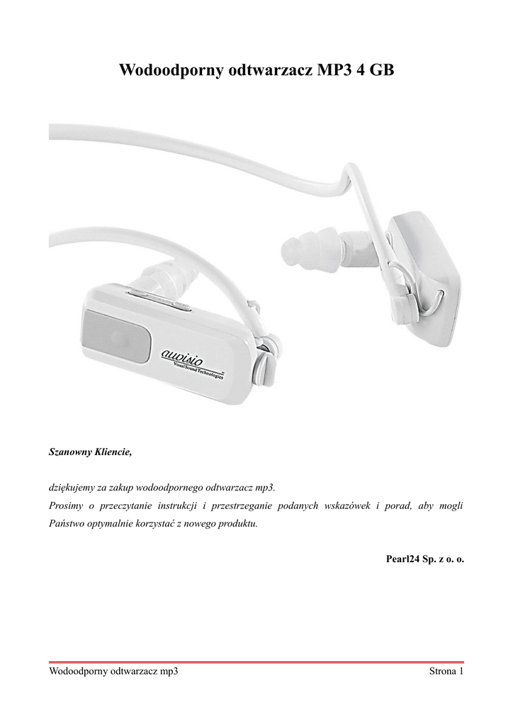 Wodoodporny odtwarzacz MP3 4 GB Szanowny Kliencie, dziękujemy za zakup wodoodpornego odtwarzacz mp3. Prosimy o przeczytanie instrukcji i przestrzeganie podanych wskazówek i porad, aby mogli Państwo optymalnie korzystać z nowego produktu. Pearl24 Sp. z o. o. Wodoodporny odtwarzacz mp3 Strona 1 Zawartość zestawu: • Odtwarzacz mp3 • Kabel USB • Wymienne nakładki silikonowe (zwykłe i do wody) • Instrukcja obsługi. Dane techniczne • Klasa ochrony IP: IPX8 • Wymiary: 124 x 33 x 150 mm • Waga: 22 g • Akumulator: litowy 180 mAh • Pamięć: 4 GB • Format muzyki: MP3. WMA • Format plików: FAT16 / FAT32 • MP3-Bitrate: 8 Kbps – 320 Kbps • WMA-Bitrate: 32 Kbps – 192 Kbps • Moc słuchawek: 5 mW + 5 mW • Zakres częstotliwości: 20 Hz – 20 KHz • Maksymalna głośność: ok. 70 db • Temperatura pracy: -5 ºC – 40 ºC. Wodoodporny odtwarzacz mp3 Strona 2 Użytkowanie Najpierw należy podłączyć odtwarzacz za pomocą kabla USB do wolnego portu USB w komputerze. Urządzenie zostanie automatycznie rozpoznane i zainstalowane. Teraz można przenieść pliki na odtwarzacz. Ładowanie Aby naładować odtwarzacz należy go podłączyć za pomocą kabla USB do komputera lub do zasilacza. Do pełnego naładowania potrzeba około 4 godzin. Użytkowanie w wodzie Przed korzystaniem z odtwarzacza w wodzie należy nałożyć pokrywę USB na złącze USB odtwarzacza i obrócić w prawo. Następnie należy nałożyć przeznaczone do wody nakładki silikonowe na słuchawki. Opis przycisków Przycisk Krótkie naciśnięcie Rozpoczęcie pauza Wodoodporny odtwarzacz mp3 odtwarzania Długie naciśnięcie / Włączanie odtwarzacza / wyłączanie Poprzedni utwór Szybkie przewijanie do tyłu Następny utwór Szybkie przewijanie do przodu Zwiększenie głośności Szybkie zwiększanie głośności Zmniejszenie głośności Szybkie zmniejszanie głośności Strona 3 Bezpieczeństwo • Niniejsza instrukcja ma na celu zapoznanie Państwa z zasadami prawidłowego korzystania z produktu. Zaleca się przechowywanie instrukcji w łatwo dostępnym miejscu, aby w razie potrzeby mogli Państwo zweryfikować informacje. • Należy korzystać z produktu w sposób do tego przeznaczony. Każde inne użycie może spowodować uszkodzenie produktu lub jego otoczenia. • Wszelkie modyfikacje produktu obniżają poziom jego bezpieczeństwa. UWAGA! Istnieje ryzyko obrażeń! • Nie należy rozkładać ani naprawiać urządzenia samodzielnie! • Zaleca się ostrożne obchodzenie się z produktem. Produkt może ulec uszkodzeniu w wyniku uderzenia, wstrząsów lub upadku nawet z niewielkiej wysokości. • Produkt należy trzymać z dala od wilgoci i wysokiej temperatury. • Nie należy zanurzać urządzenia w wodzie oraz innych płynach. • Wszelkie modyfikacje produktu obniżają poziom jego bezpieczeństwa. UWAGA! Istnieje ryzyko obrażeń! Ważne wskazówki dotyczące utylizacji Urządzenia elektrycznego nie zalicza się do odpadów gospodarstwa domowego. W celu właściwej utylizacji urządzenia należy skontaktować się z organizacją odpowiedzialną za zbiórkę elektroodpadów w wybranej miejscowości. Deklaracja zgodności Pearl Agency GmbH oświadcza, że produkt PX-2575 jest zgodny z zasadniczymi wymaganiami aktualnych wytycznych. Wodoodporny odtwarzacz mp3 Strona 4