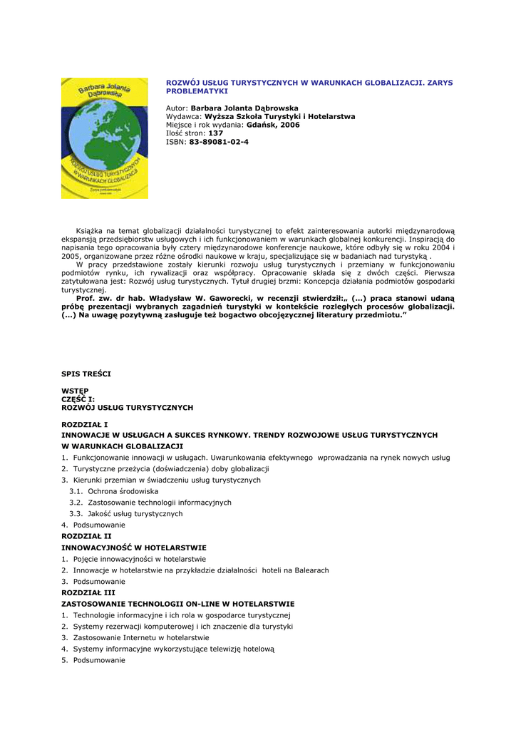 ROZWÓJ USŁUG TURYSTYCZNYCH W WARUNKACH GLOBALIZACJI. ZARYS PROBLEMATYKI Autor: Barbara Jolanta Dąbrowska Wydawca: WyŜsza Szkoła Turystyki i Hotelarstwa Miejsce i rok wydania: Gdańsk, 2006 Ilość stron: 137 ISBN: 83-89081-02-4 KsiąŜka na temat globalizacji działalności turystycznej to efekt zainteresowania autorki międzynarodową ekspansją przedsiębiorstw usługowych i ich funkcjonowaniem w warunkach globalnej konkurencji. Inspiracją do napisania tego opracowania były cztery międzynarodowe konferencje naukowe, które odbyły się w roku 2004 i 2005, organizowane przez róŜne ośrodki naukowe w kraju, specjalizujące się w badaniach nad turystyką . W pracy przedstawione zostały kierunki rozwoju usług turystycznych i przemiany w funkcjonowaniu podmiotów rynku, ich rywalizacji oraz współpracy. Opracowanie składa się z dwóch części. Pierwsza zatytułowana jest: Rozwój usług turystycznych. Tytuł drugiej brzmi: Koncepcja działania podmiotów gospodarki turystycznej. Prof. zw. dr hab. Władysław W. Gaworecki, w recenzji stwierdził:„ (...) praca stanowi udaną próbę prezentacji wybranych zagadnień turystyki w kontekście rozległych procesów globalizacji. (...) Na uwagę pozytywną zasługuje teŜ bogactwo obcojęzycznej literatury przedmiotu.” SPIS TREŚCI WSTĘP CZĘŚĆ I: ROZWÓJ USŁUG TURYSTYCZNYCH ROZDZIAŁ I INNOWACJE W USŁUGACH A SUKCES RYNKOWY. TRENDY ROZWOJOWE USŁUG TURYSTYCZNYCH W WARUNKACH GLOBALIZACJI 1. Funkcjonowanie innowacji w usługach. Uwarunkowania efektywnego wprowadzania na rynek nowych usług 2. Turystyczne przeŜycia (doświadczenia) doby globalizacji 3. Kierunki przemian w świadczeniu usług turystycznych 3.1. Ochrona środowiska 3.2. Zastosowanie technologii informacyjnych 3.3. Jakość usług turystycznych 4. Podsumowanie ROZDZIAŁ II INNOWACYJNOŚĆ W HOTELARSTWIE 1. Pojęcie innowacyjności w hotelarstwie 2. Innowacje w hotelarstwie na przykładzie działalności hoteli na Balearach 3. Podsumowanie ROZDZIAŁ III ZASTOSOWANIE TECHNOLOGII ON-LINE W HOTELARSTWIE 1. Technologie informacyjne i ich rola w gospodarce turystycznej 2. Systemy rezerwacji komputerowej i ich znaczenie dla turystyki 3. Zastosowanie Internetu w hotelarstwie 4. Systemy informacyjne wykorzystujące telewizję hotelową 5. Podsumowanie ROZDZIAŁ IV ATUTY LOGISTYCZNE I MARKETINGOWE OFERTY TURYSTYCZNEJ ON-LINE 1. Komunikacja rynkowa w turystyce 2. Promocja produktu turystycznego przy zastosowaniu środków multimedialnych i jej specyfika 3. Dystrybucja przy zastosowaniu środków multimedialnych i jej atrybuty logistyczne 4. Podsumowanie CZĘŚĆ II: KONCEPCJA DZIAŁANIA PODMIOTÓW GOSPODARKI TURYSTYCZNEJ ROZDZIAŁ V PRZEDSIĘBIORSTWO TURYSTYCZNE I JEGO OTOCZENIE W WARUNKACH GLOBALIZACJI. PROBLEMATYKA ZASOBÓW LUDZKICH 1. Rynek usług turystycznych - struktura podmiotowa i etapy rozwoju 2. Globalizacja a turystyka 3. Funkcjonowanie przedsiębiorstw turystycznych w warunkach globalizacji 4. Zatrudnienie w sektorze hoteli i restauracji i polityka kadrowa 5. Podsumowanie ROZDZIAŁ VI ALIANSE W SEKTORZE TURYSTYCZNYM 1. Istota aliansów 2. Alianse z bankami w sektorze turystycznym 3. Podsumowanie ROZDZIAŁ VII REGIONY JAKO PODMIOTY KONKURENCYJNEGO RYNKU TURYSTYCZNEGO 1. Istota konkurencji regionów turystycznych 2. Współpraca transgraniczna w dziedzinie turystyki 3. Współpraca transgraniczna w euroregionach: Nysa i Pomerania a rozwój turystyki 4. Podsumowanie BIBLIOGRAFIA SPIS TABEL SPIS RYSUNKÓW SPIS WYKRESÓW