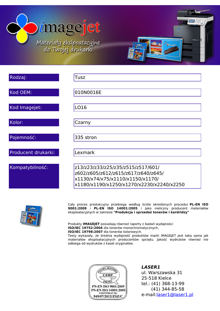 Rodzaj: Tusz Kod OEM: 010N0016E Kod Imagejet: LO16 Kolor: Czarny Pojemność: 335 stron Producent drukarki: Lexmark Kompatybilność: z13/z23/z33/z25/z35/z515/z517/601/ z602/z605/z612/z615/z617/z640/z645/ x1130/x74/x75/x1110/x1150/x1170/ x1180/x1190/x1250/x1270/x2230/x2240/x2250 Cały proces produkcyjny przebiega według ściśle określonych procedur PL-EN ISO 9001:2009 i PL-EN ISO 14001:2005 i jako nieliczny producent materiałów eksploatacyjnych w zakresie "Produkcja i sprzedaż tonerów i kardridzy" Produkty IMAGEJET posiadają również raporty z badań wydajności ISO/IEC 19752:2004 dla tonerów monochromatycznych. ISO/IEC 19798:2007 dla tonerów kolorowych. Testy wykazały, że średnia wydajność produktów marki IMAGEJET jest taka sama jak materiałów eksploatacyjnych producentów sprzętu. Jakość wydruków również nie odbiega od wydruków z kaset oryginałów. LASER1 ul. Warszawska 31 25-518 Kielce tel.: (41) 368-13-99 (41) 344-85-58 e-mail:[email protected] Powered by TCPDF (www.tcpdf.org)