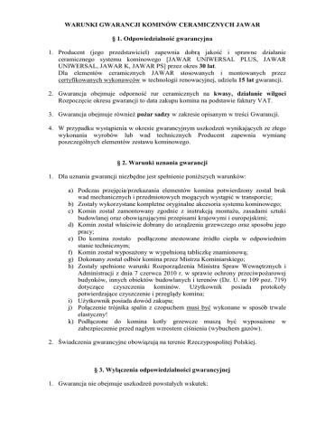 WARUNKI GWARANCJI KOMINÓW CERAMICZNYCH JAWAR § 1. Odpowiedzialność gwarancyjna 1. Producent (jego przedstawiciel) zapewnia dobrą jakość i sprawne działanie ceramicznego systemu kominowego [JAWAR UNIWERSAL PLUS, JAWAR UNIWERSAL, JAWAR K, JAWAR PS] przez okres 30 lat. Dla elementów ceramicznych JAWAR stosowanych i montowanych przez certyfikowanych wykonawców w technologii renowacyjnej, udziela 15 lat gwarancji. 2. Gwarancja obejmuje odporność rur ceramicznych na kwasy, działanie wilgoci Rozpoczęcie okresu gwarancji to data zakupu komina na podstawie faktury VAT. 3. Gwarancja obejmuje również pożar sadzy w zakresie opisanym w treści Gwarancji. 4. W przypadku wystąpienia w okresie gwarancyjnym uszkodzeń wynikających ze złego wykonania wyrobów lub wad technicznych Producent zapewnia wymianę poszczególnych elementów zestawu kominowego. § 2. Warunki uznania gwarancji 1. Dla uznania gwarancji niezbędne jest spełnienie poniższych warunków: a) Podczas przejęcia/przekazania elementów komina potwierdzony został brak wad mechanicznych i przedmiotowych mogących wystąpić w transporcie; b) Zostały wykorzystane kompletne oryginalne akcesoria systemu kominowego; c) Komin został zamontowany zgodnie z instrukcją montażu, zasadami sztuki budowlanej oraz obowiązującymi przepisami krajowymi i europejskimi; d) Komin został właściwie dobrany do urządzenia grzewczego oraz sposobu jego pracy; e) Do komina zostało podłączone atestowane źródło ciepła w odpowiednim stanie technicznym; f) Komin został wyposażony w wypełnioną tabliczkę znamionową; g) Dokonany został odbiór komina przez Mistrza Kominiarskiego; h) Zostały spełnione warunki Rozporządzenia Ministra Spraw Wewnętrznych i Administracji z dnia 7 czerwca 2010 r. w sprawie ochrony przeciwpożarowej budynków, innych obiektów budowlanych i terenów (Dz. U. nr 109 poz. 719) dotyczące czyszczenia kominów. Użytkownik posiada protokoły potwierdzające czyszczenie i przeglądy komina; i) Użytkownik posiada dowód zakupu; j) Połączenie trójnika spalin z czopuchem musi być wykonane w sposób trwale elastyczny! k) Podłączone do komina kotły grzewcze muszą być wyposażone w zabezpieczenie przed nagłym wzrostem ciśnienia (wybuchem gazów). 2. Świadczenia gwarancyjne obowiązują na terenie Rzeczypospolitej Polskiej. § 3. Wyłączenia odpowiedzialności gwarancyjnej 1. Gwarancja nie obejmuje uszkodzeń powstałych wskutek: a) stosowania komina niezgodnie z jego przeznaczeniem (inny rodzaj paliwa lub sposób pracy); b) przekroczenia dopuszczalnej temperatury pracy ciągłej; c) niewłaściwego obchodzenia się z towarem w czasie transportu; d) niewłaściwego montażu lub przeróbek; e) wybuchów gazów w kotle; f) zdarzeń losowych (np. trzęsienie ziemi, pożar, powódź, huragan, itp.). 2. Gwarancja nie obejmuje kosztów pośrednich lub bezpośrednich związanych z wymianą lub naprawą rur ceramicznych, np. czasowym odłączeniem instalacji grzewczej lub koniecznością wykwaterowania mieszkańców podczas naprawy komina itp., które pokrywa zgłaszający roszczenia z tytułu gwarancji. 3. Producent nie ponosi odpowiedzialności za zniszczenie komina powstałe wskutek pożaru sadzy. Odporność na pożar sadzy przewidziana w niniejszej Gwarancji oznacza jedynie, że pożar nie rozprzestrzeni się z przewodu kominowego na konstrukcję budynku. § 4. Proces reklamacyjny 1. Zgłoszenie reklamacji u dostawcy systemu kominowego JAWAR musi nastąpić niezwłocznie po odkryciu wady. 2. Zgłoszenie reklamacyjne musi zawierać: a) b) c) d) e) informację o rodzaju uszkodzenia i miejscu powstania szkody; dokumentację fotograficzną, umożliwiającą ocenę powstałych szkód; kopię dokumentu zakupu; kopię protokołu odbioru komina przez Mistrza Kominiarskiego; kopię ostatniego protokołu czyszczenia komina. 3. Czas rozpatrzenia reklamacji trwa 30 dni od daty pisemnego zgłoszenia reklamacji. Użytkownik zapewni Producentowi (przedstawicielowi Producenta) wgląd w dokumentację dotyczącą komina oraz możliwość osobistych oględzin reklamowanego komina. 4. Po pozytywnym rozpatrzeniu reklamacji Producent (jego przedstawiciel) wykona naprawę gwarancyjną w terminie 14 dni od daty uznania reklamacji. 5. Wymiana lub naprawa gwarancyjna wykonana będzie przez Producenta lub inny podmiot działający na jego zlecenie. 6. Dokonanie naprawy gwarancyjnej nie przywraca pełnego okresu gwarancji. 7. W przypadku stwierdzenia niesłusznej reklamacji, koszt przejazdu i delegacji pracowników serwisu gwarancyjnego Producenta ponosi zgłaszający roszczenia z tytułu gwarancji.