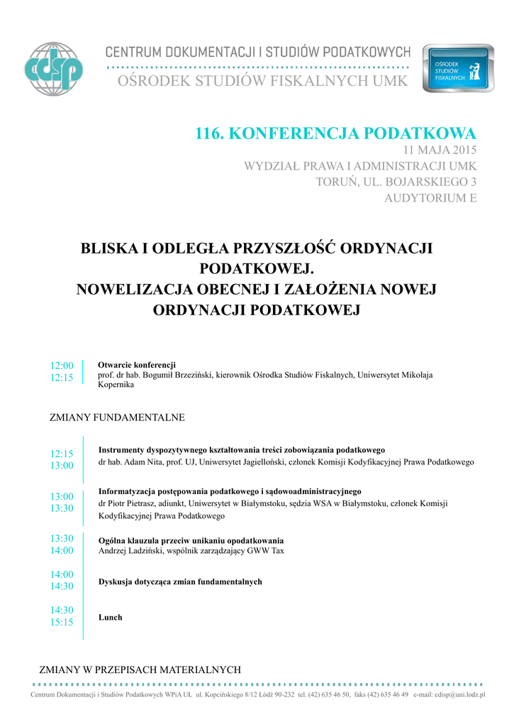 OŚRODEK STUDIÓW FISKALNYCH UMK 116. KONFERENCJA PODATKOWA 11 MAJA 2015 WYDZIAŁ PRAWA I ADMINISTRACJI UMK TORUŃ, UL. BOJARSKIEGO 3 AUDYTORIUM E BLISKA I ODLEGŁA PRZYSZŁOŚĆ ORDYNACJI PODATKOWEJ. NOWELIZACJA OBECNEJ I ZAŁOŻENIA NOWEJ ORDYNACJI PODATKOWEJ 12:00 12:15 Otwarcie konferencji prof. dr hab. Bogumił Brzeziński, kierownik Ośrodka Studiów Fiskalnych, Uniwersytet Mikołaja Kopernika ZMIANY FUNDAMENTALNE 12:15 13:00 Instrumenty dyspozytywnego kształtowania treści zobowiązania podatkowego dr hab. Adam Nita, prof. UJ, Uniwersytet Jagielloński, członek Komisji Kodyfikacyjnej Prawa Podatkowego 13:00 13:30 Informatyzacja postępowania podatkowego i sądowoadministracyjnego dr Piotr Pietrasz, adiunkt, Uniwersytet w Białymstoku, sędzia WSA w Białymstoku, członek Komisji Kodyfikacyjnej Prawa Podatkowego 13:30 14:00 Ogólna klauzula przeciw unikaniu opodatkowania Andrzej Ladziński, wspólnik zarządzający GWW Tax 14:00 14:30 Dyskusja dotycząca zmian fundamentalnych 14:30 15:15 Lunch ZMIANY W PRZEPISACH MATERIALNYCH Centrum Dokumentacji i Studiów Podatkowych WPiA UŁ ul. Kopcińskiego 8/12 Łódź 90-232 tel. (42) 635 46 50, faks (42) 635 46 49 e-mail: [email protected] 15:15 15:40 Interpretacje prawa podatkowego – rewolucja czy ewolucja ? dr hab. Wojciech Morawski, prof. UMK, Uniwersytet Mikołaja Kopernika, członek Rady Konsultacyjnej Prawa Podatkowego mgr Tomasz Janicki, doktorant, Uniwersytet Mikołaja Kopernika 15:40 16:00 Spadkobierca jako następca prawny podatnika – wybrane zagadnienia dr hab. Agnieszka Olesińska, adiunkt, Uniwersytet Mikołaja Kopernika, członek Komisji Kodyfikacyjnej Prawa Podatkowego 16:00 16:20 Odpowiedzialność wspólnika spółki osobowej za zaległości podatkowe dr Ewa Prejs, adiunkt, Uniwersytet Mikołaja Kopernika 16:20 16:40 Dyskusja dotycząca zmian w prawie materialnym ZMIANY PROCESOWE 16:40 17:00 17:00 17:20 Pełnomocnictwo dr Ireneusz Nowak, adiunkt, Uniwersytet Łódzki Wykonalność decyzji podatkowej dr Tomasz Nowak, adiunkt, Uniwersytet Łódzki, GWW Tax 17:20 17:40 Dyskusja dotycząca zmian procesowych 17:40 17:45 Zamknięcie konferencji Centrum Dokumentacji i Studiów Podatkowych WPiA UŁ ul. Kopcińskiego 8/12 Łódź 90-232 tel. (42) 635 46 50, faks (42) 635 46 49 e-mail: [email protected]