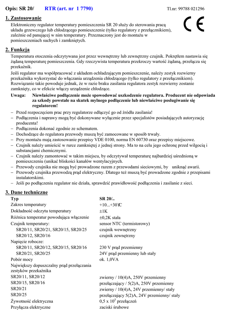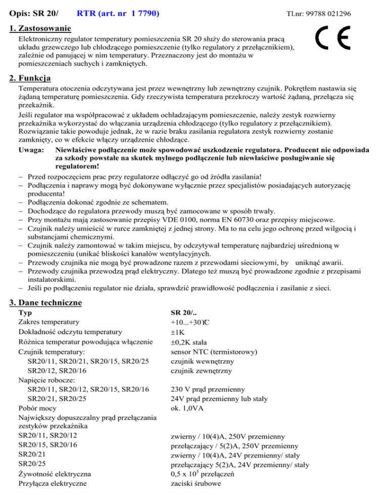 Opis: SR 20/ RTR (art. nr 1 7790) Tl.nr: 99788 021296 1. Zastosowanie Elektroniczny regulator temperatury pomieszczenia SR 20 służy do sterowania pracą układu grzewczego lub chłodzącego pomieszczenie (tylko regulatory z przełącznikiem), zależnie od panującej w nim temperatury. Przeznaczony jest do montażu w pomieszczeniach suchych i zamkniętych. 2. Funkcja Temperatura otoczenia odczytywana jest przez wewnętrzny lub zewnętrzny czujnik. Pokrętłem nastawia się żądaną temperaturę pomieszczenia. Gdy rzeczywista temperatura przekroczy wartość żądaną, przełącza się przekaźnik. Jeśli regulator ma współpracować z układem ochładzającym pomieszczenie, należy zestyk rozwierny przekaźnika wykorzystać do włączania urządzenia chłodzącego (tylko regulatory z przełącznikiem). Rozwiązanie takie powoduje jednak, że w razie braku zasilania regulatora zestyk rozwierny zostanie zamknięty, co w efekcie włączy urządzenie chłodzące. Uwaga: Niewłaściwe podłączenie może spowodować uszkodzenie regulatora. Producent nie odpowiada za szkody powstałe na skutek mylnego podłączenie lub niewłaściwe posługiwanie się regulatorem! − Przed rozpoczęciem prac przy regulatorze odłączyć go od źródła zasilania! − Podłączenia i naprawy mogą być dokonywane wyłącznie przez specjalistów posiadających autoryzację producenta! − Podłączenia dokonać zgodnie ze schematem. − Dochodzące do regulatora przewody muszą być zamocowane w sposób trwały. − Przy montażu mają zastosowanie przepisy VDE 0100, norma EN 60730 oraz przepisy miejscowe. − Czujnik należy umieścić w rurce zamkniętej z jednej strony. Ma to na celu jego ochronę przed wilgocią i substancjami chemicznymi. − Czujnik należy zamontować w takim miejscu, by odczytywał temperaturę najbardziej uśrednioną w pomieszczeniu (unikać bliskości kanałów wentylacyjnych. − Przewody czujnika nie mogą być prowadzone razem z przewodami sieciowymi, by uniknąć awarii. − Przewody czujnika przewodzą prąd elektryczny. Dlatego też muszą być prowadzone zgodnie z przepisami instalatorskimi. − Jeśli po podłączeniu regulator nie działa, sprawdzić prawidłowość podłączenia i zasilanie z sieci. 3. Dane techniczne Typ Zakres temperatury Dokładność odczytu temperatury Różnica temperatur powodująca włączenie Czujnik temperatury: SR20/11, SR20/21, SR20/15, SR20/25 SR20/12, SR20/16 Napięcie robocze: SR20/11, SR20/12, SR20/15, SR20/16 SR20/21, SR20/25 Pobór mocy Największy dopuszczalny prąd przełączania zestyków przekaźnika SR20/11, SR20/12 SR20/15, SR20/16 SR20/21 SR20/25 Żywotność elektryczna Przyłącza elektryczne SR 20/.. +10...+30°C ±1K ±0,2K stała sensor NTC (termistorowy) czujnik wewnętrzny czujnik zewnętrzny 230 V prąd przemienny 24V prąd przemienny lub stały ok. 1,0VA zwierny / 10(4)A, 250V przemienny przełączający / 5(2)A, 250V przemienny zwierny / 10(4)A, 24V przemienny/ stały przełączający 5(2)A, 24V przemienny/ stały 0,5 x 105 przełączeń zaciski śrubowe Najwyższa dopuszczalna temperatura pomieszczenia Obudowa: materiał stopień ochrony wymiary mocowanie doprowadzenie przewodów stopień ochrony klasa ochrony ciężar Wymiary -10...+50°C sztuczne tworzywo IP20 71 x 71 x 27mm naścienne lub w puszce podtynkowej natynkowe lub kryte IP30 II wg. VDE 0700 ok. 90 g Schemat podłączenia Zastrzega się prawo wprowadzania zmian. Zgodnie z przepisami ustawy z dnia 29 lipca 2005 r. o zużytym sprzęcie elektronicznym zabronione jest umieszczanie łącznie z innymi odpadami zużytego sprzętu oznakowanego symbolem przekreślonego kosza. Użytkownik, który zamierza pozbyć się produktu, jest zobowiązany do oddania zużytego sprzętu elektronicznego lub elektrycznego do punktu zbierania zużytego sprzętu. Punkty zbierania prowadzone są m. in. przez sprzedawców hurtowych i detalicznych tego sprzętu oraz przez gminne jednostki organizacyjne prowadzące działalność w zakresie odbierania odpadów.